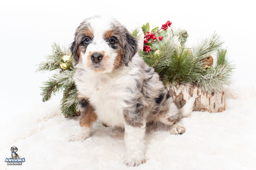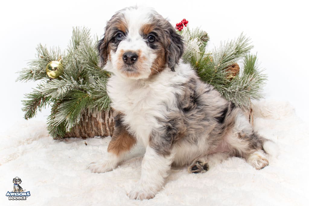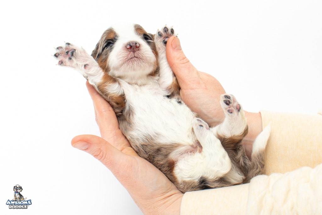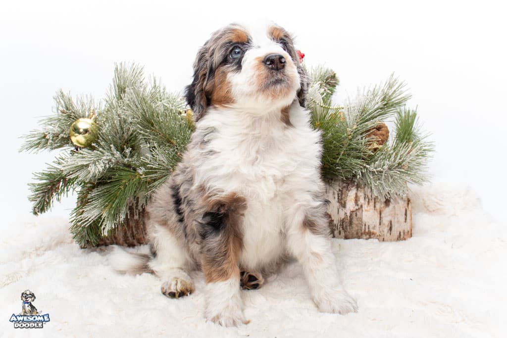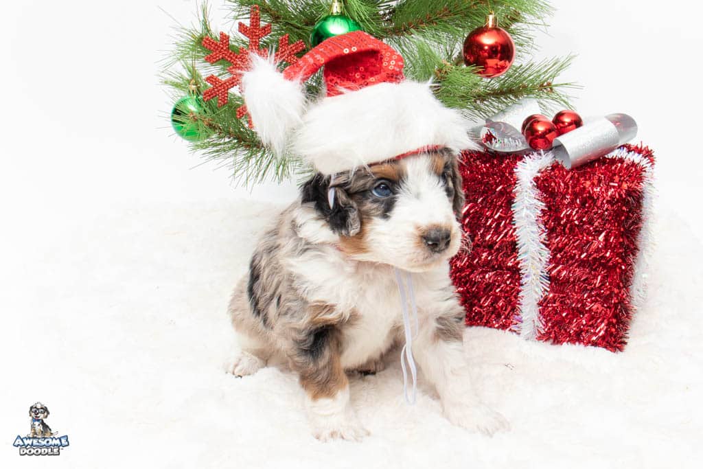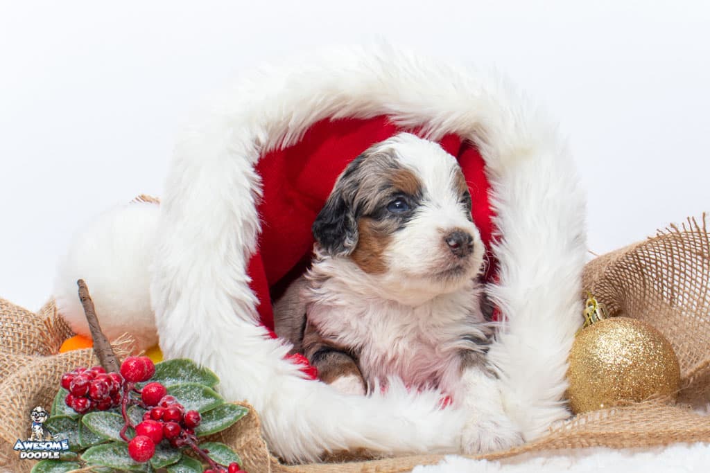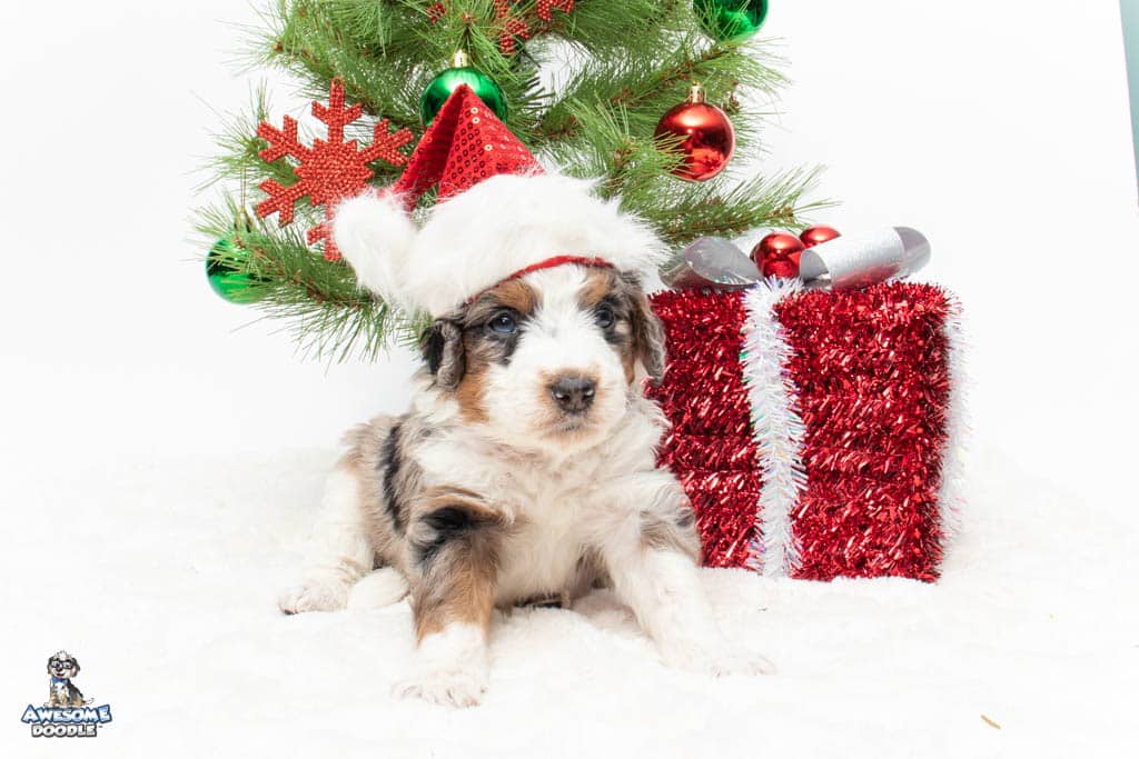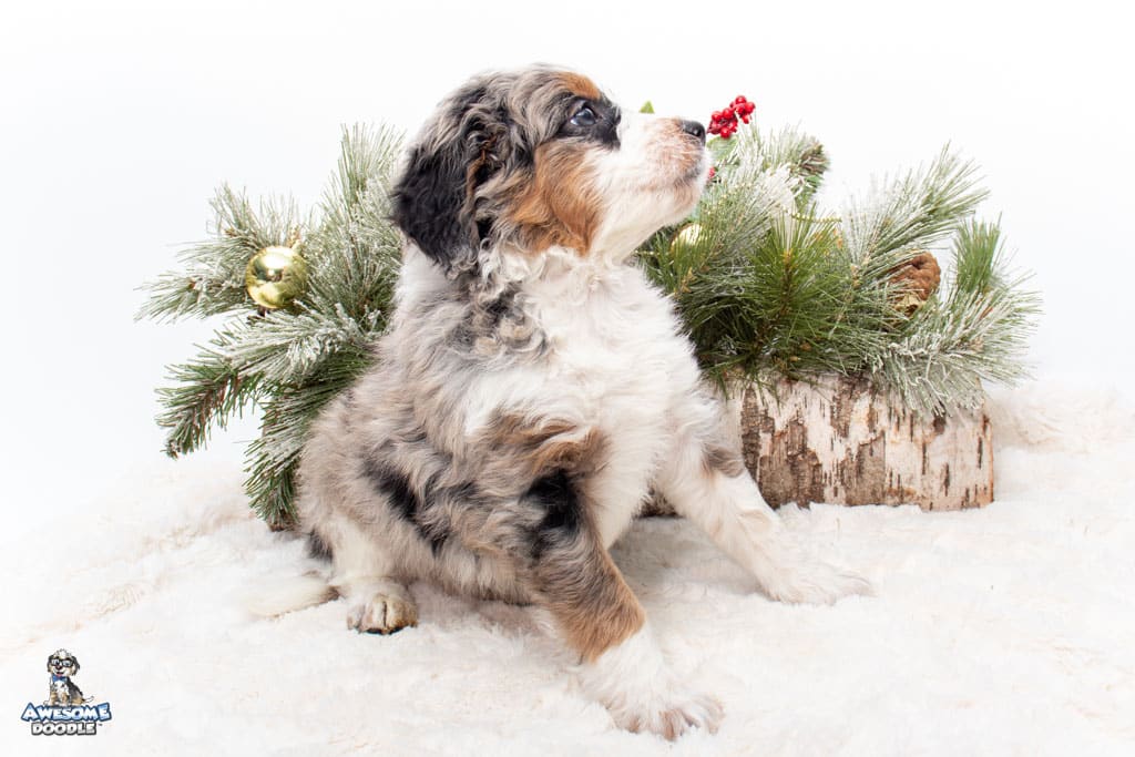 Zeke is a male Blue Merle w/ White & Copper F1 AussieDoodle puppy.