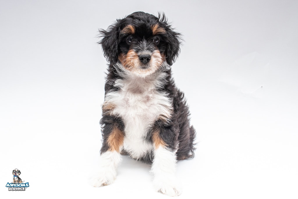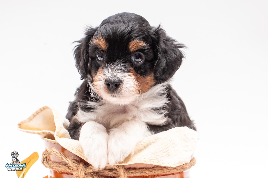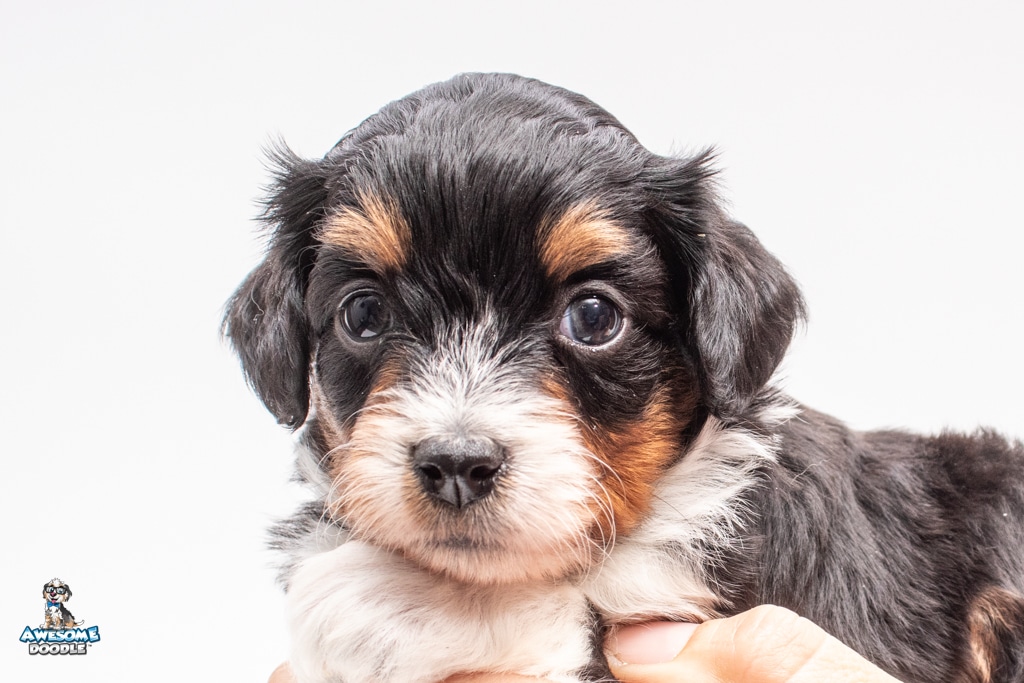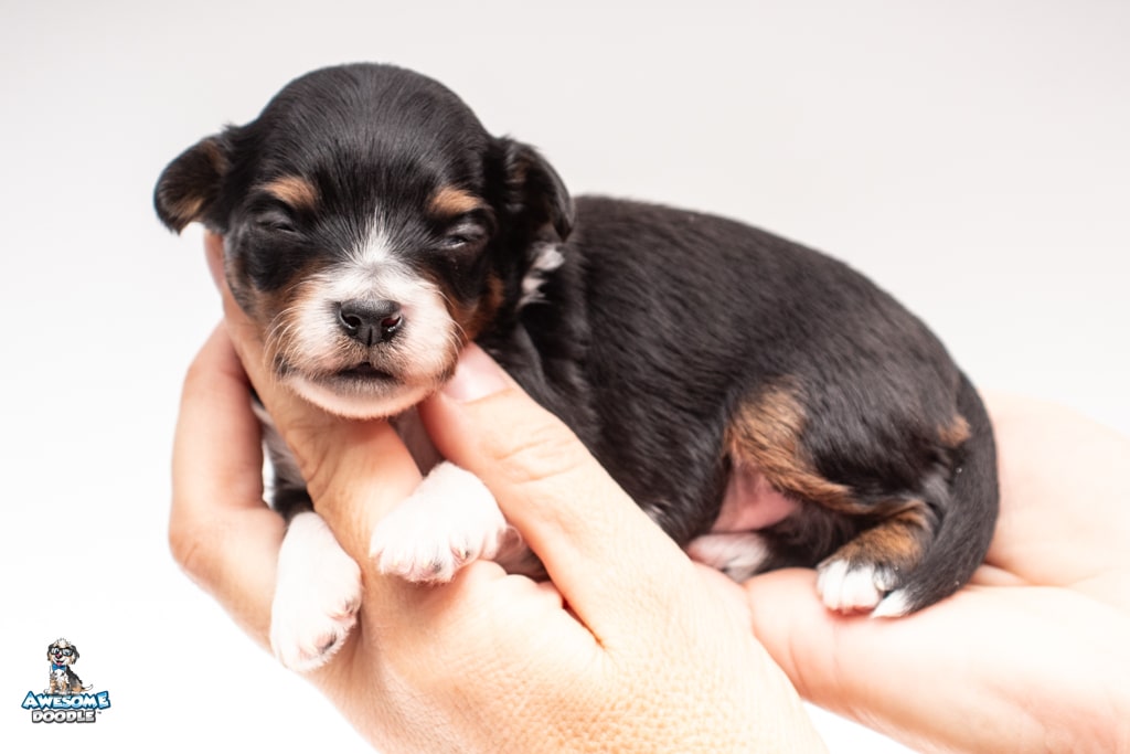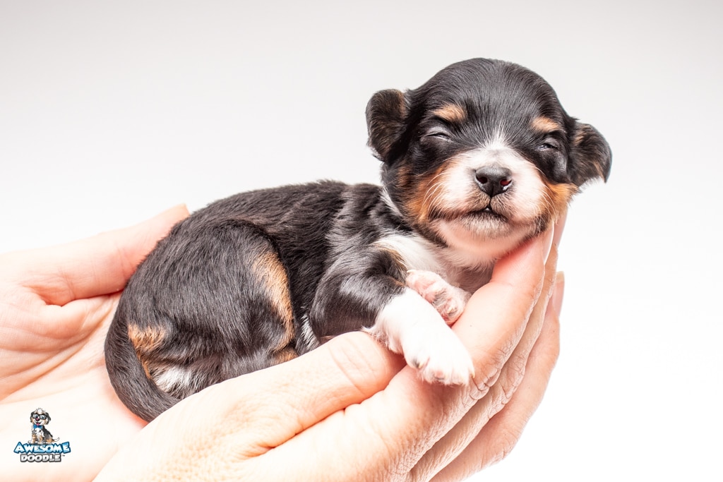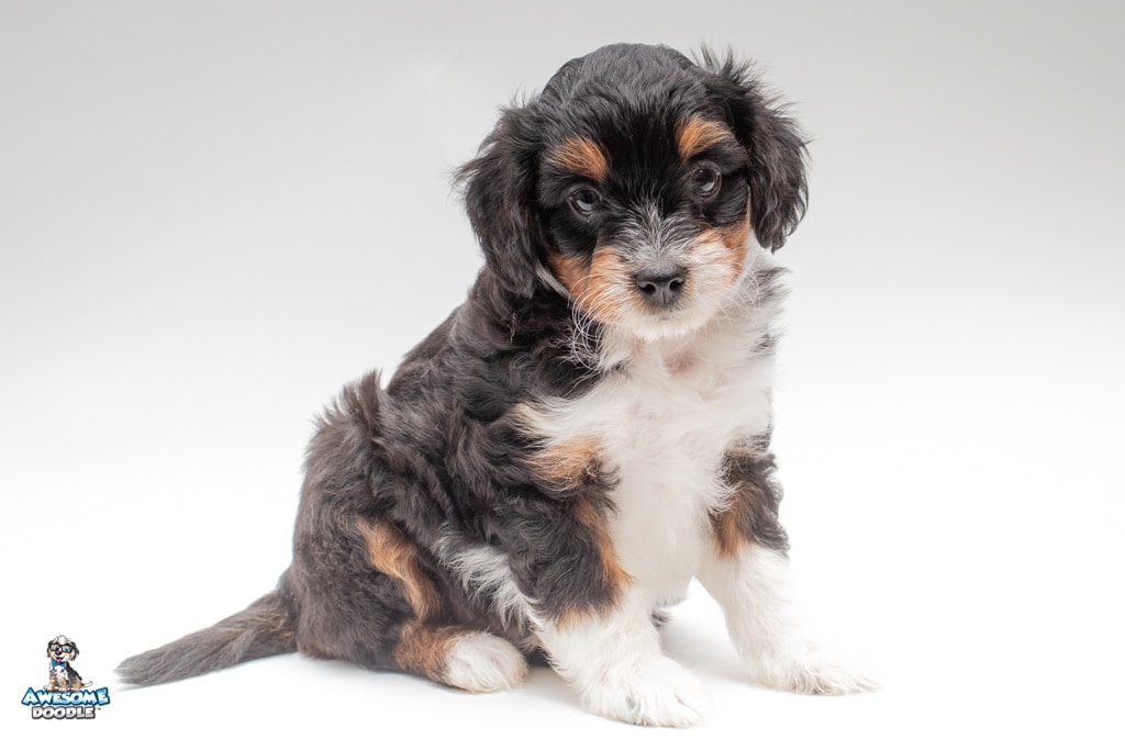 George is a male Black Tri-Color F1 AussieDoodle puppy.