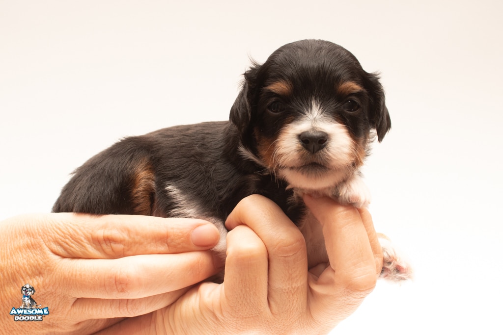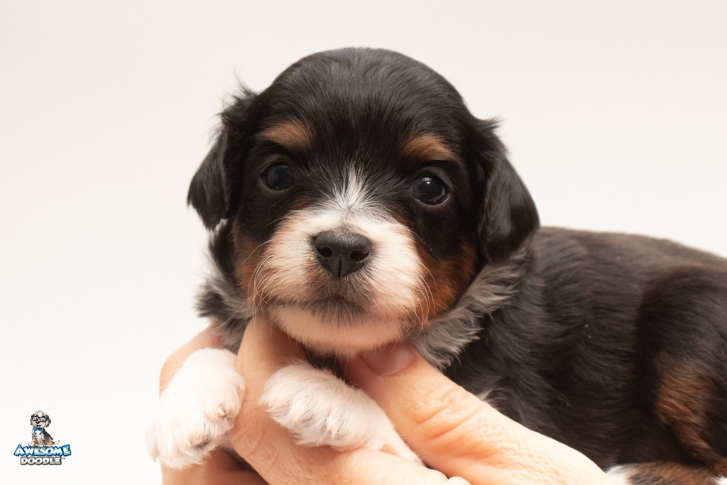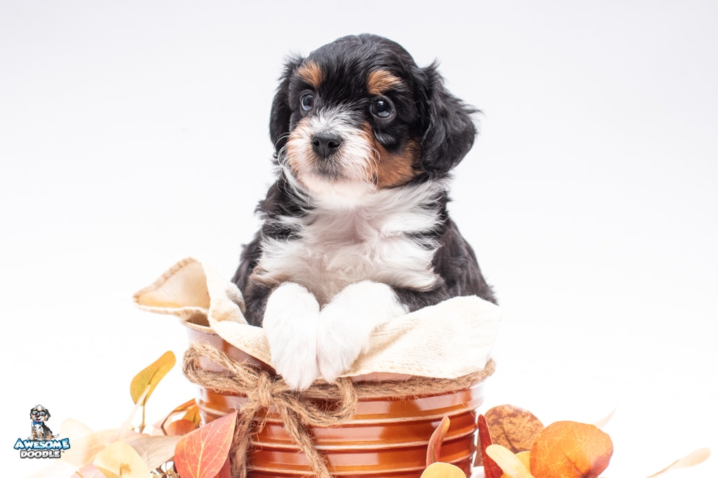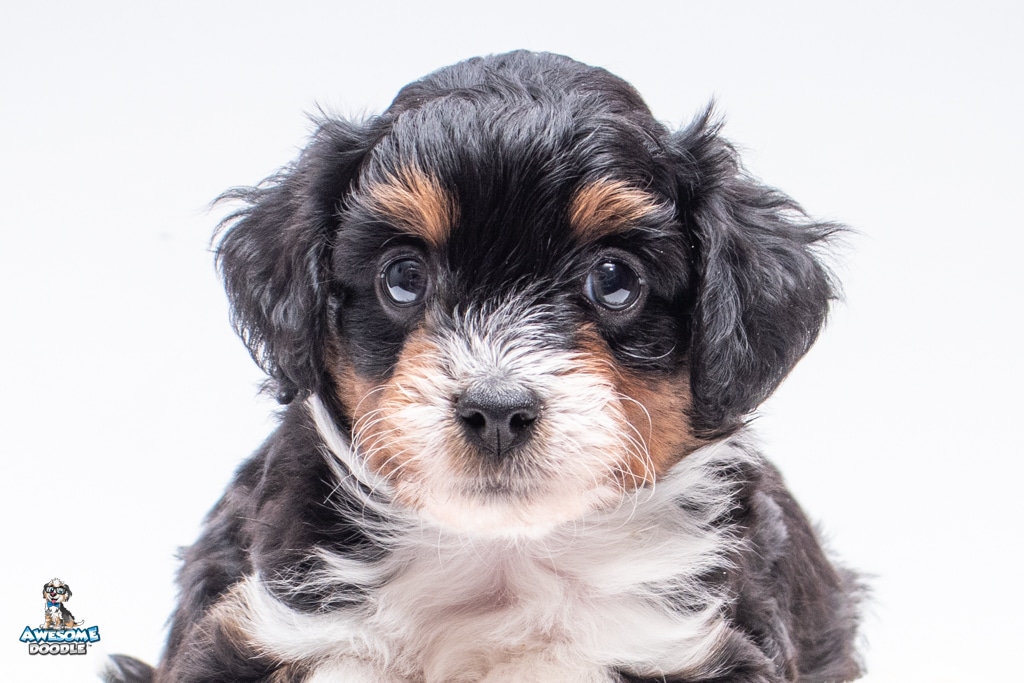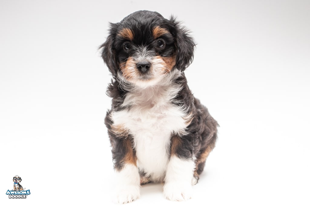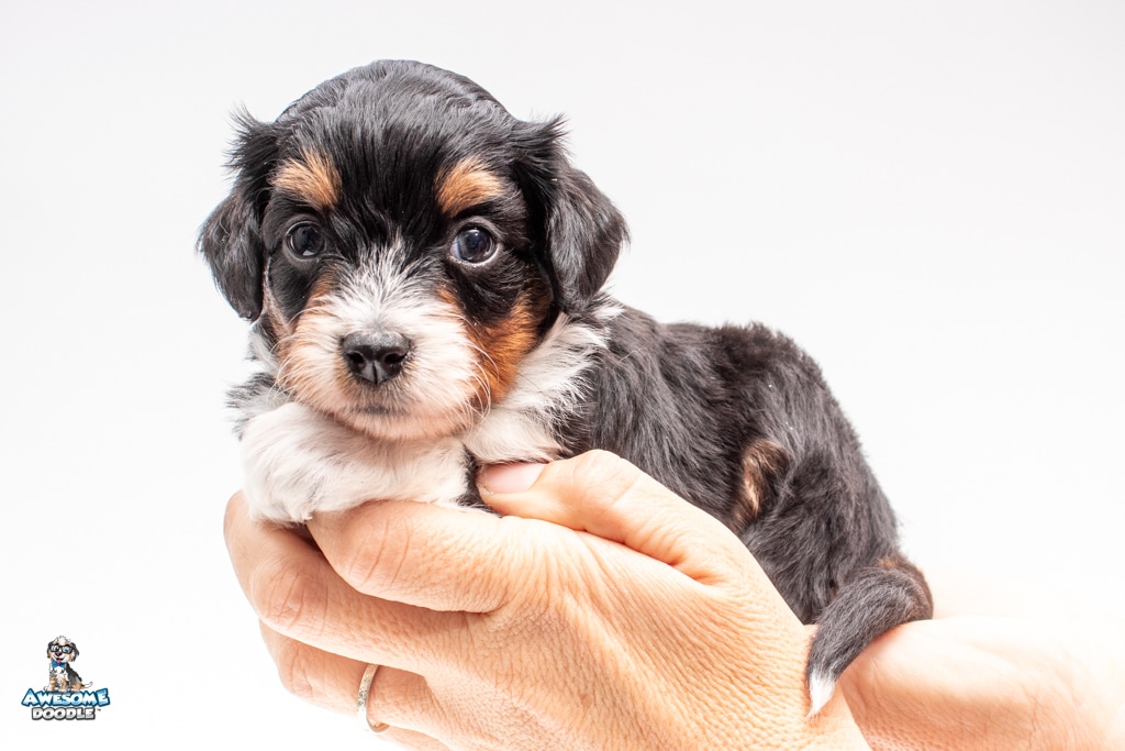 George is a male Black Tri-Color F1 AussieDoodle puppy.