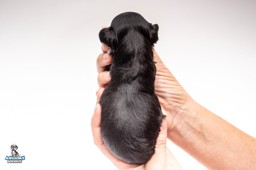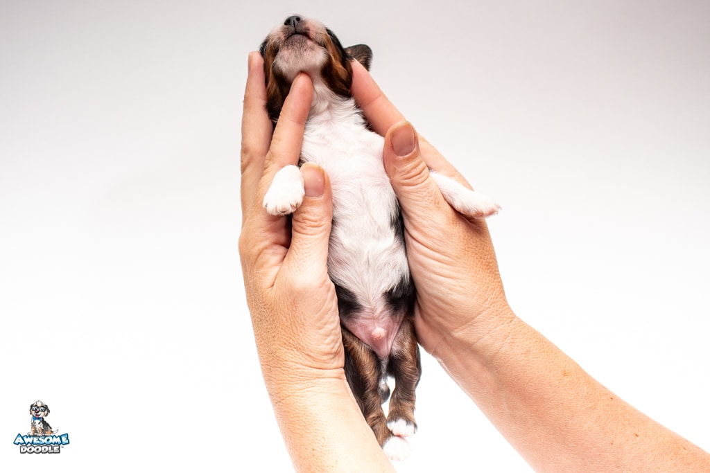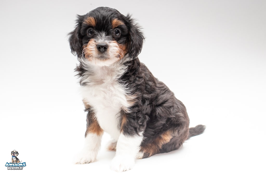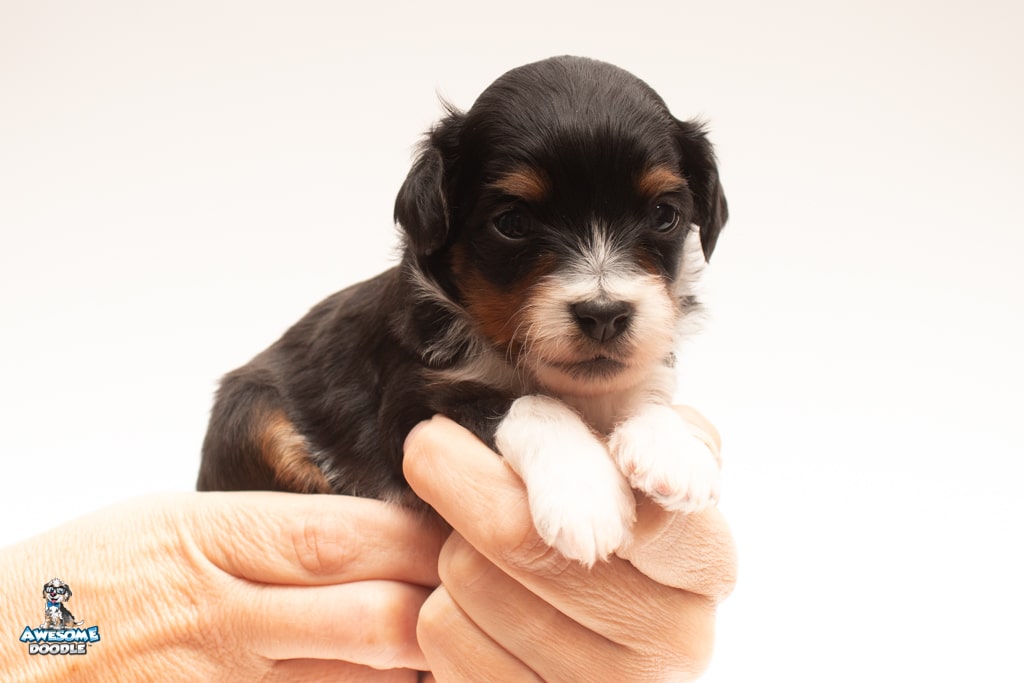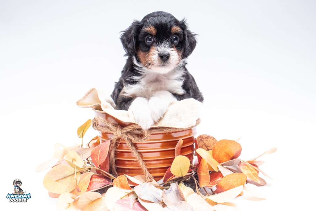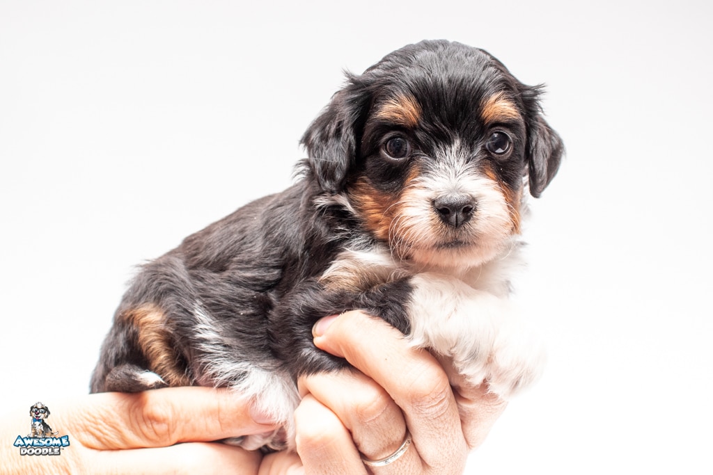 George is a male Black Tri-Color F1 AussieDoodle puppy.