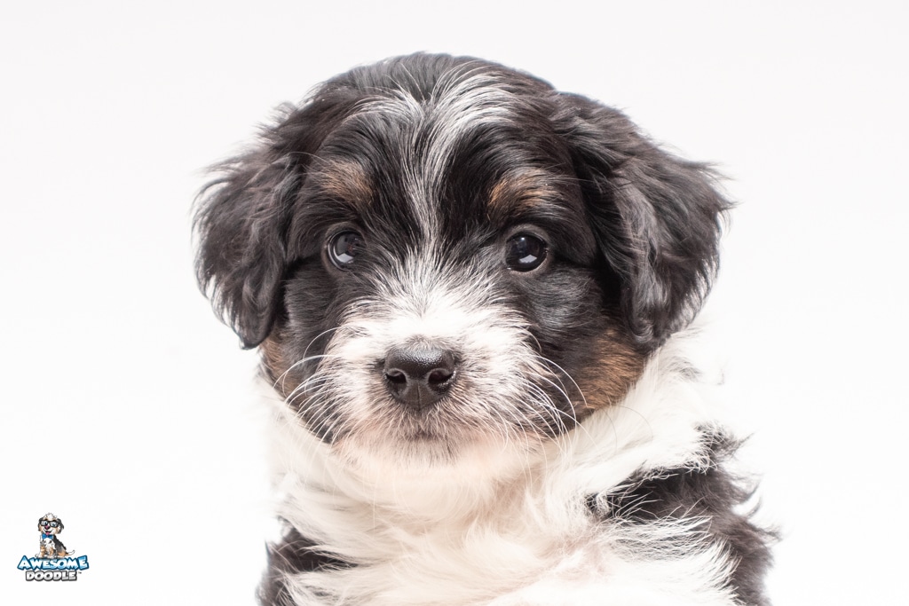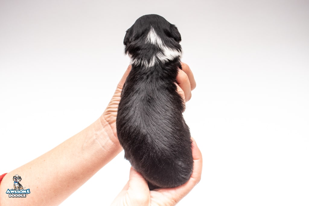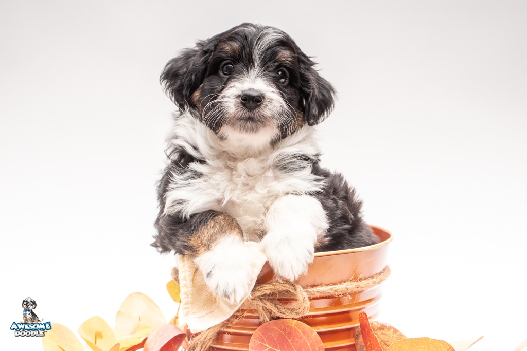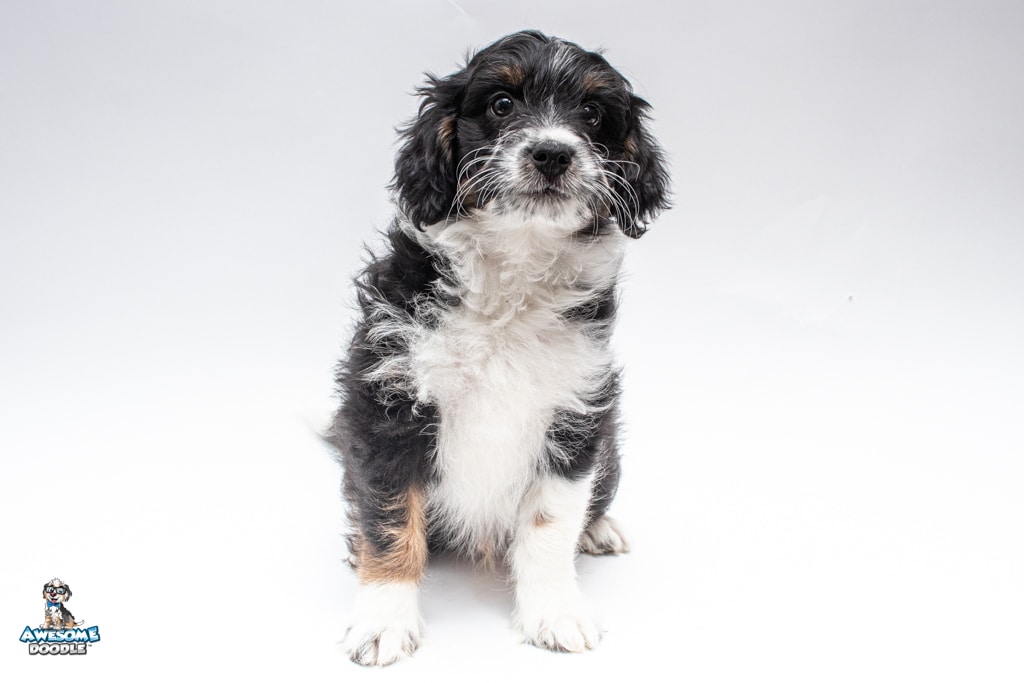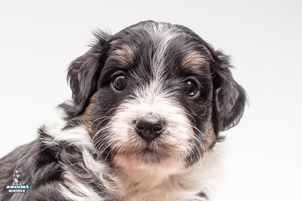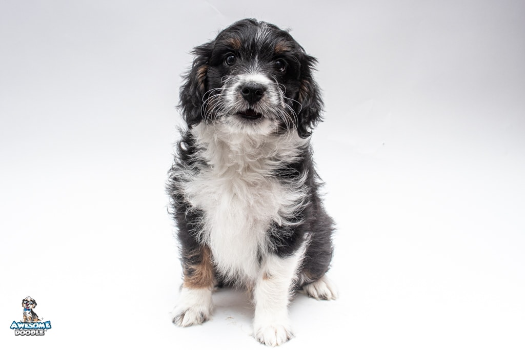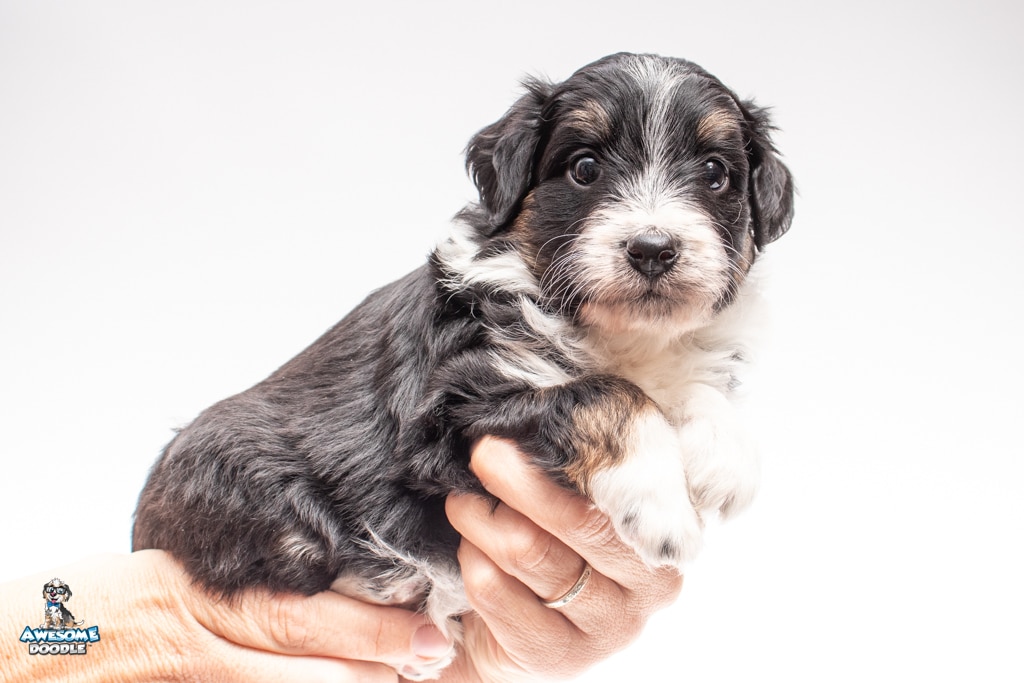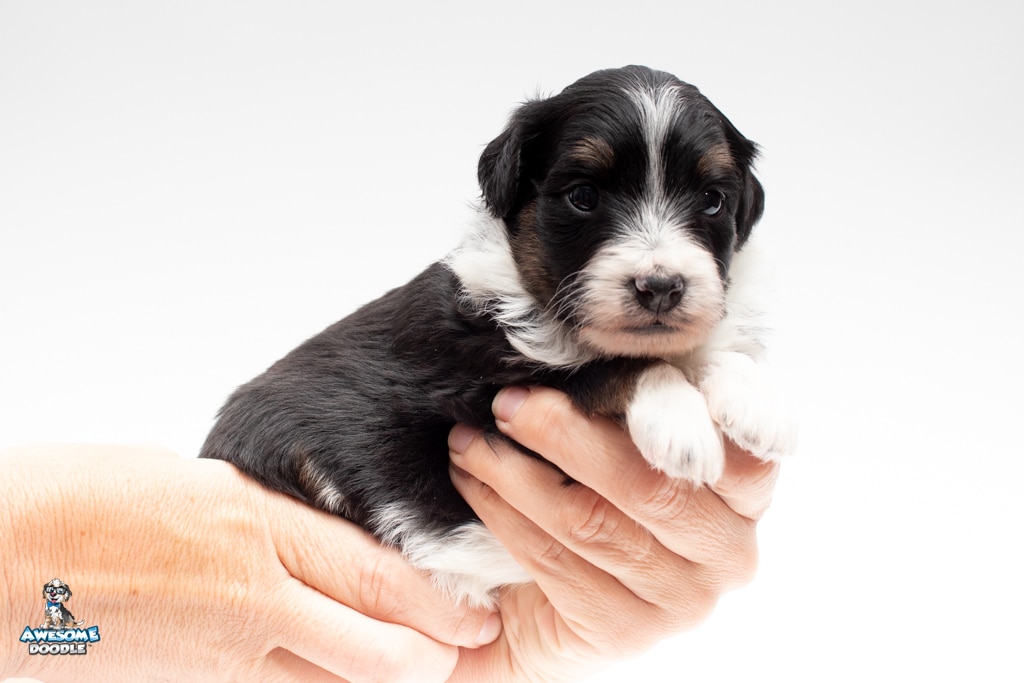John is a male Black Tri-Color F1 AussieDoodle puppy.
