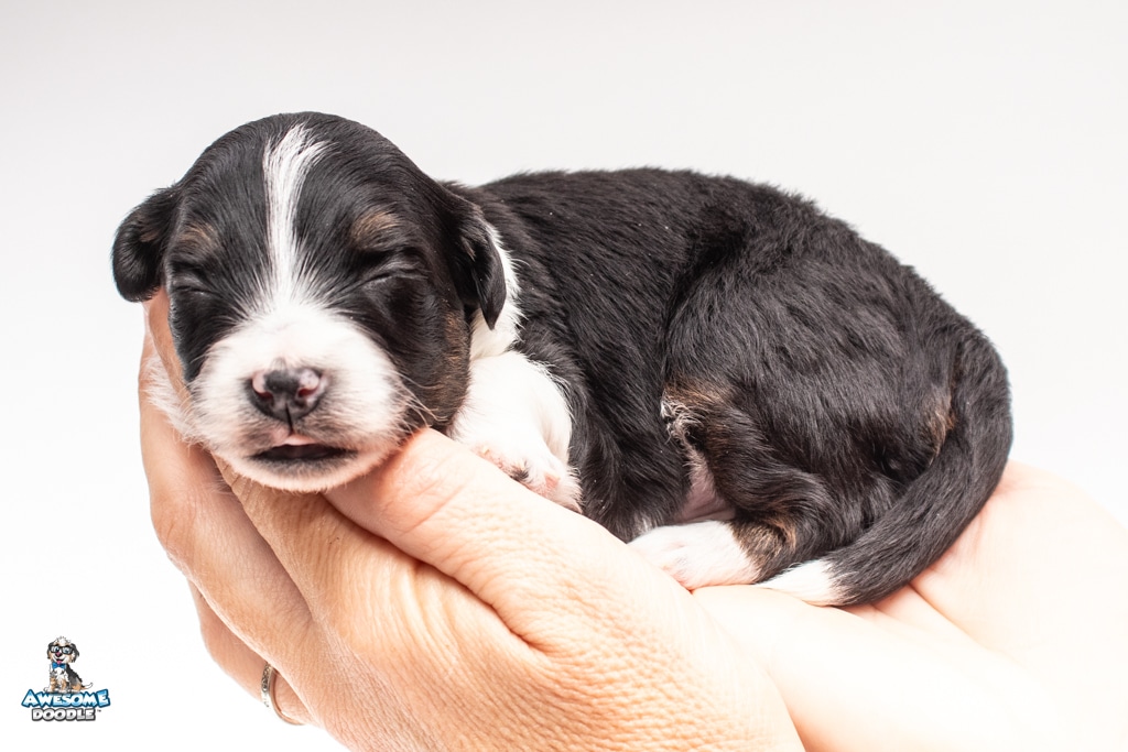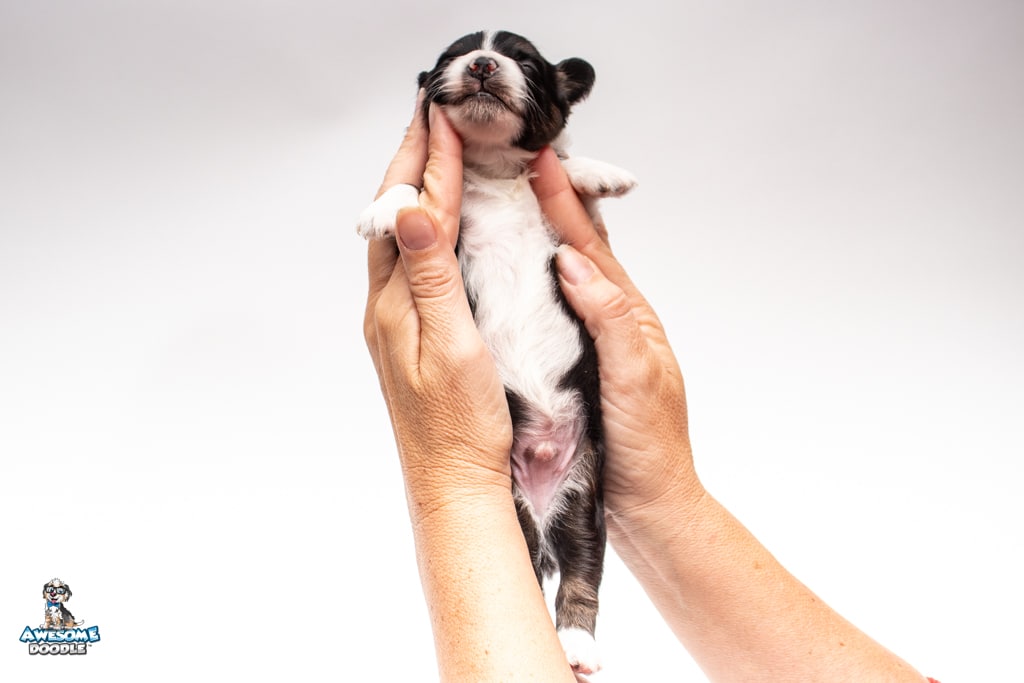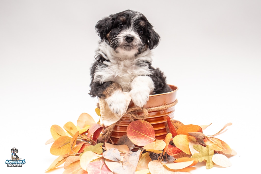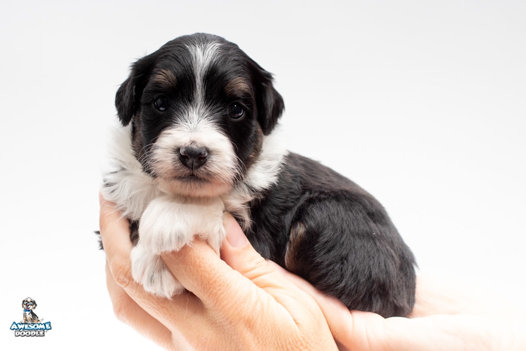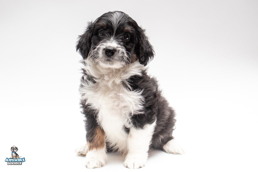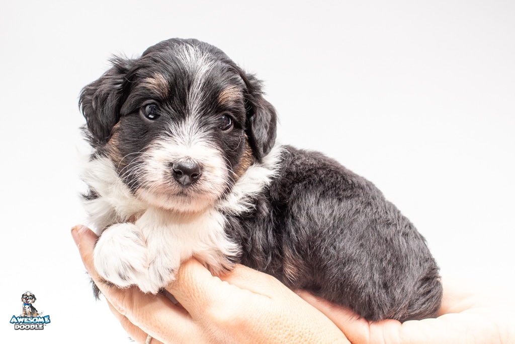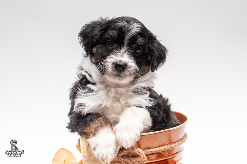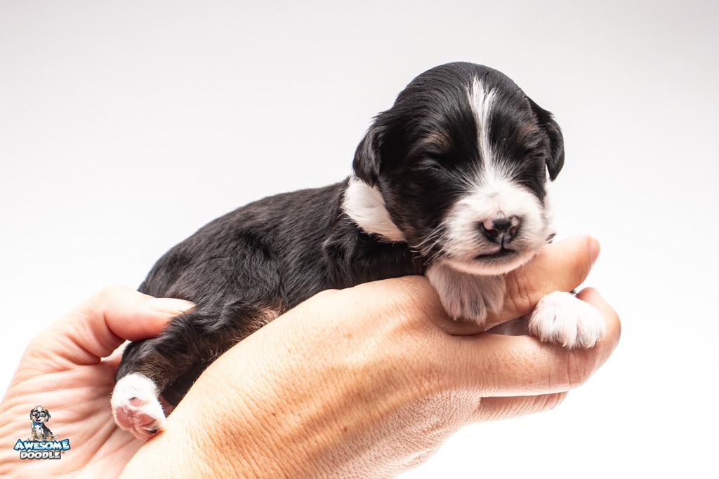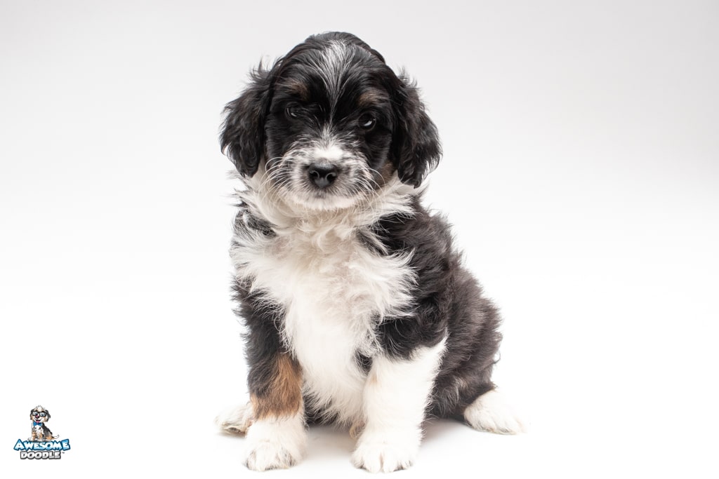John is a male Black Tri-Color F1 AussieDoodle puppy.