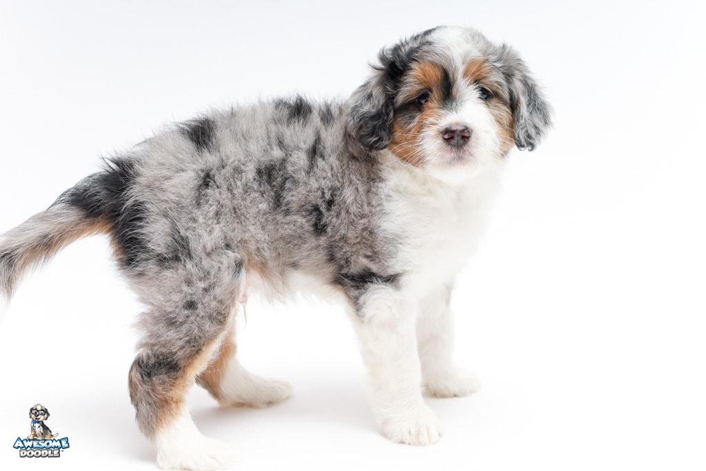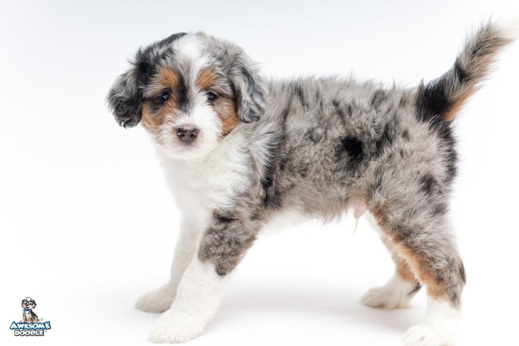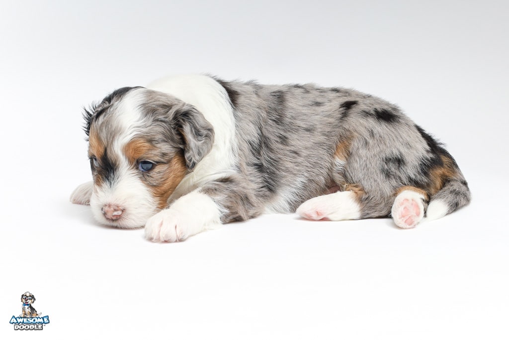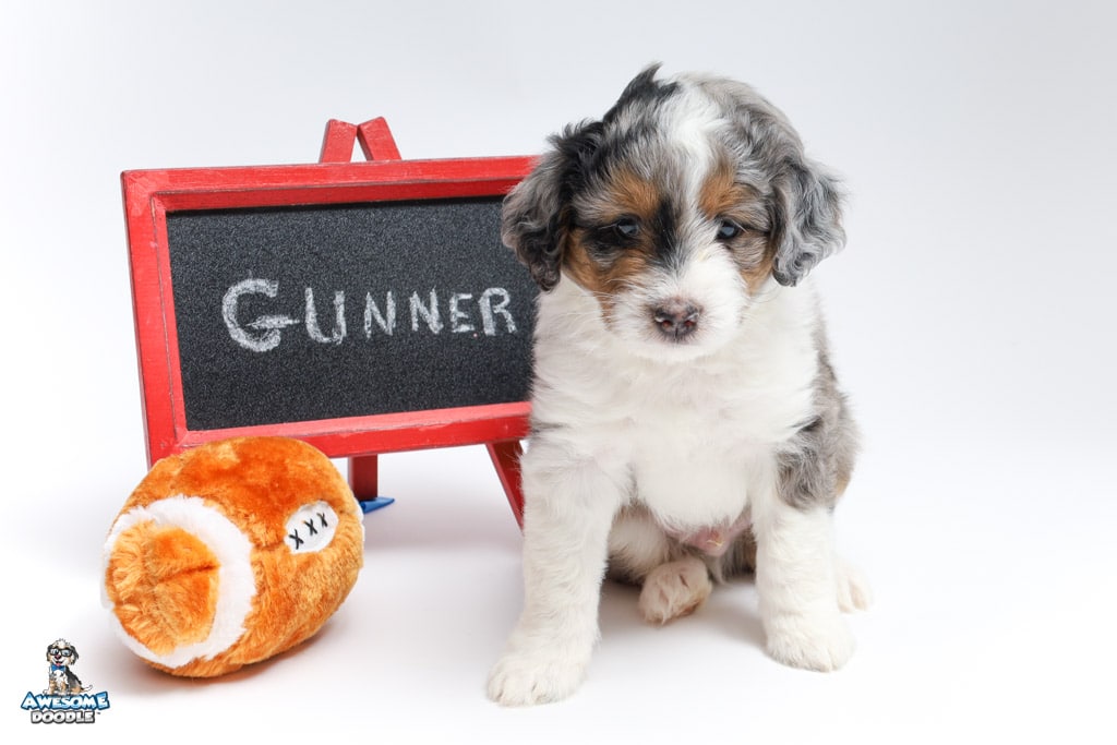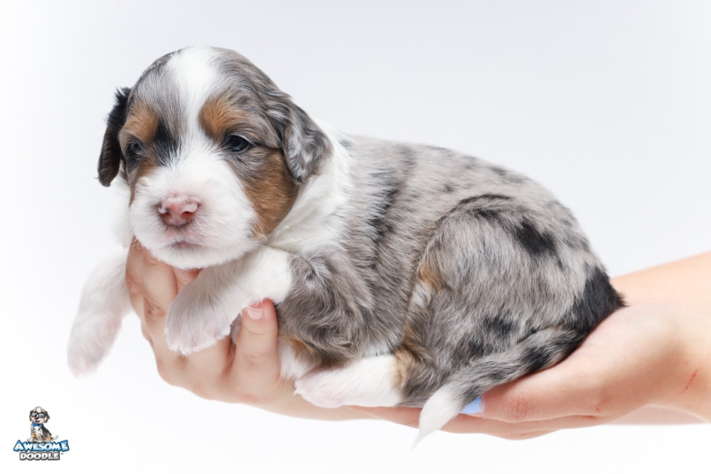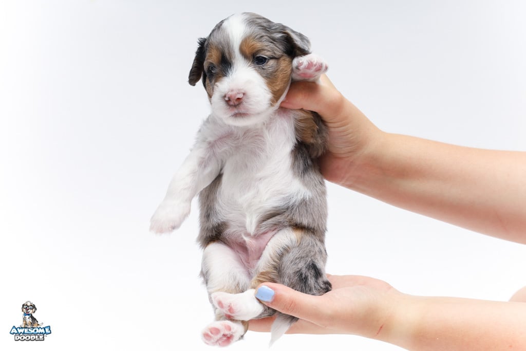 Gunnar is a male Blue Merle w/ White & Copper F1 AussieDoodle puppy.