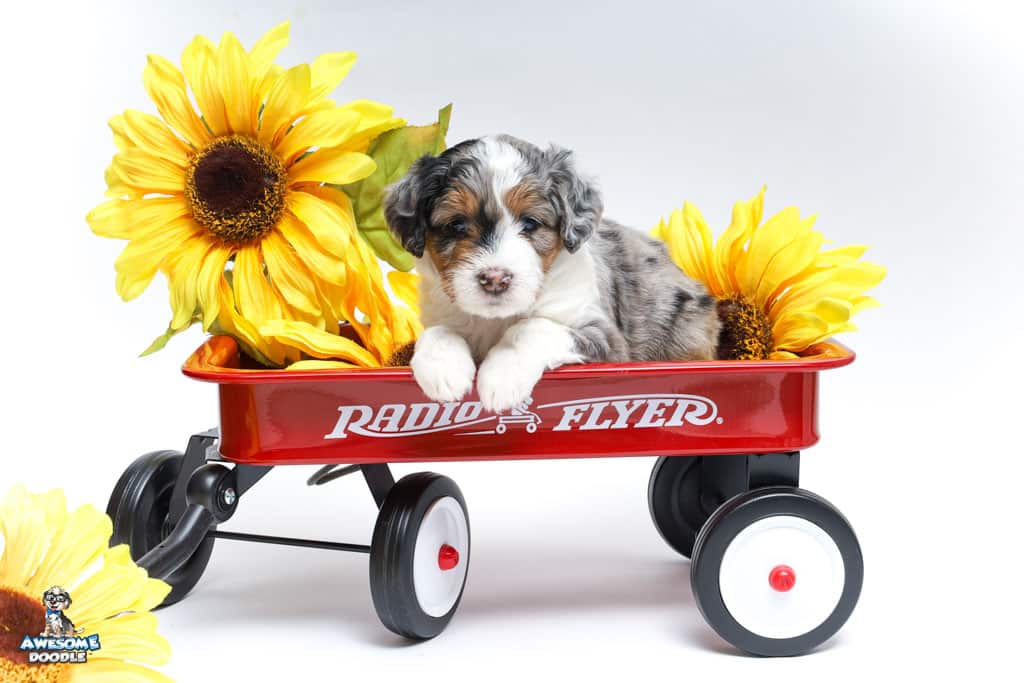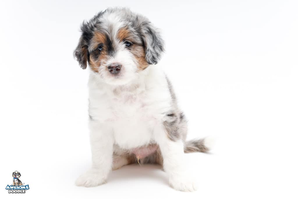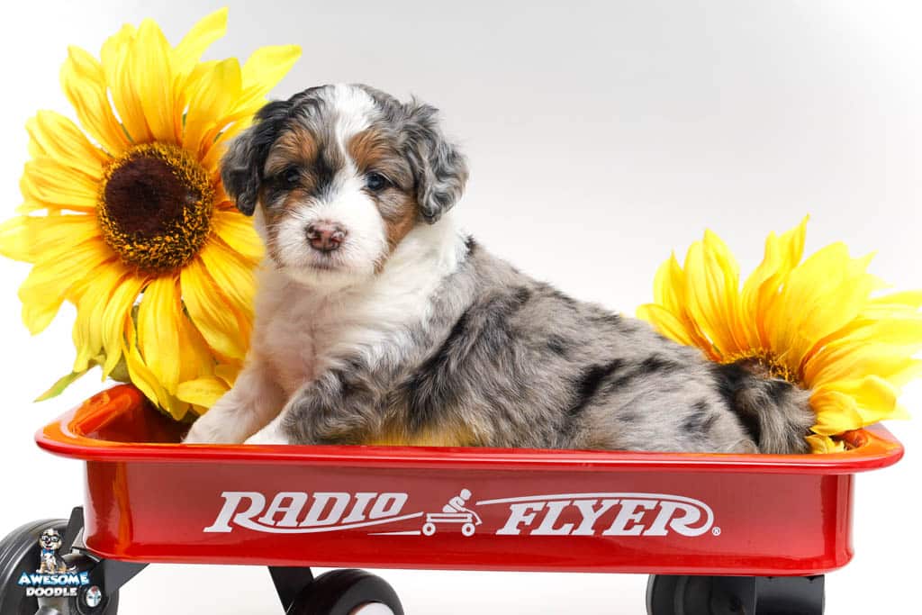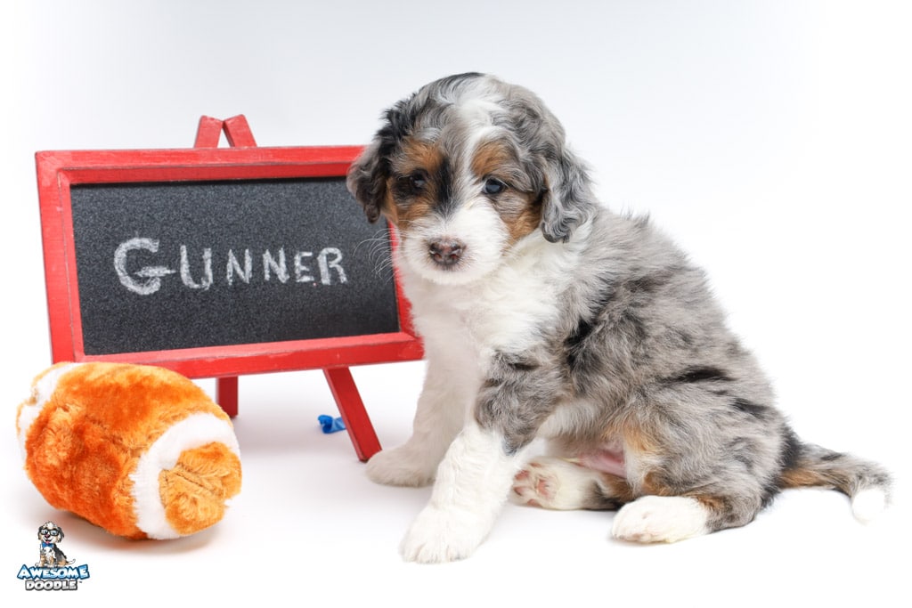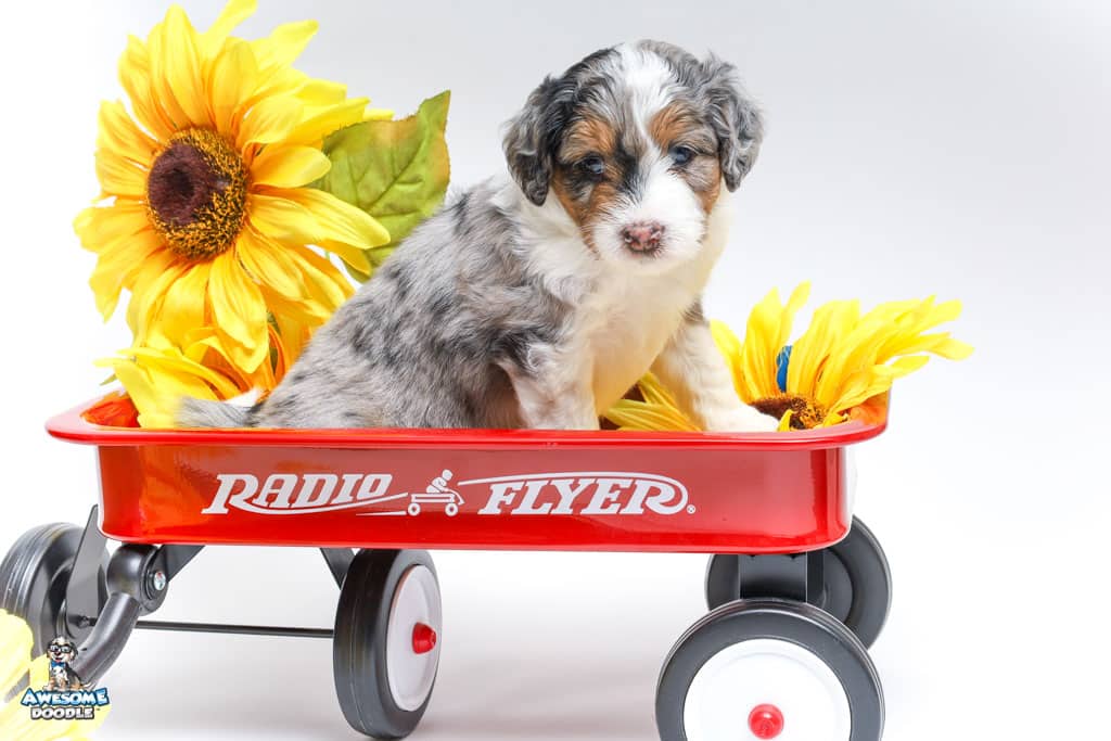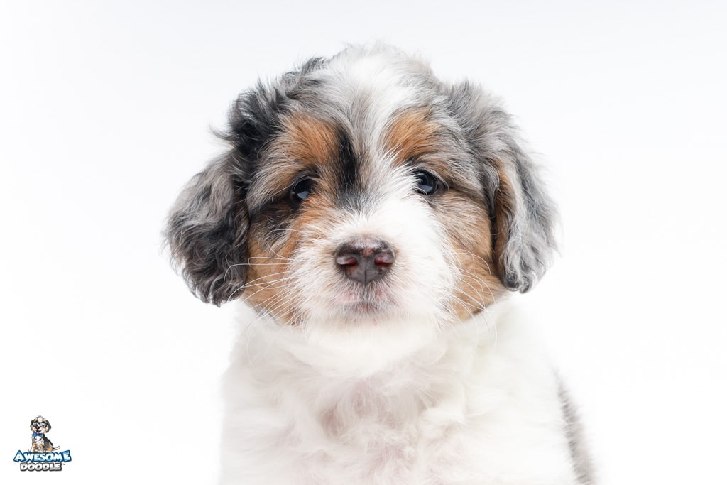 Gunnar is a male Blue Merle w/ White & Copper F1 AussieDoodle puppy.