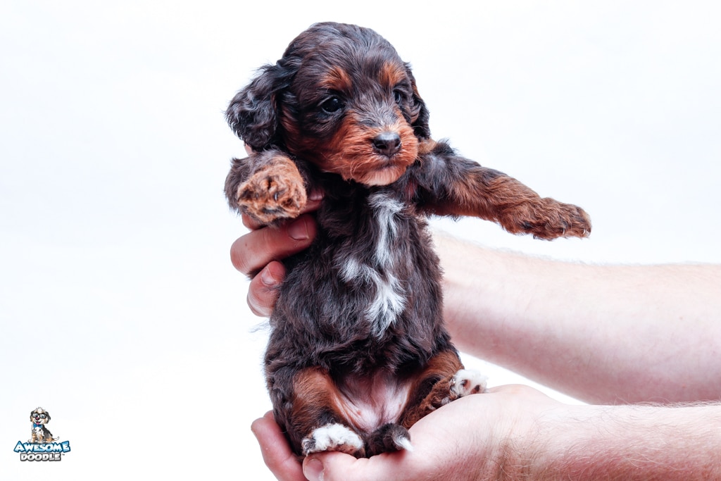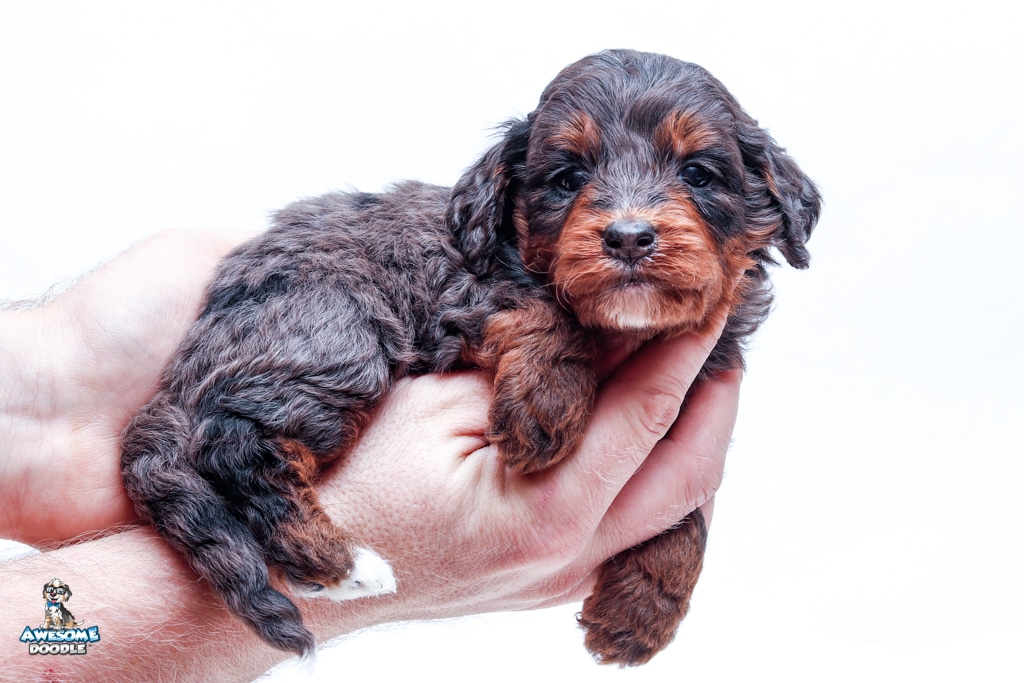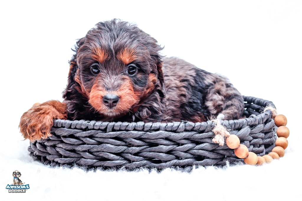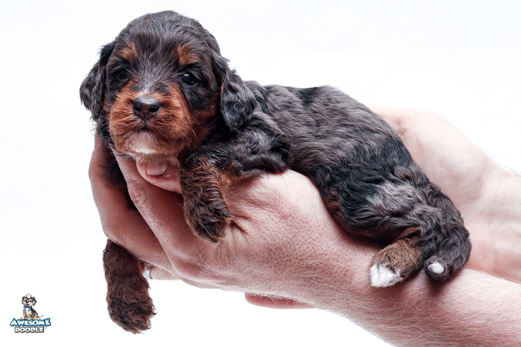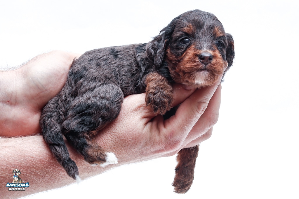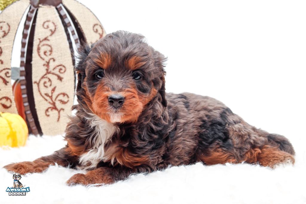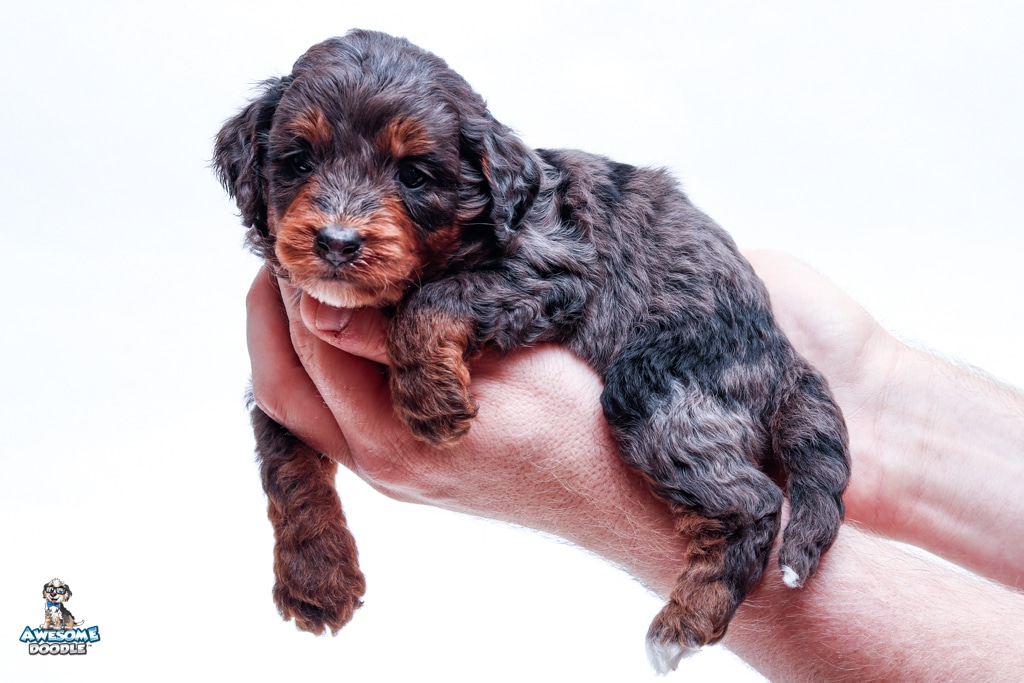 Lady is a female Phantom Blue Merle F1 AussieDoodle puppy.