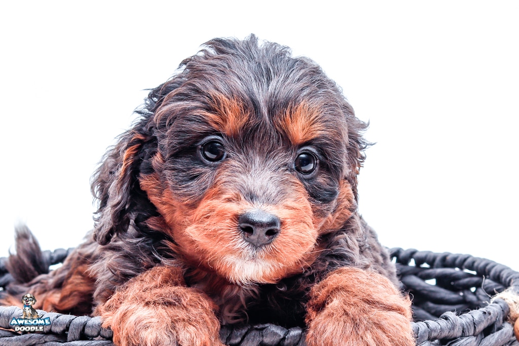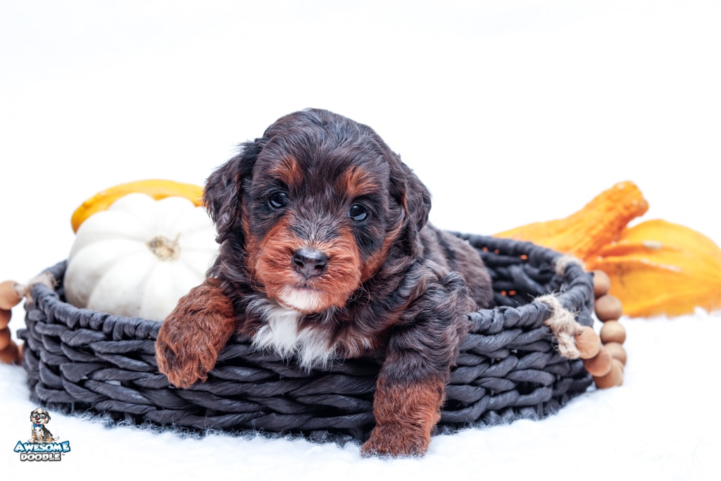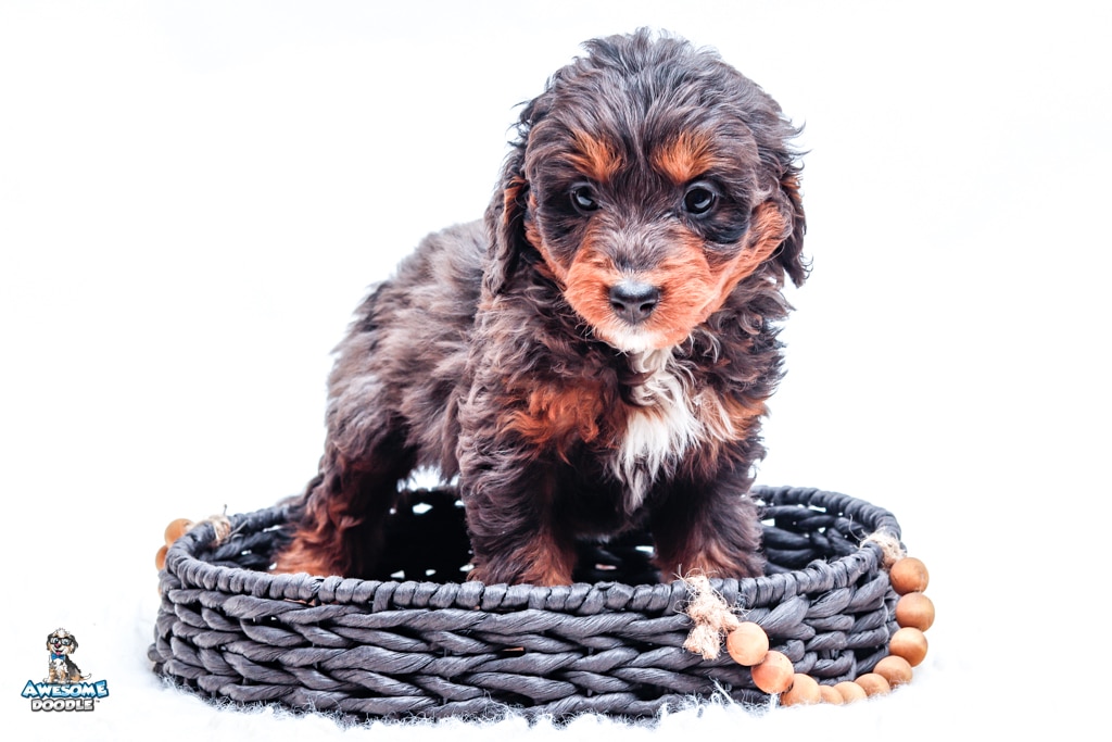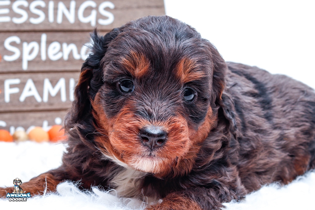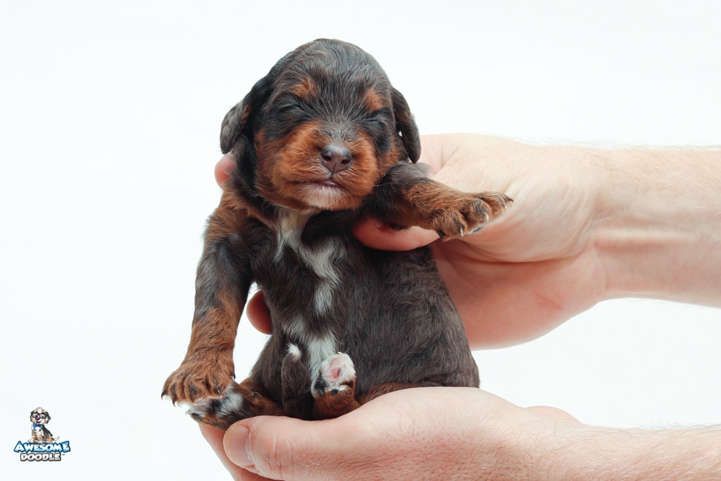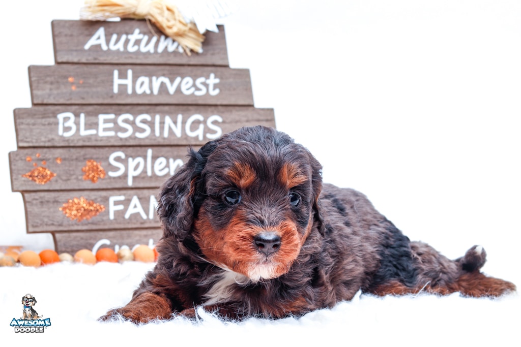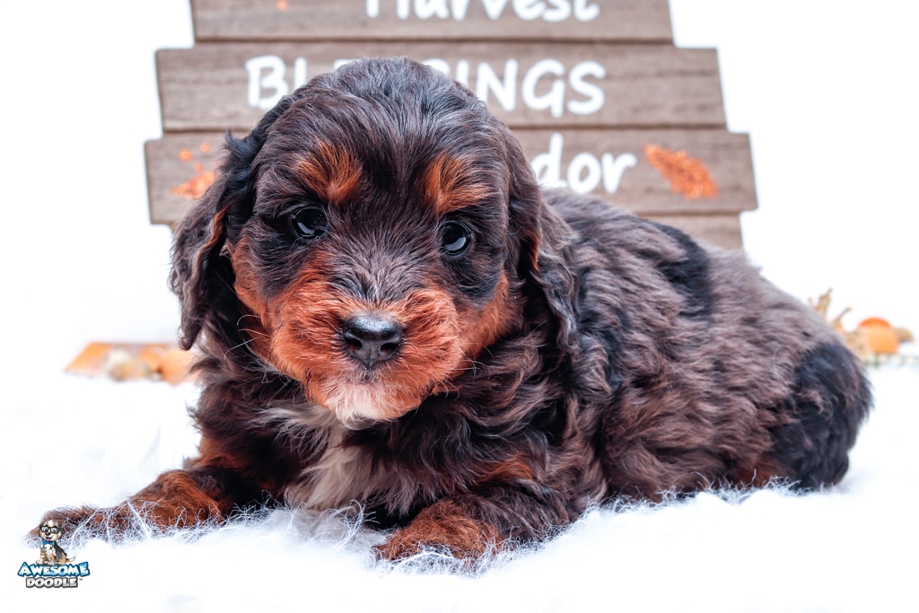 Lady is a female Phantom Blue Merle F1 AussieDoodle puppy.