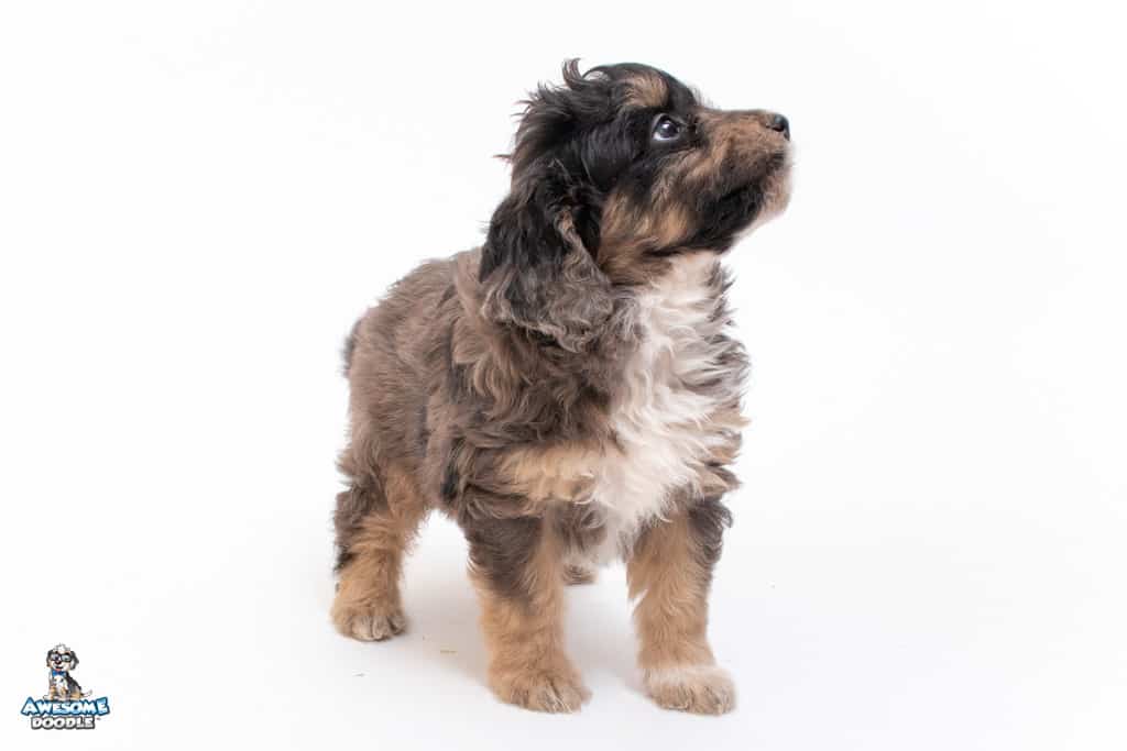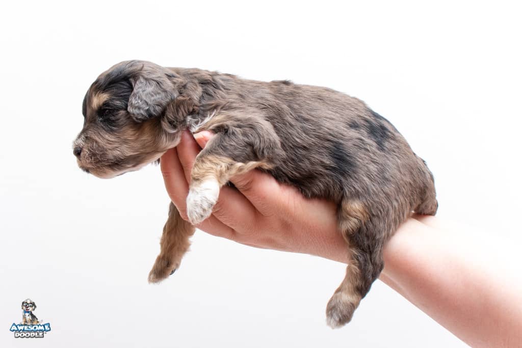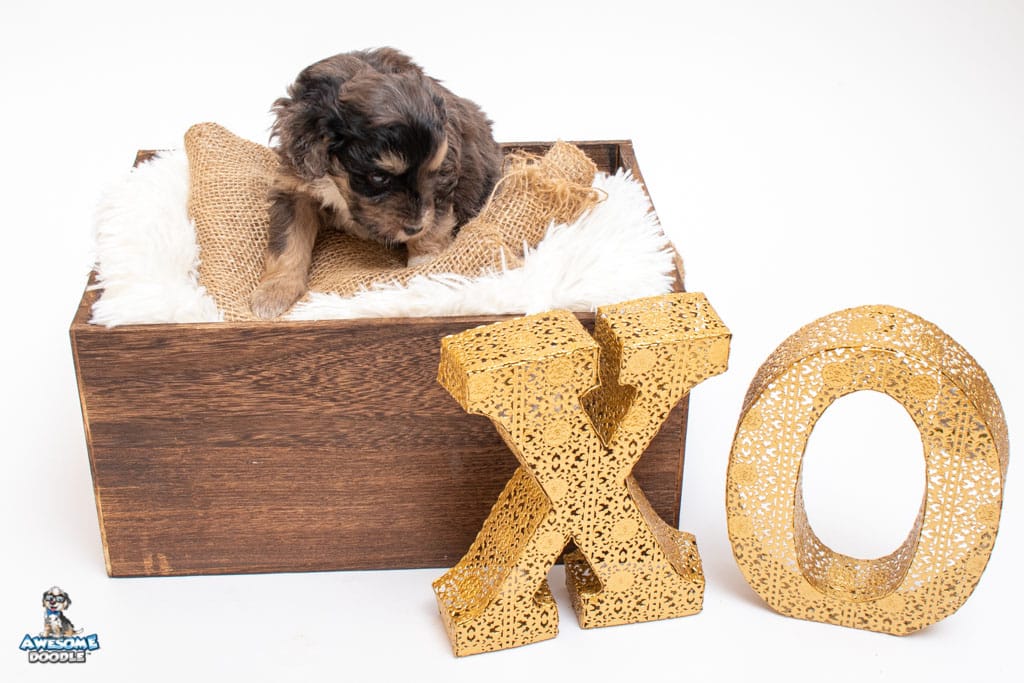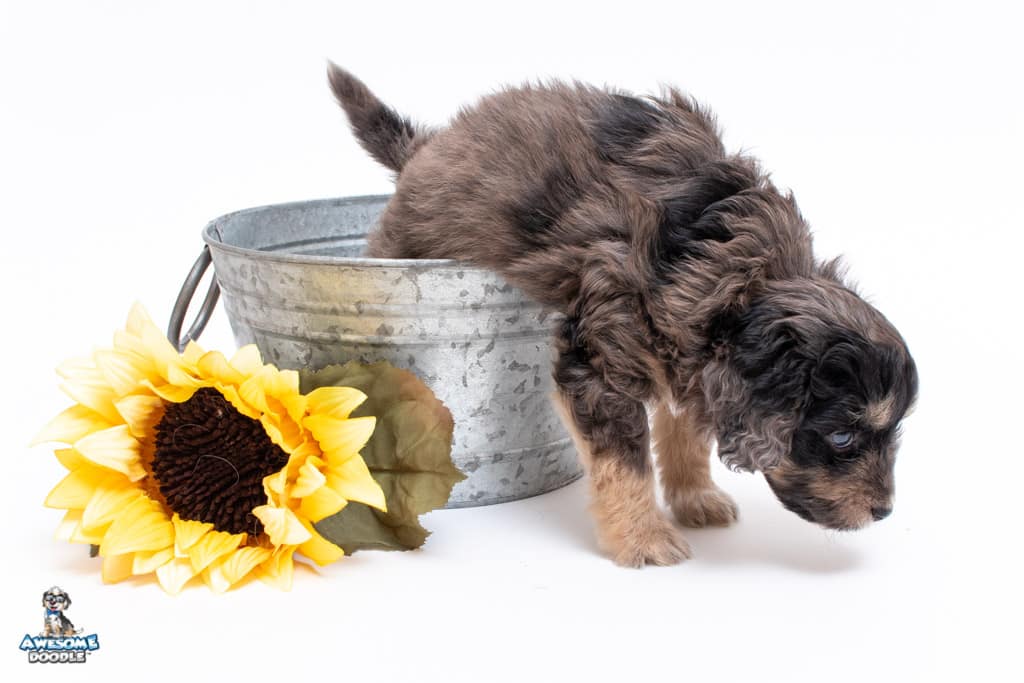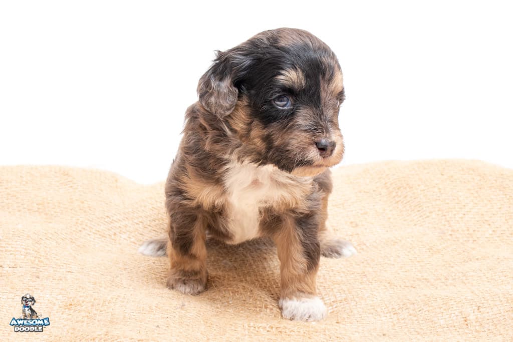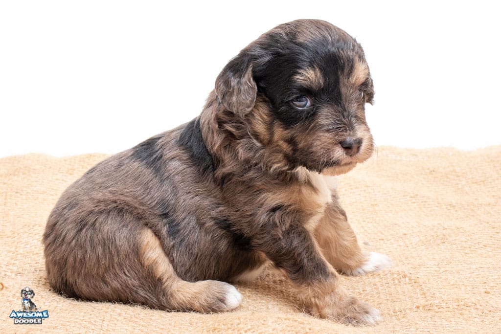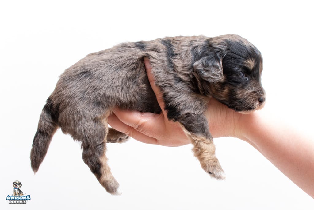 Millie is a female Phantom Blue Merle F1 AussieDoodle puppy.