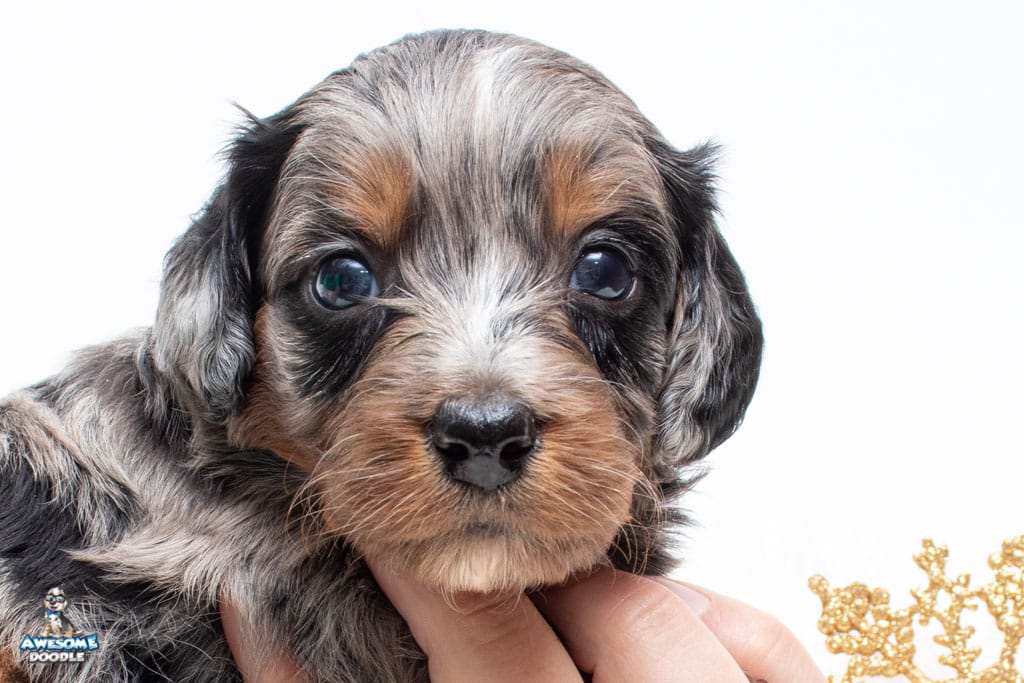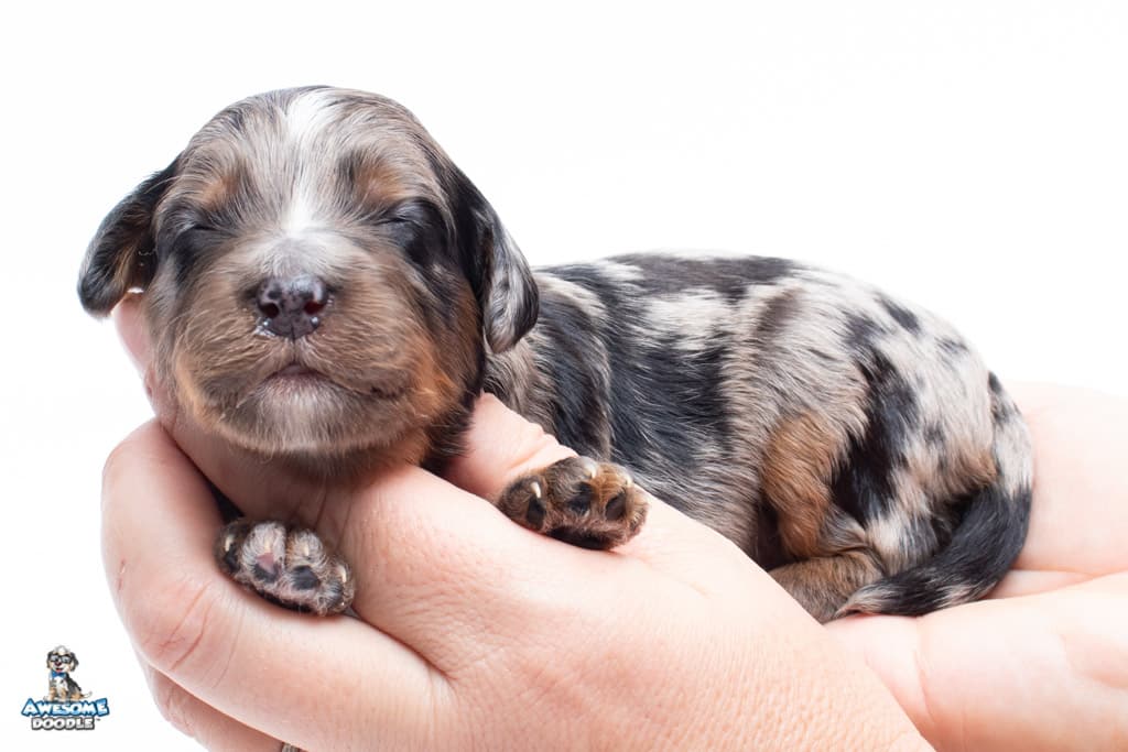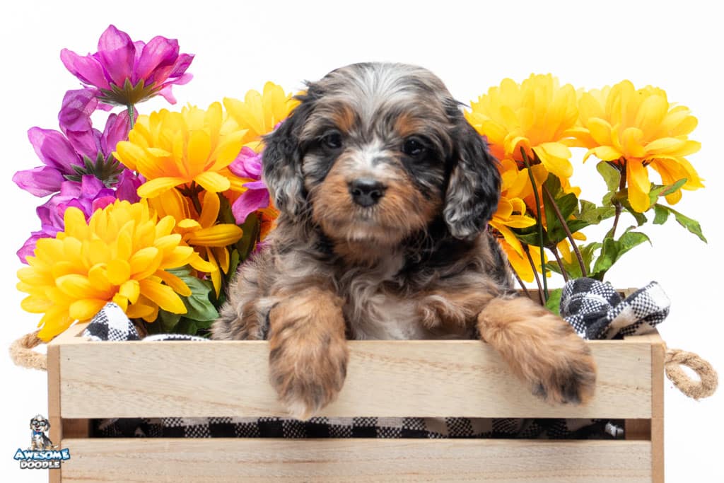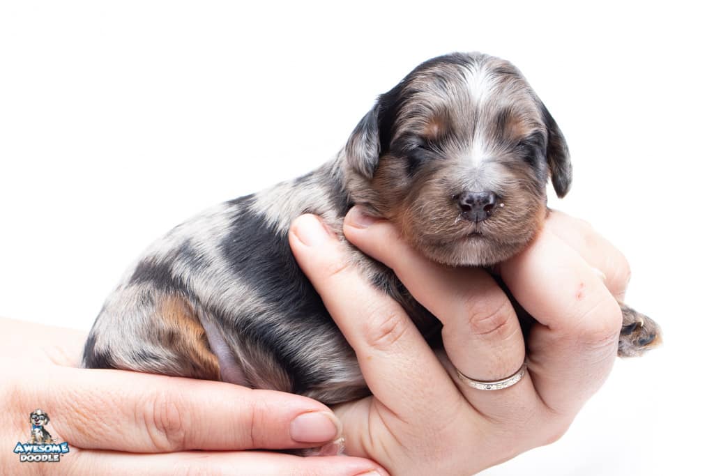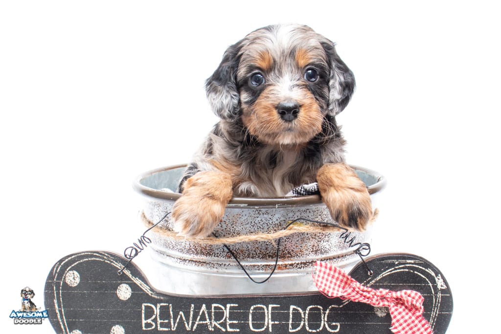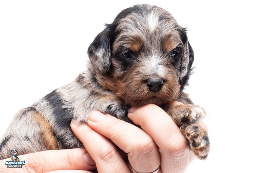 Coco is a female Phantom Blue Merle F1 AussieDoodle puppy.