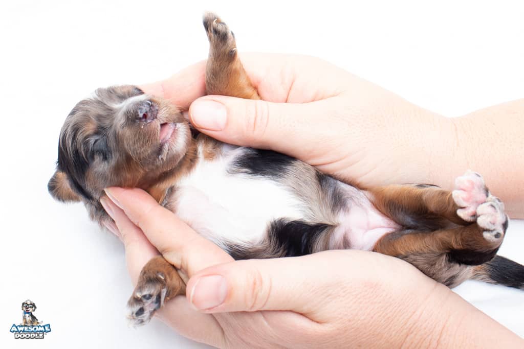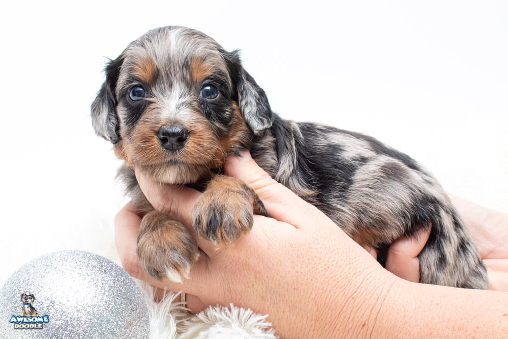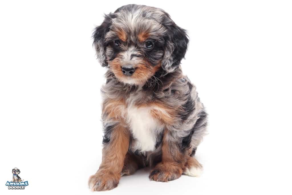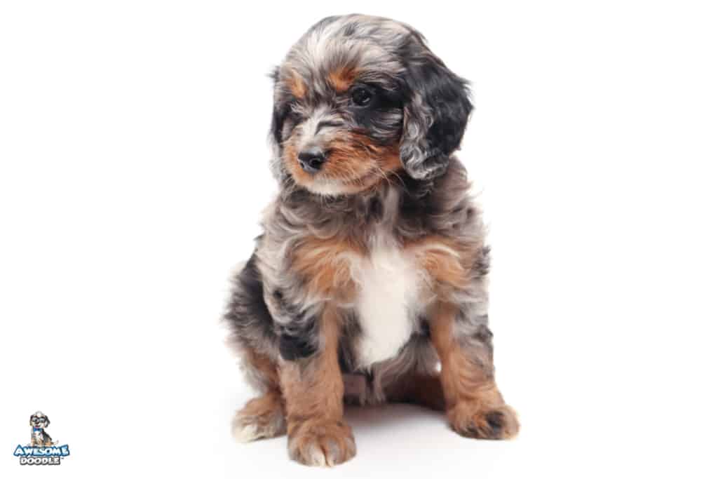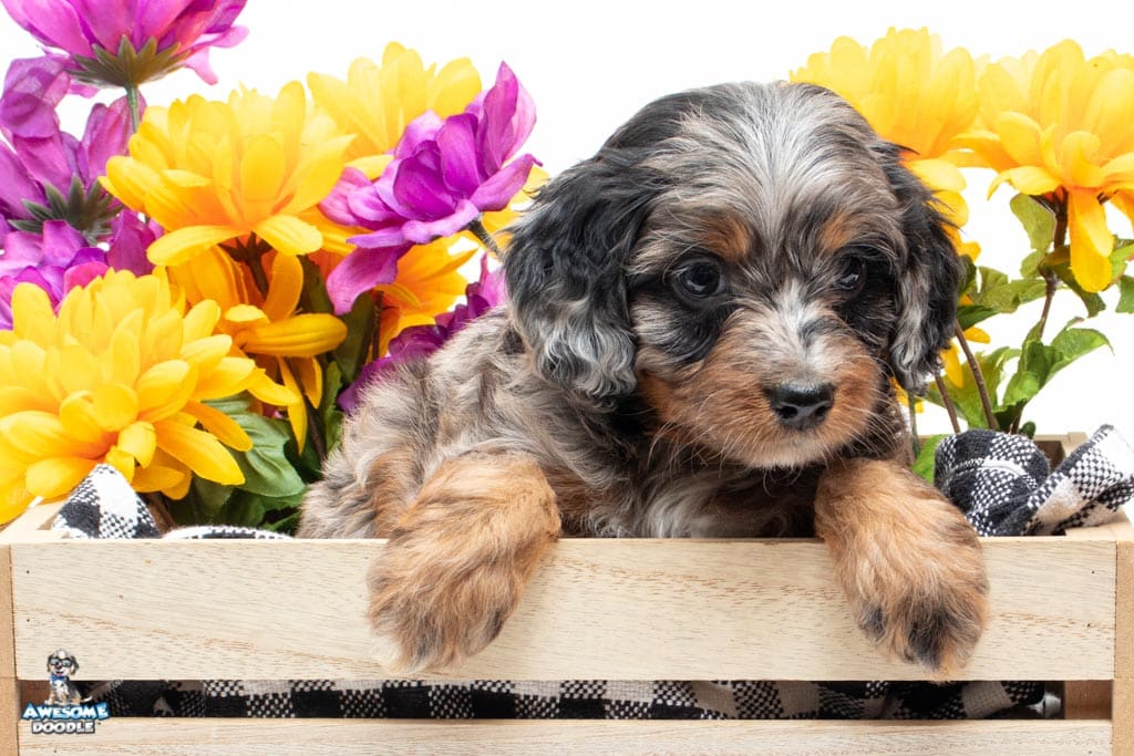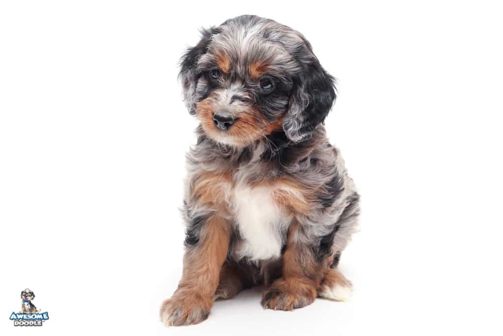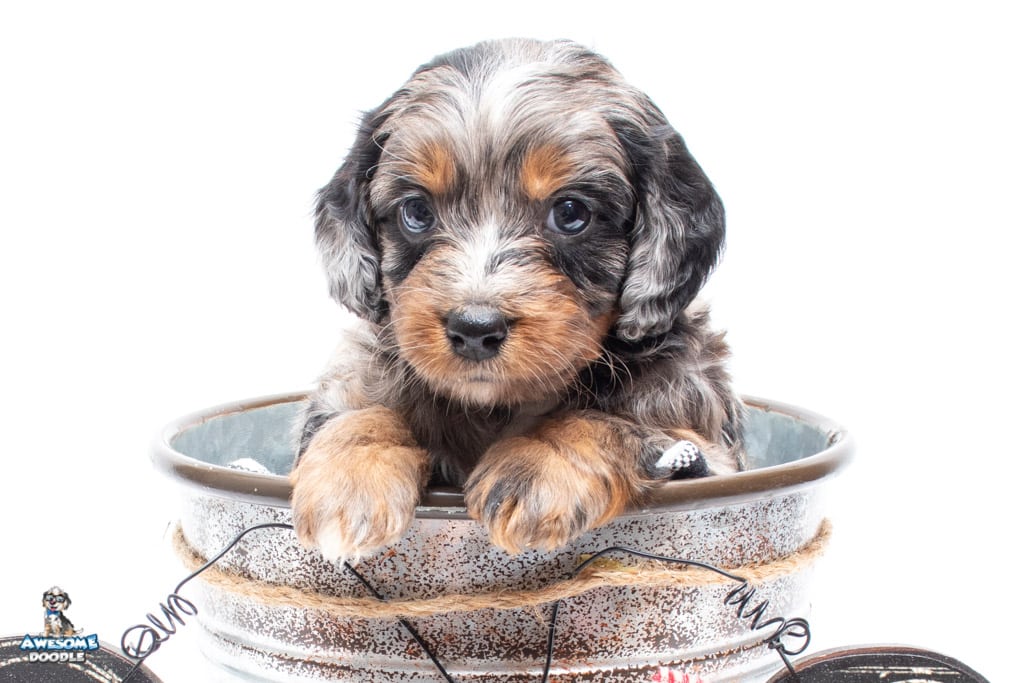 Coco is a female Phantom Blue Merle F1 AussieDoodle puppy.