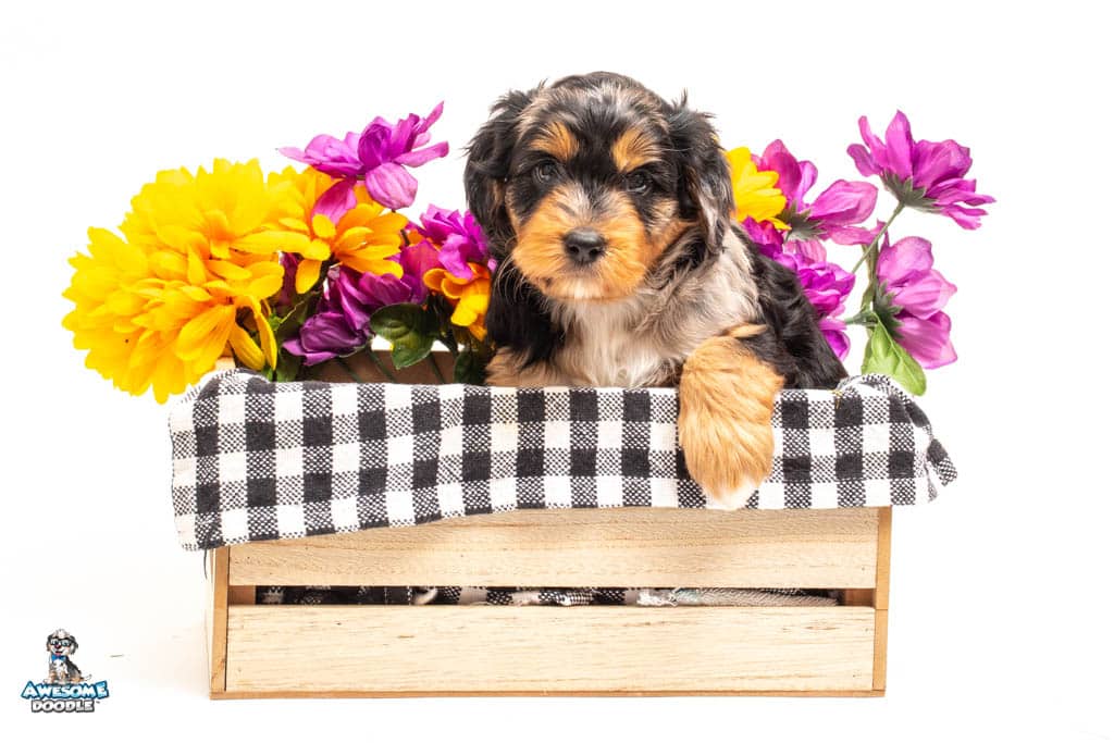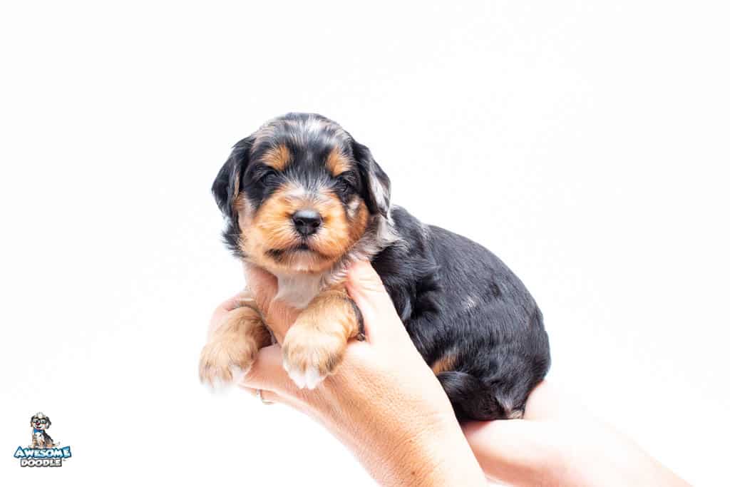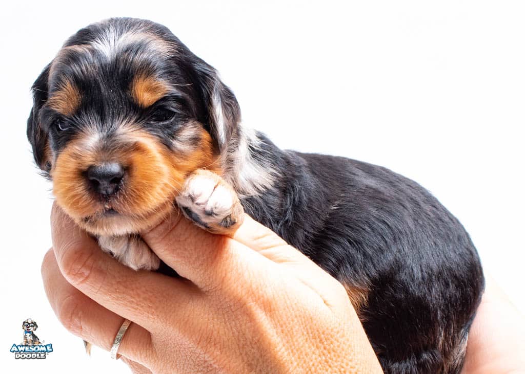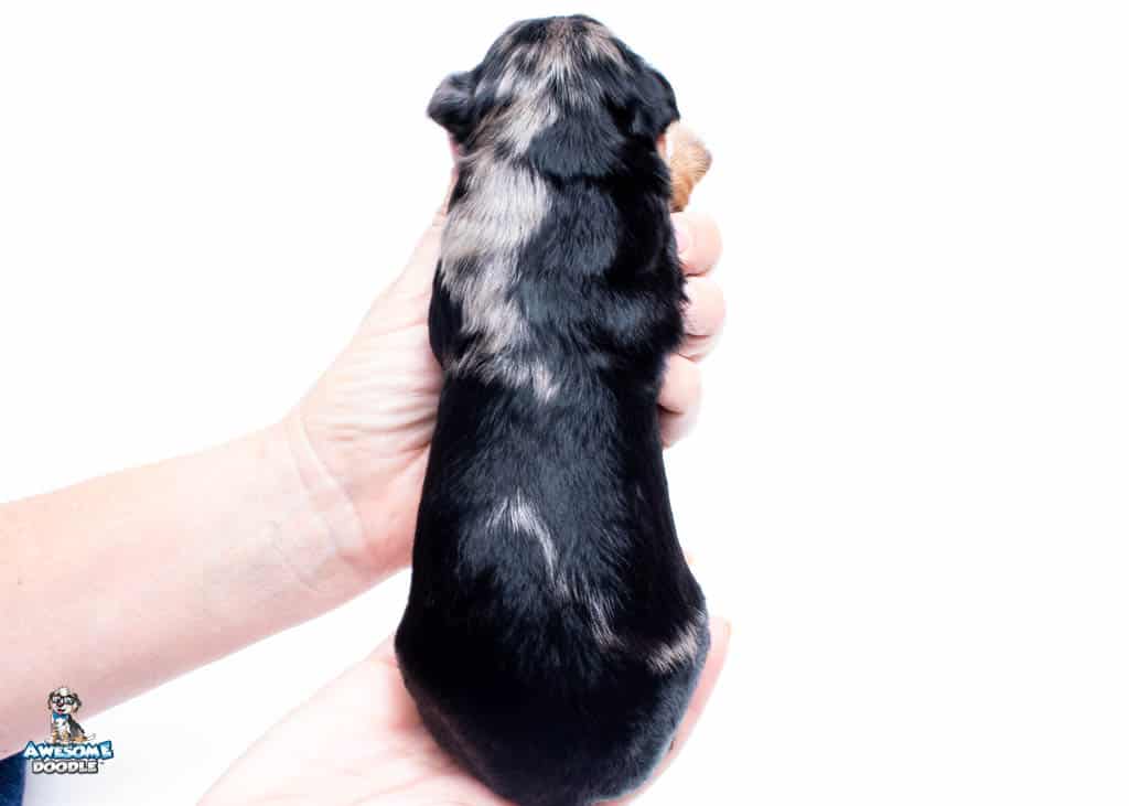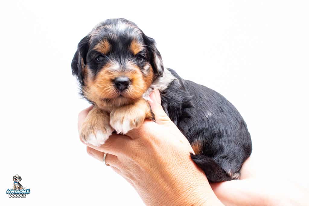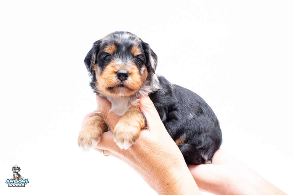 Loretta is a female Phantom Blue Merle F1 AussieDoodle puppy.