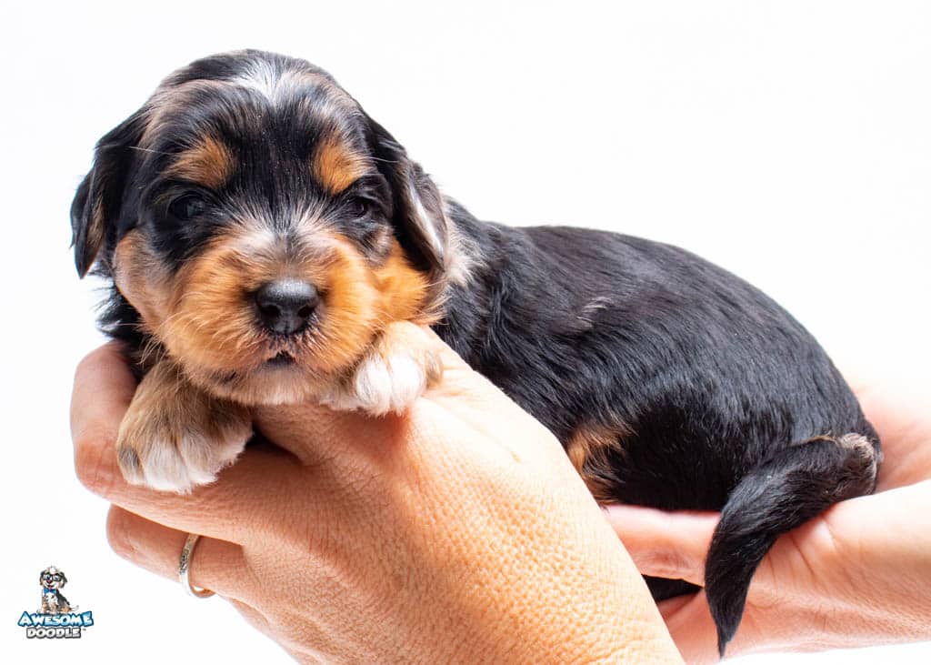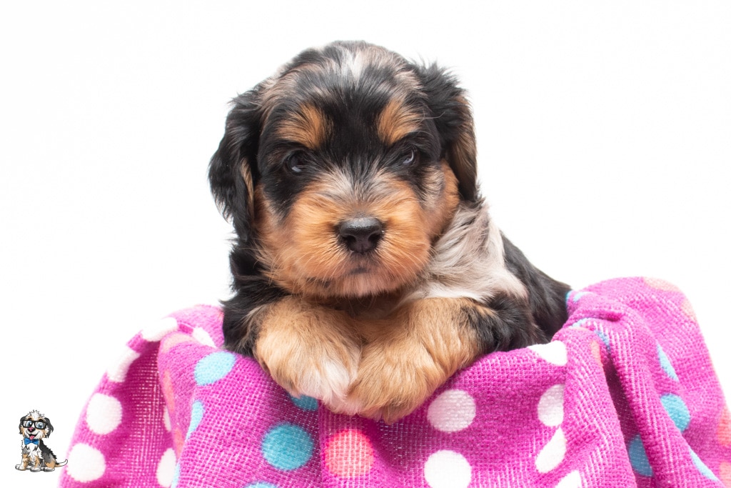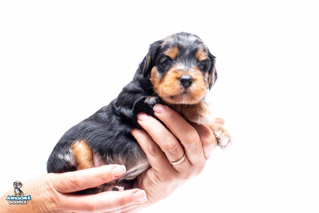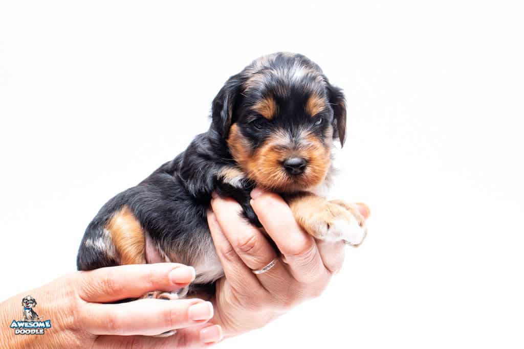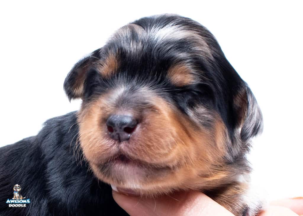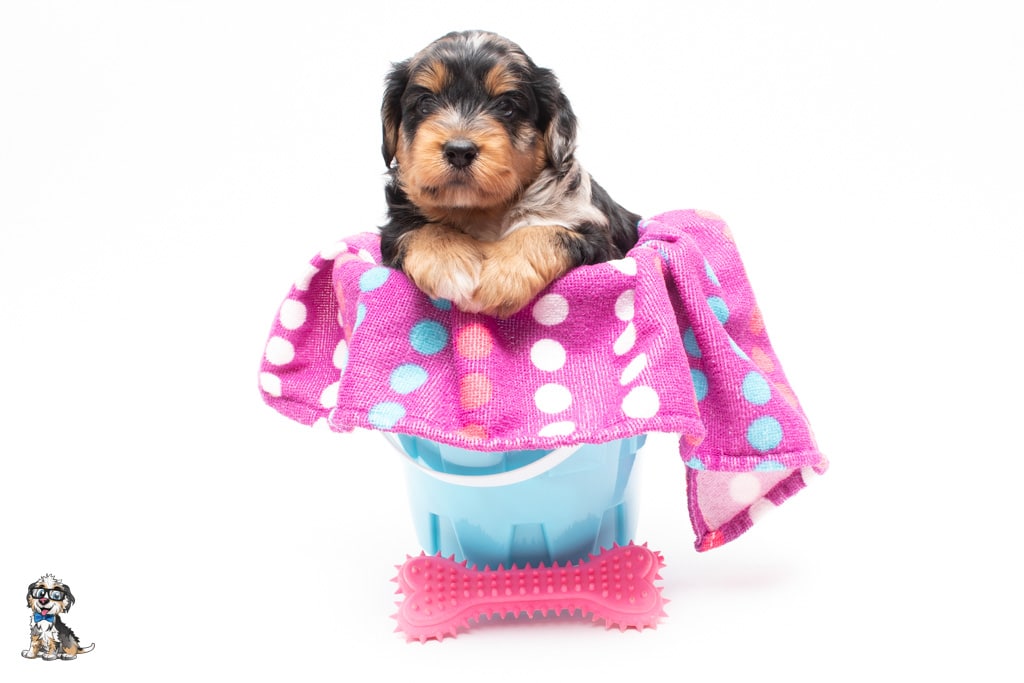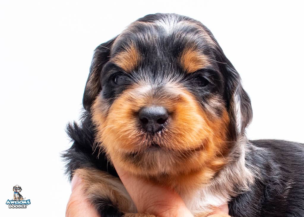 Loretta is a female Phantom Blue Merle F1 AussieDoodle puppy.