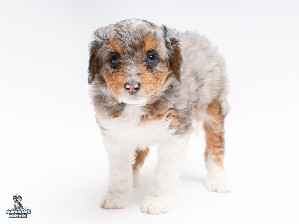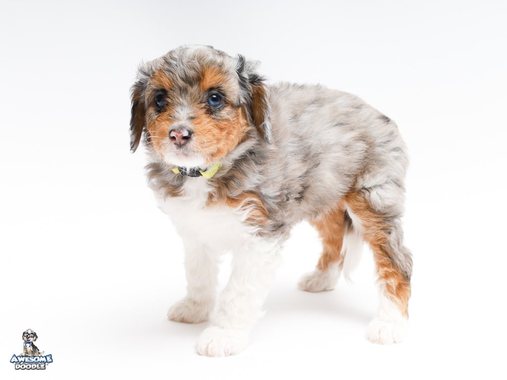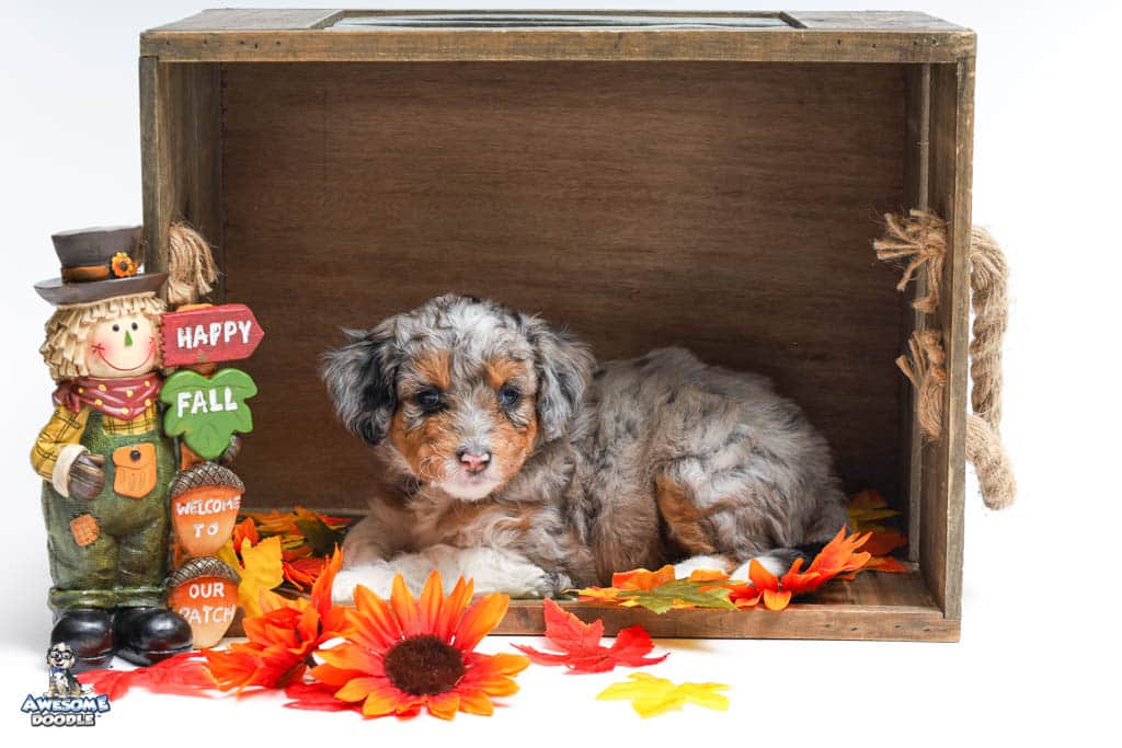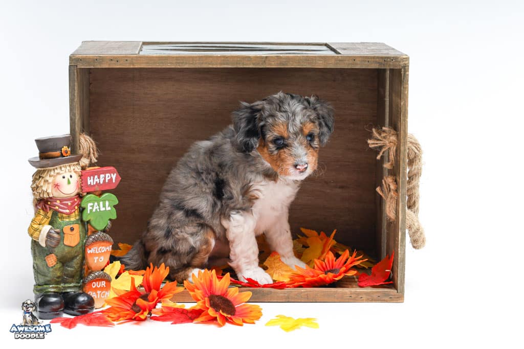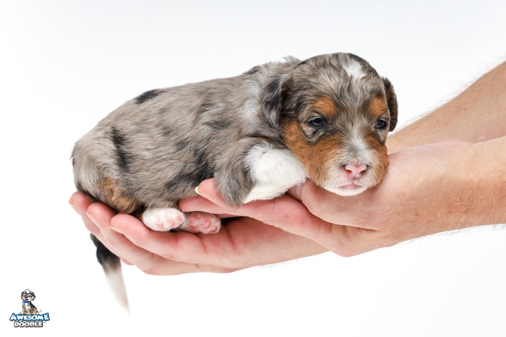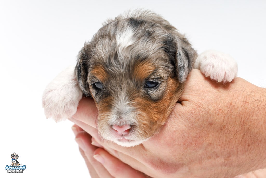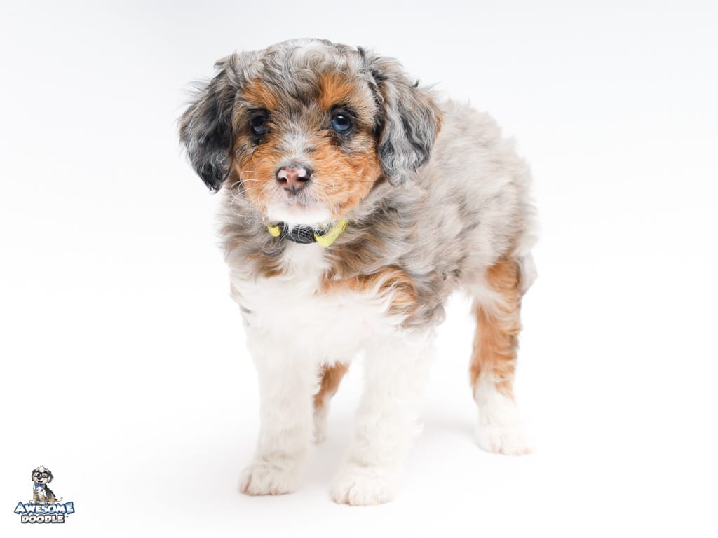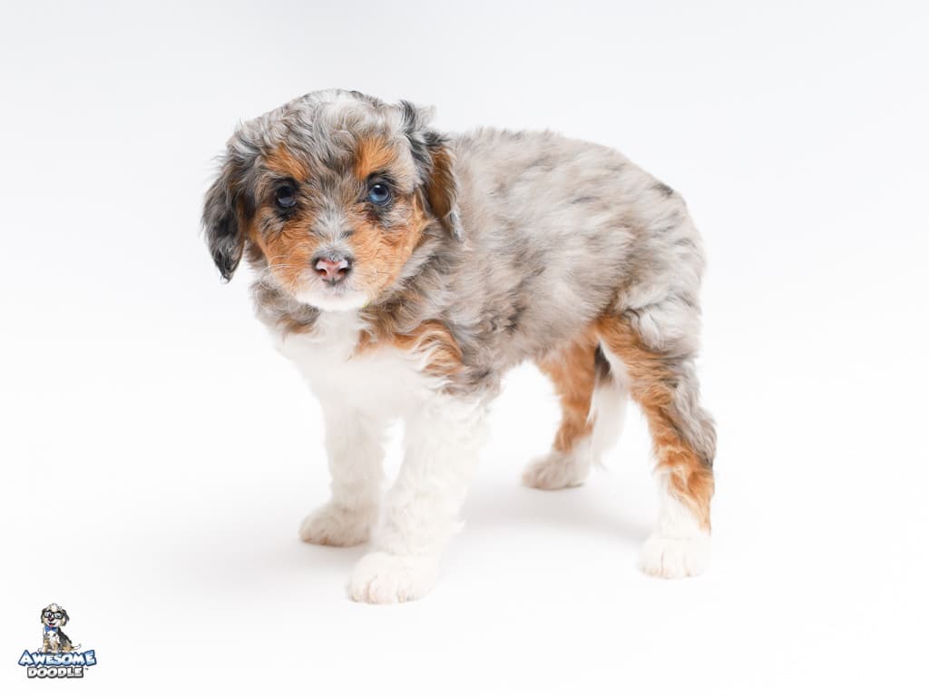 Nova is a female Blue Merle w/ White & Copper F1 AussieDoodle puppy.