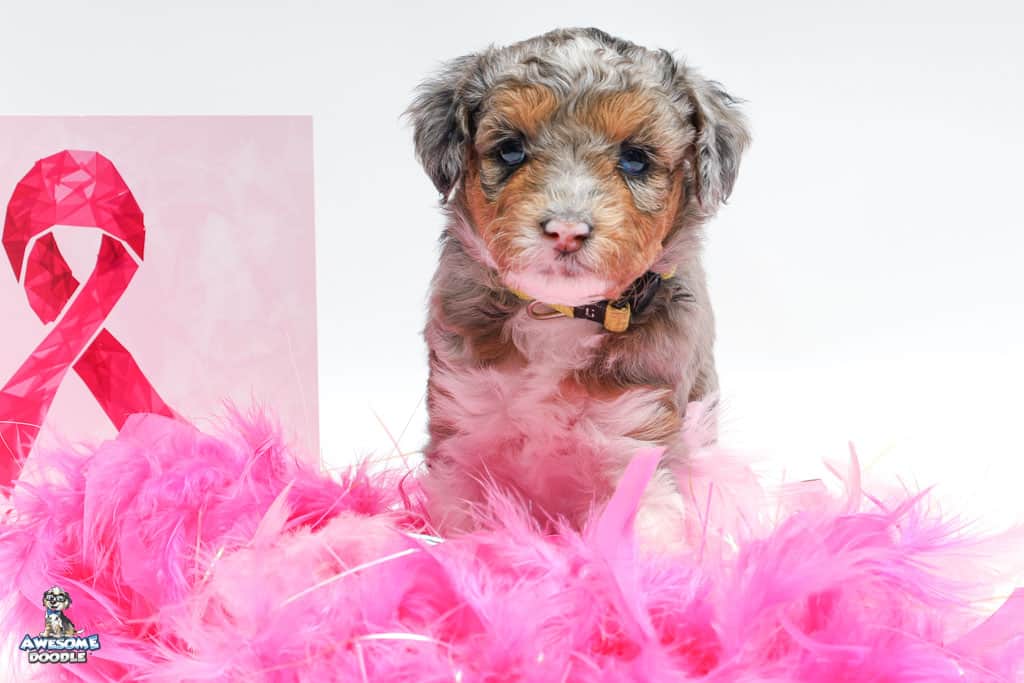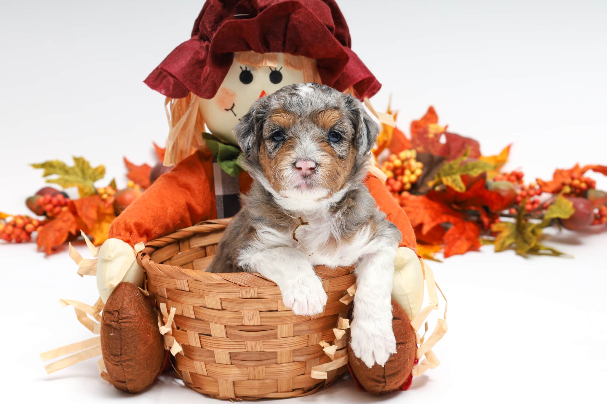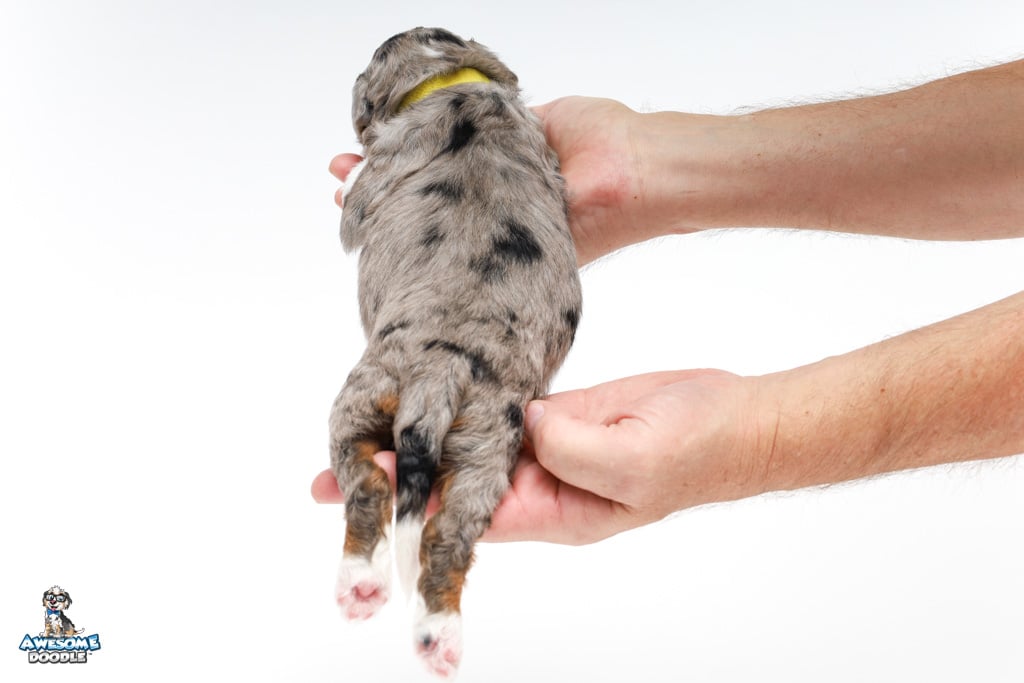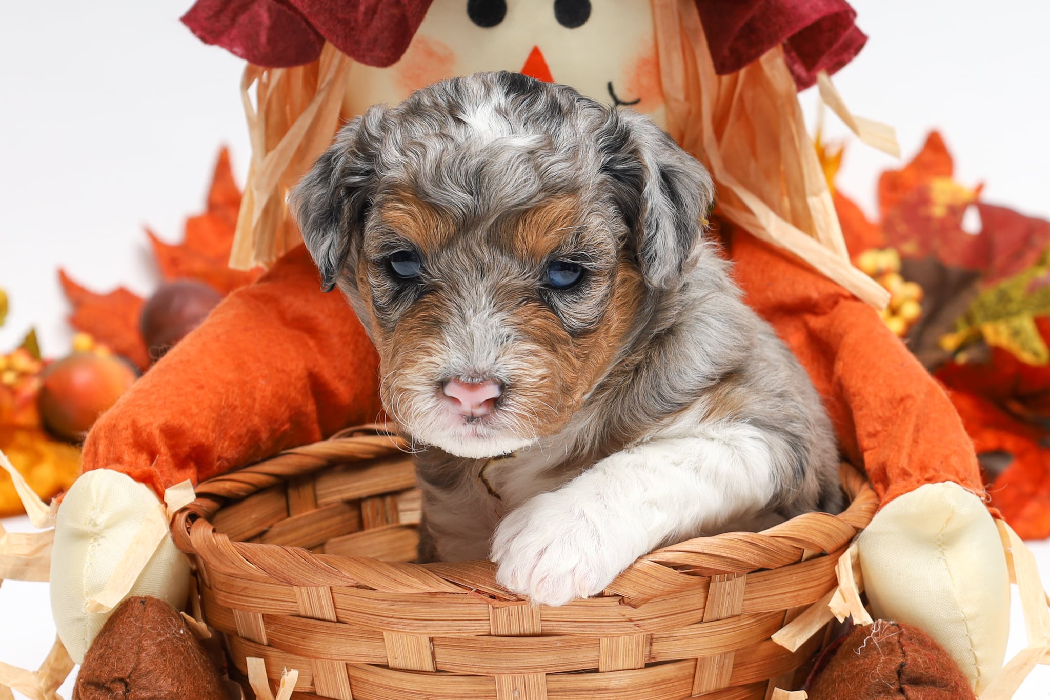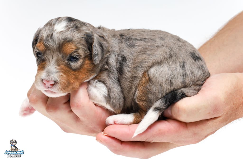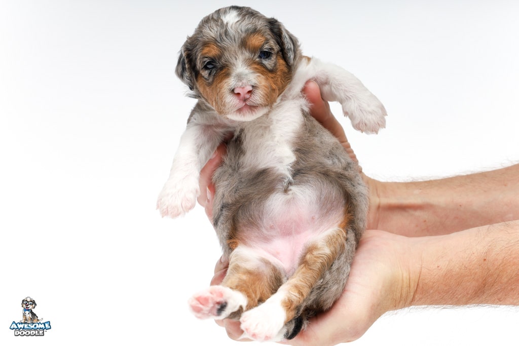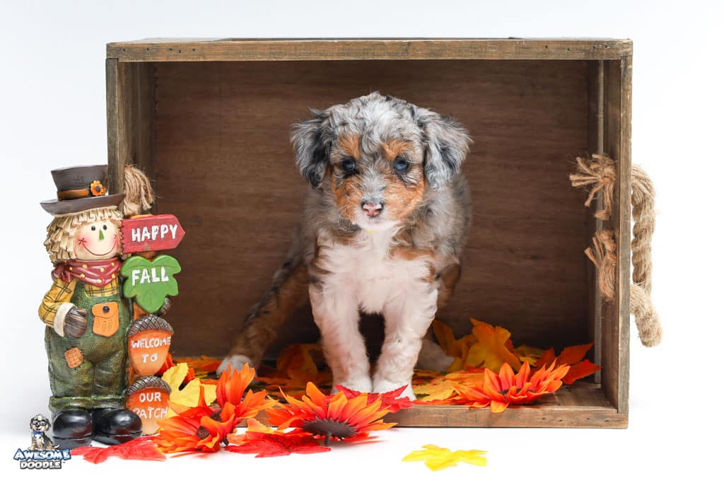 Nova is a female Blue Merle w/ White & Copper F1 AussieDoodle puppy.