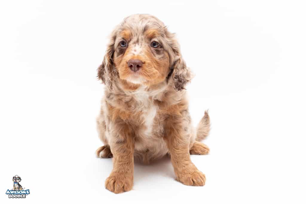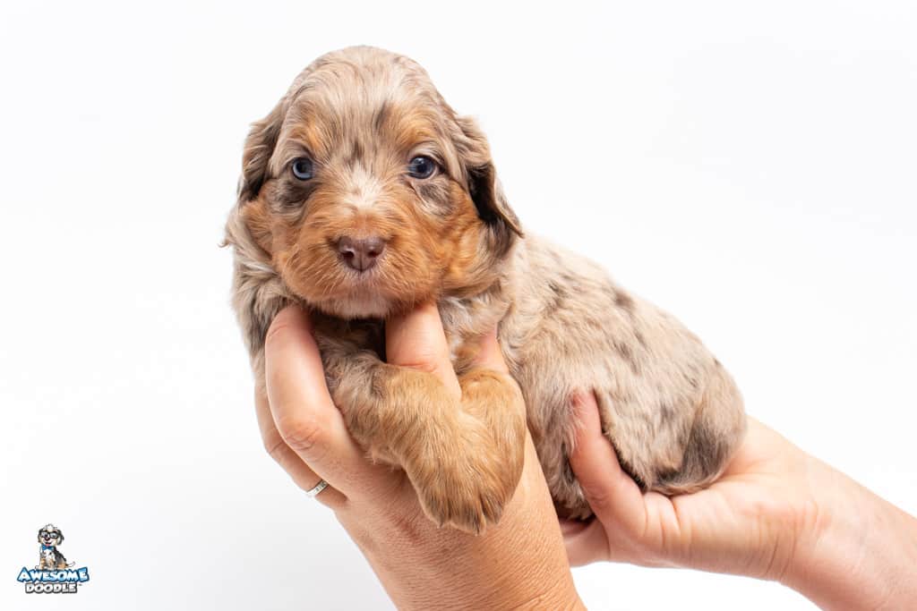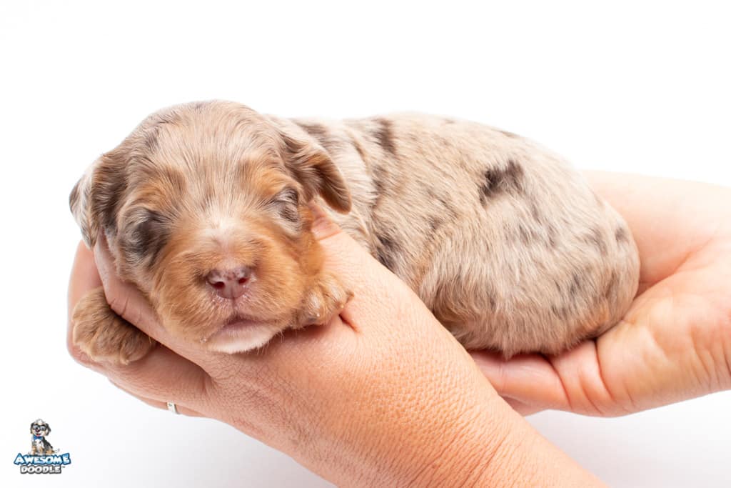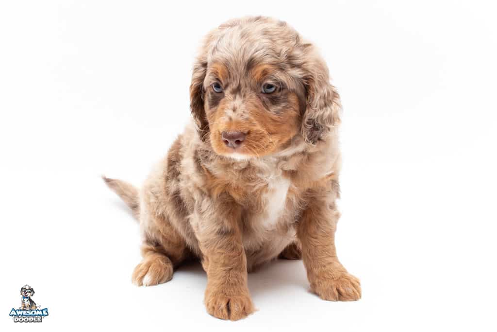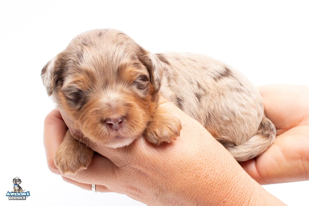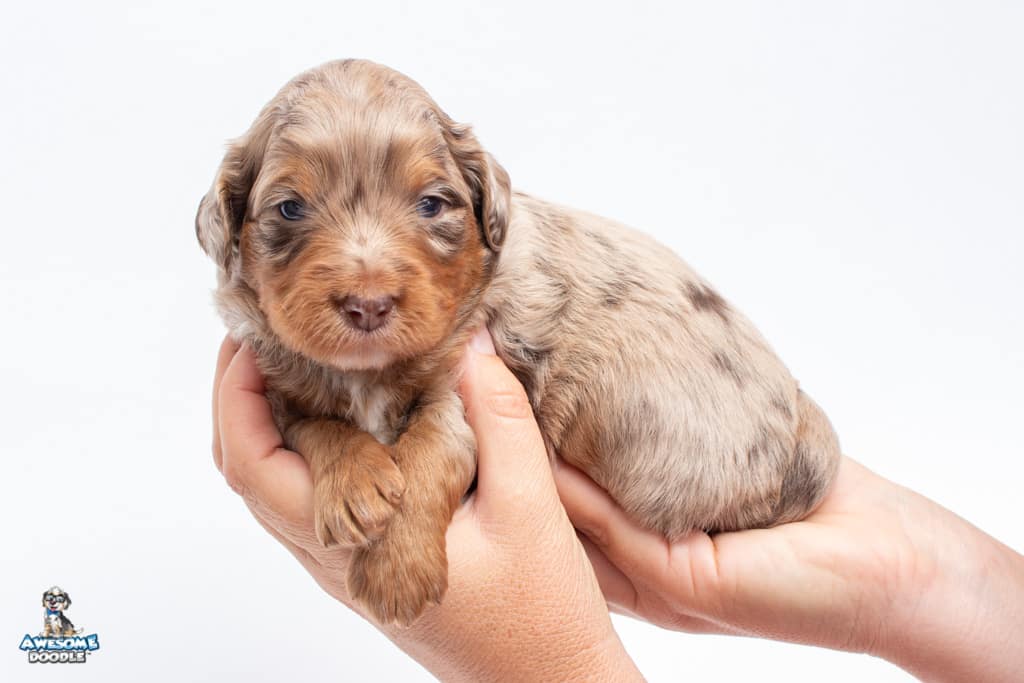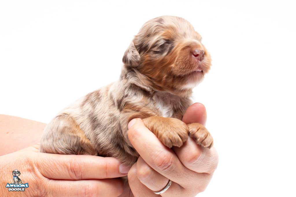 Ella is a female Phantom Chocolate Merle F1 AussieDoodle puppy.