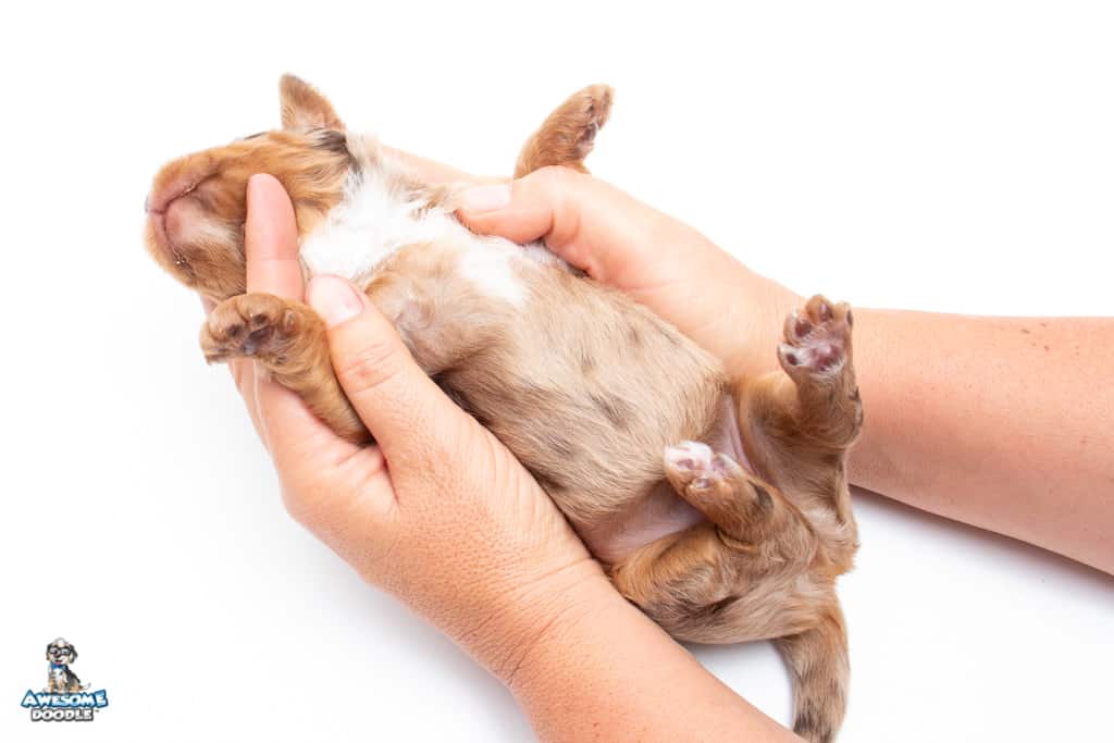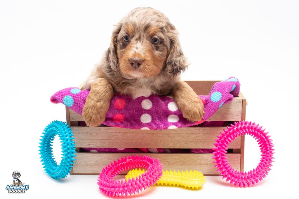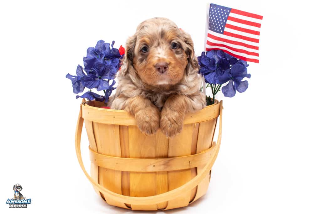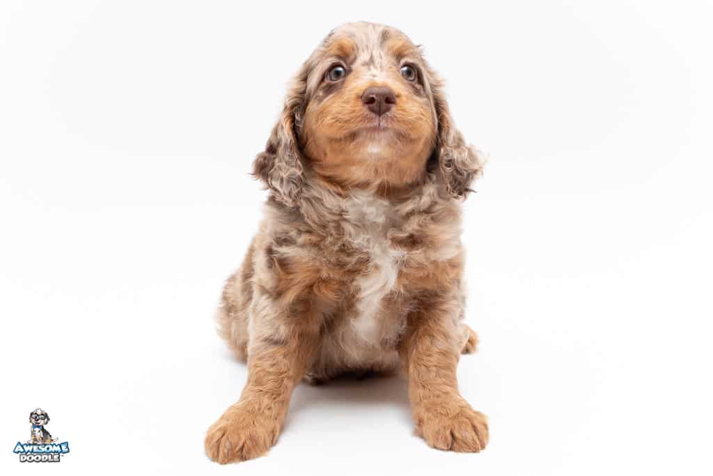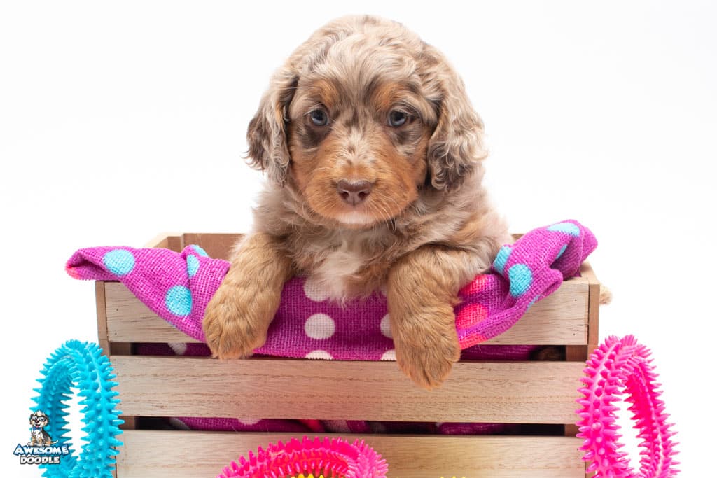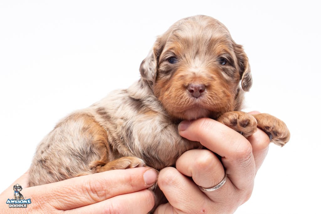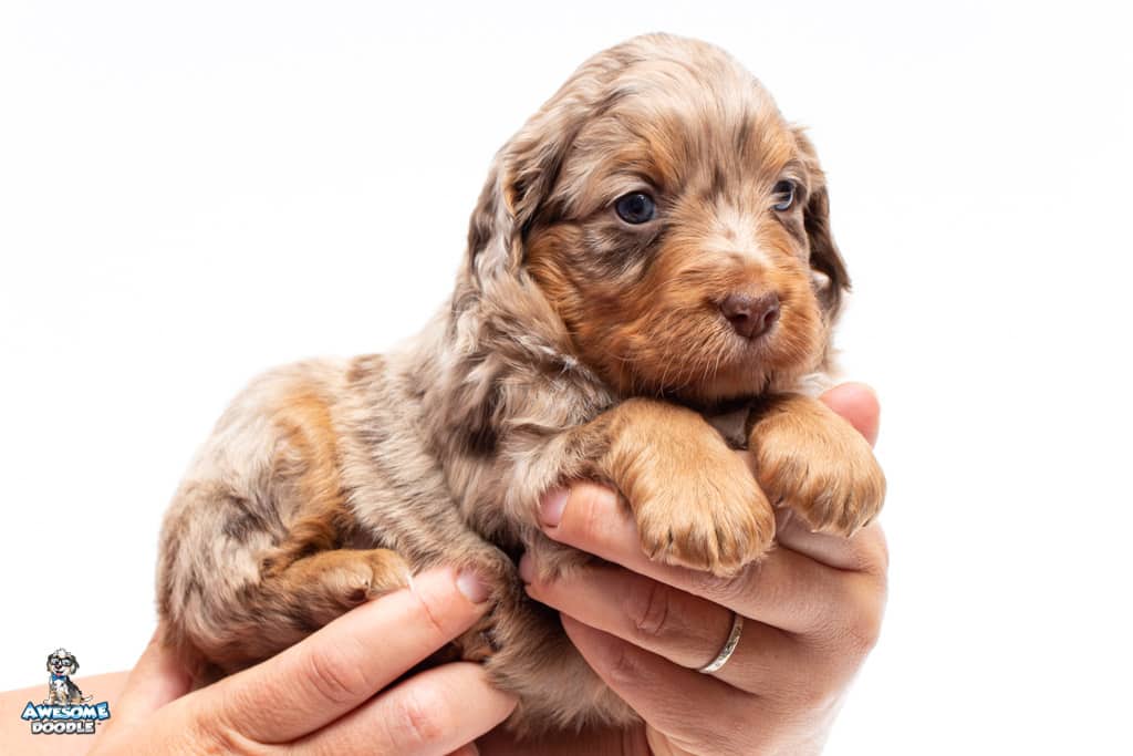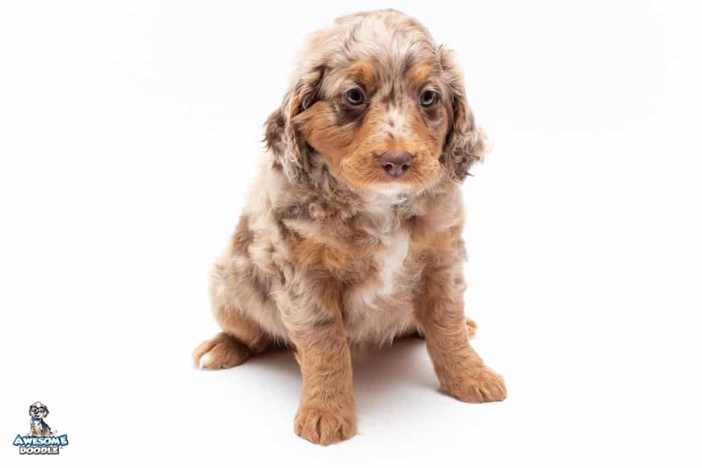 Ella is a female Phantom Chocolate Merle F1 AussieDoodle puppy.