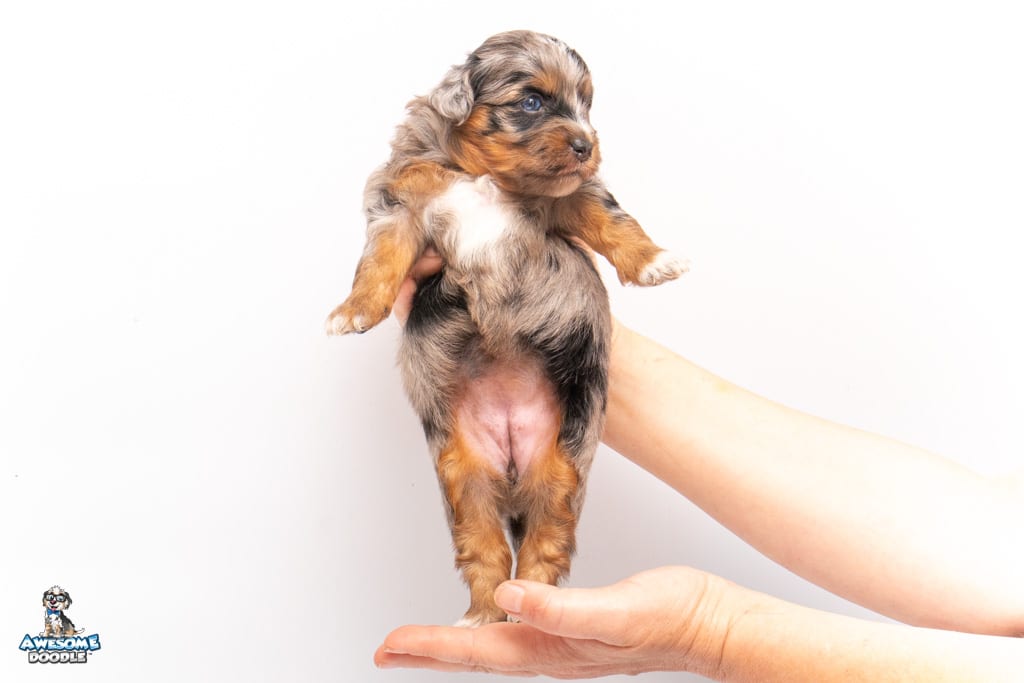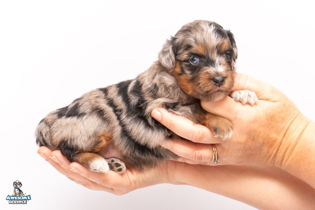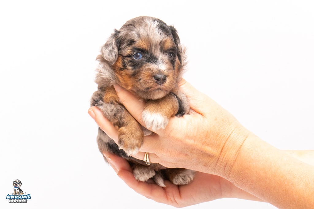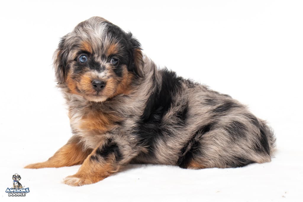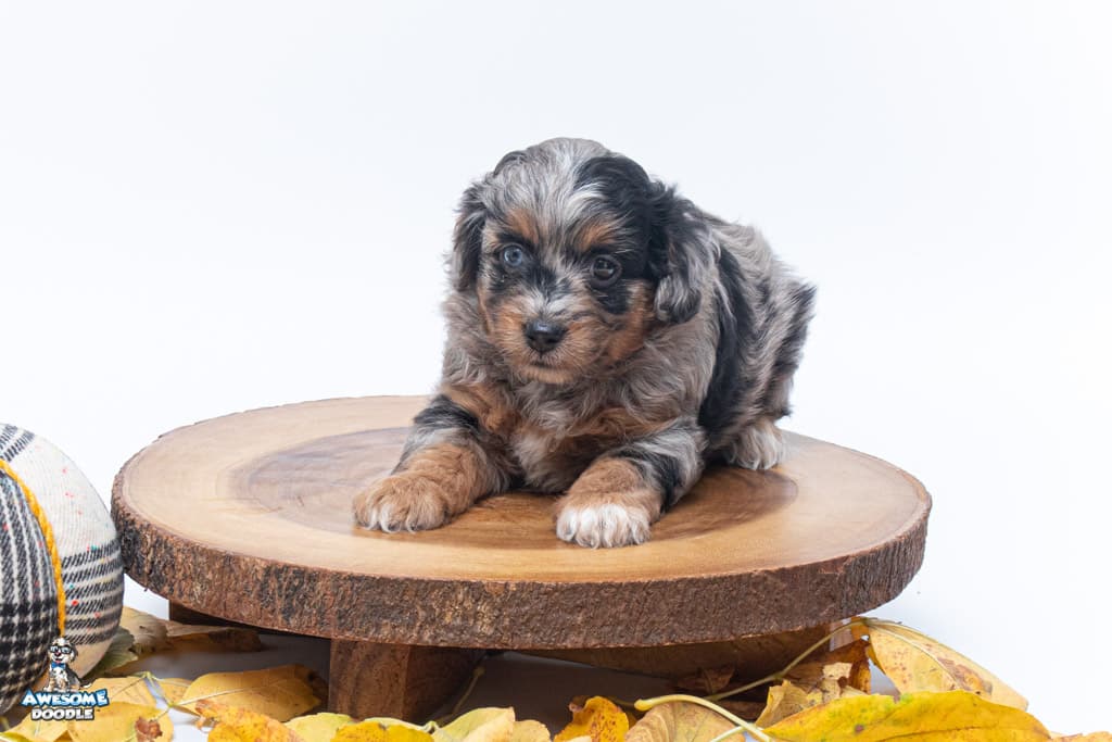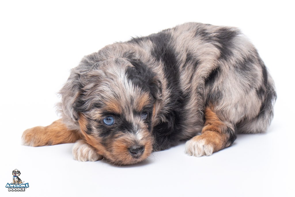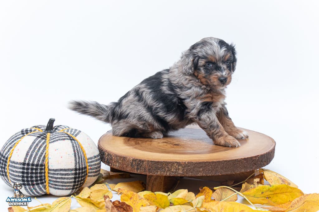 Maple is a female Phantom Blue Merle F1 AussieDoodle puppy.