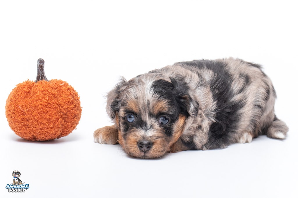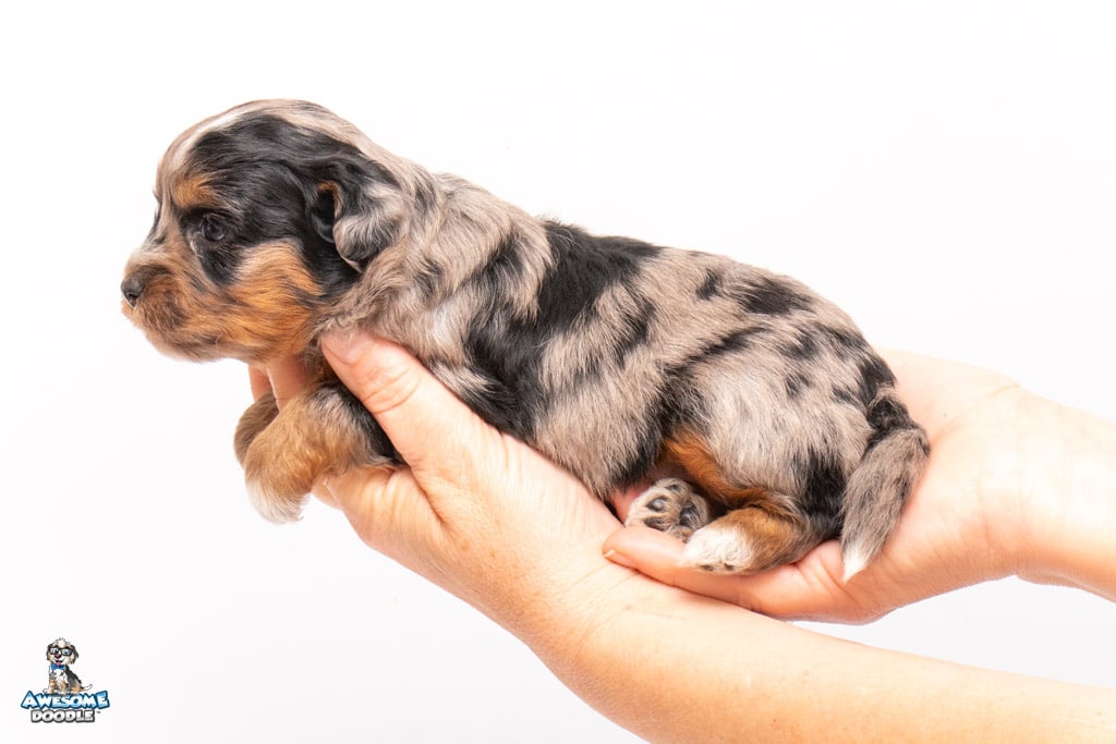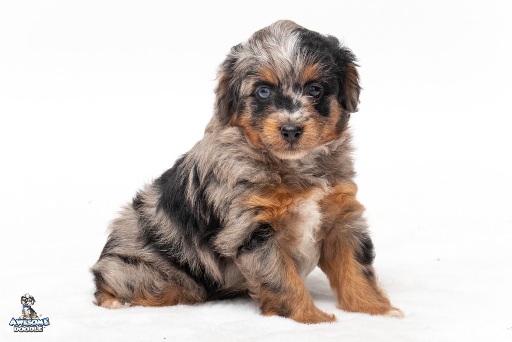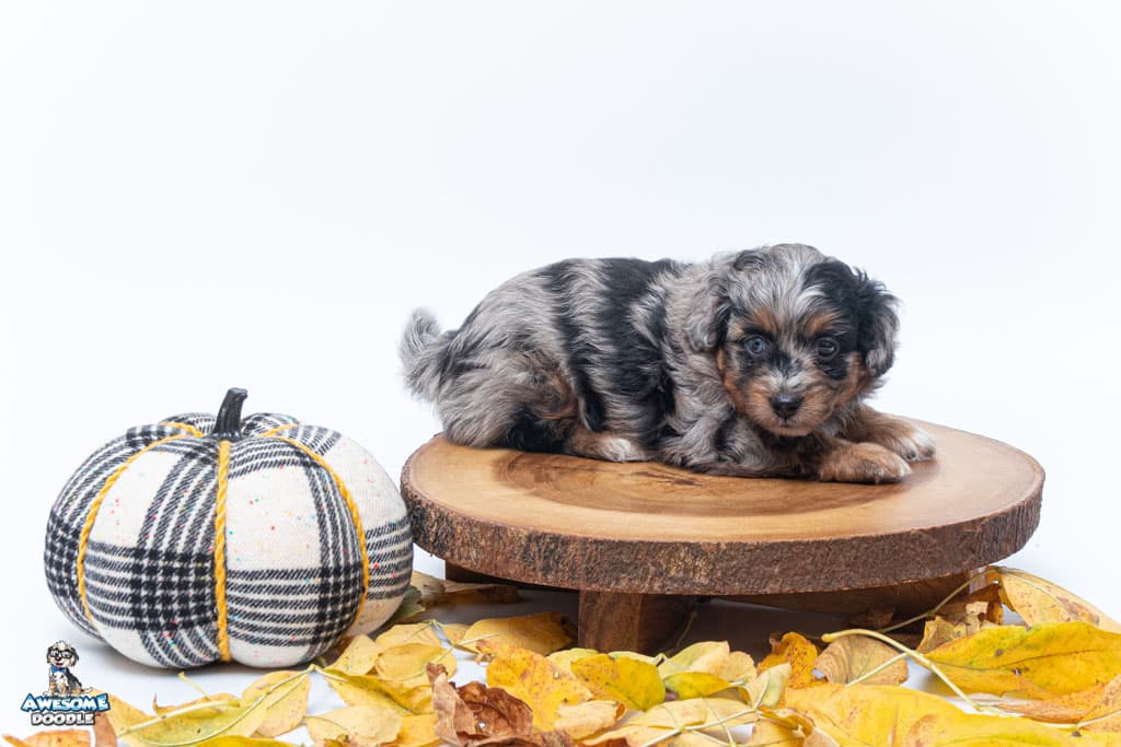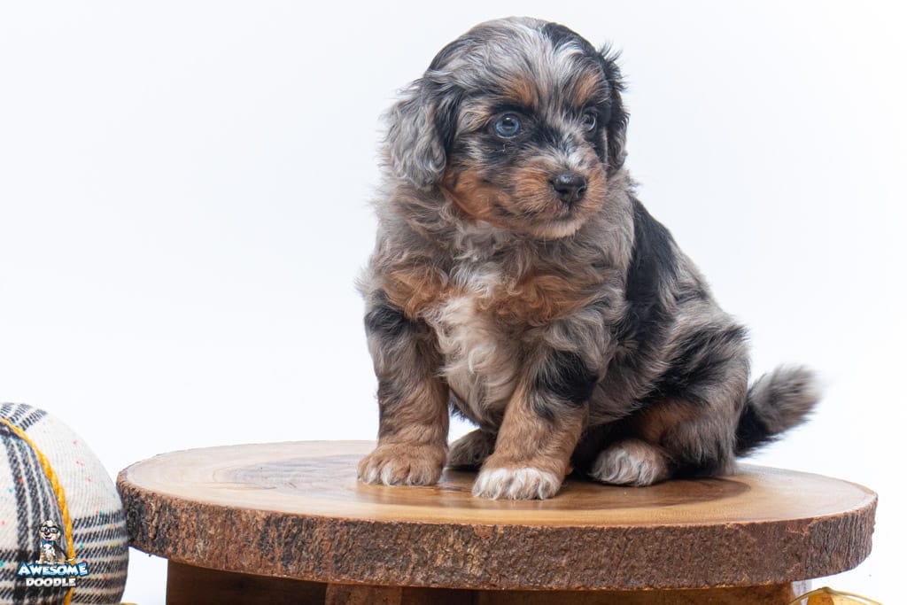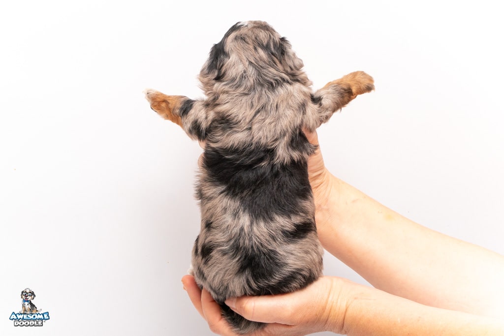 Maple is a female Phantom Blue Merle F1 AussieDoodle puppy.
