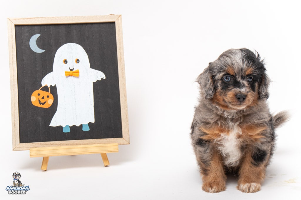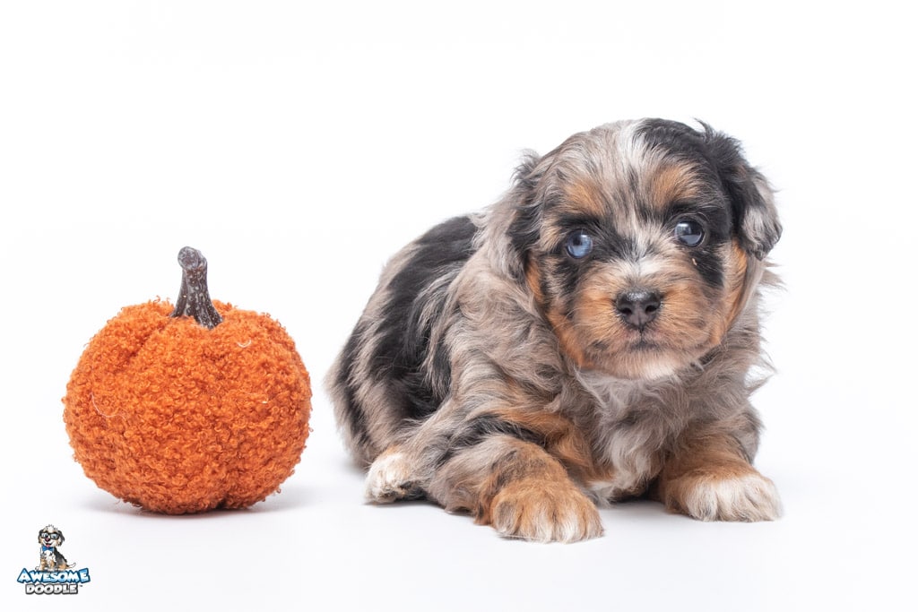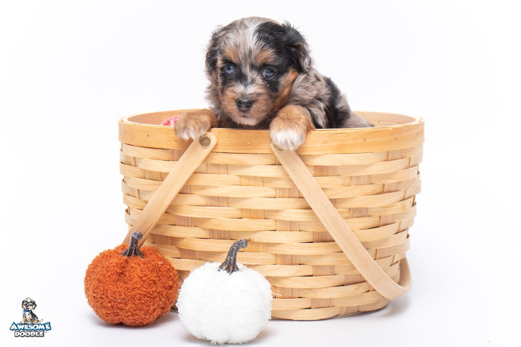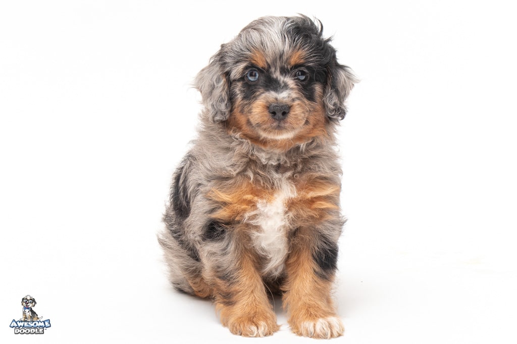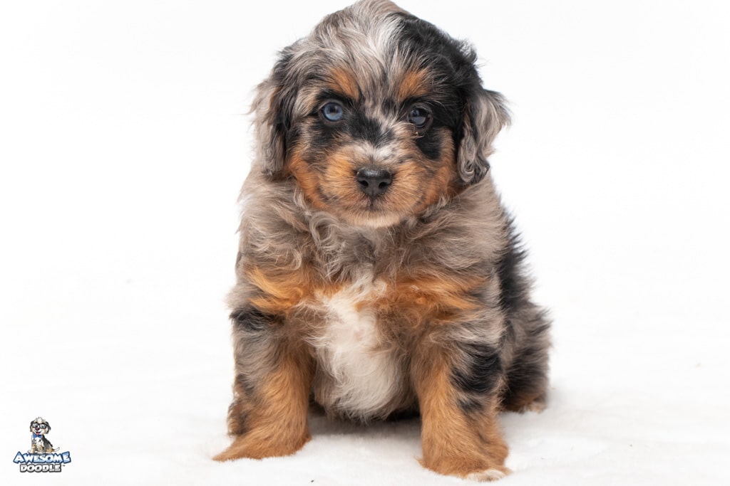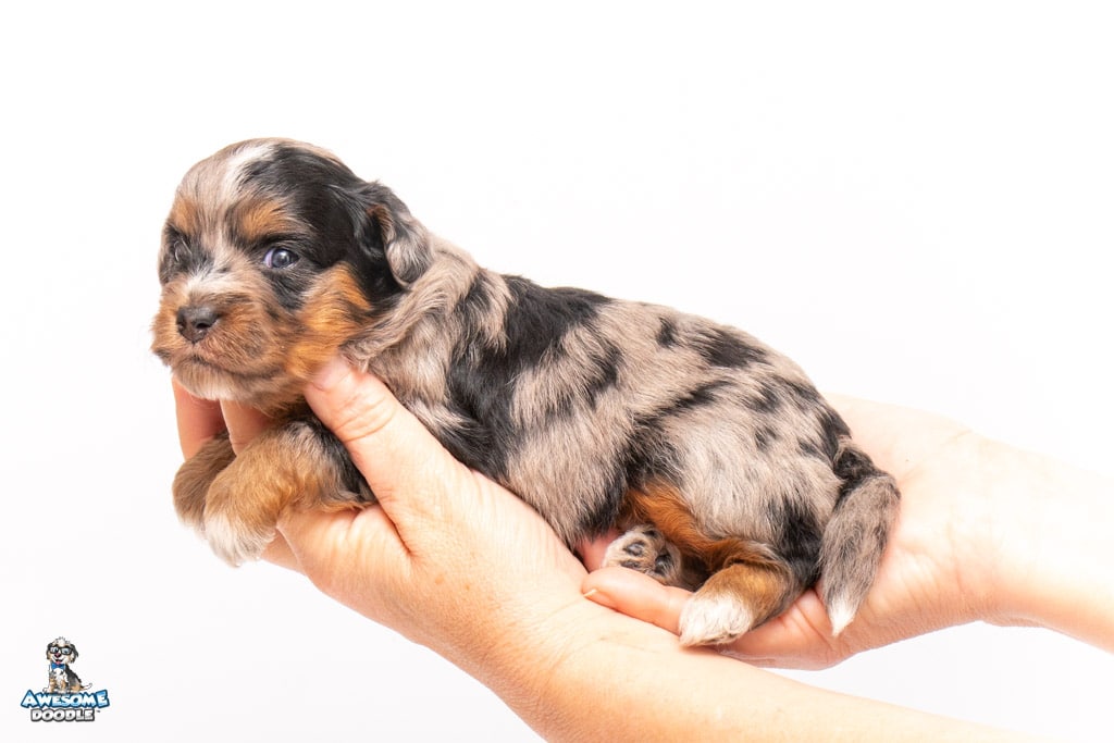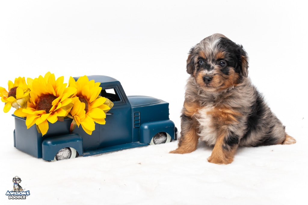 Maple is a female Phantom Blue Merle F1 AussieDoodle puppy.