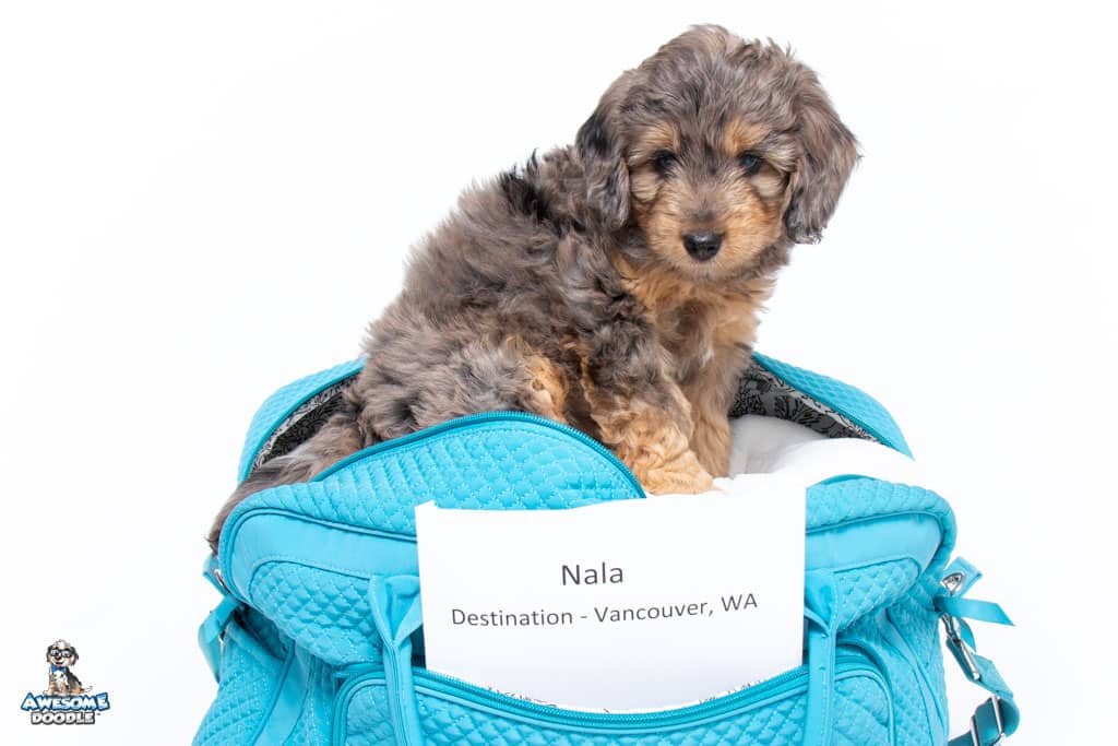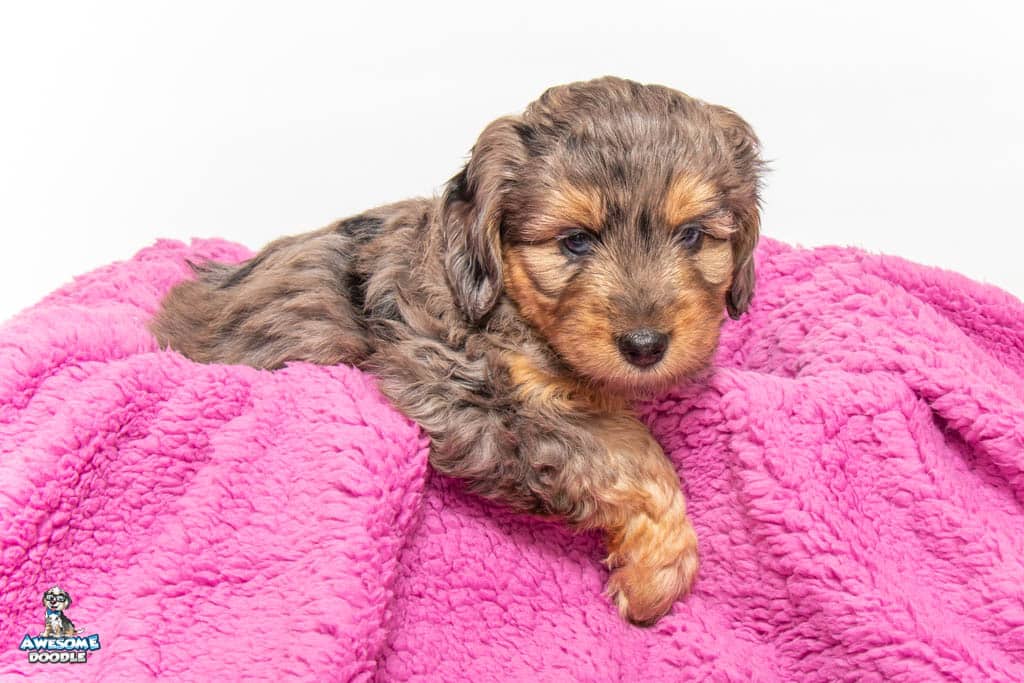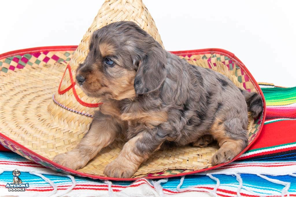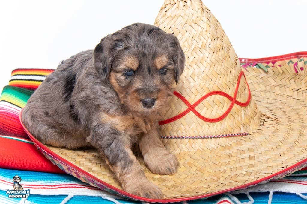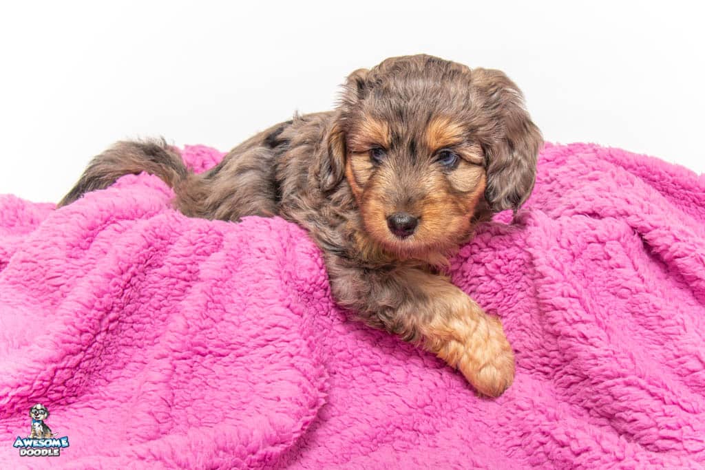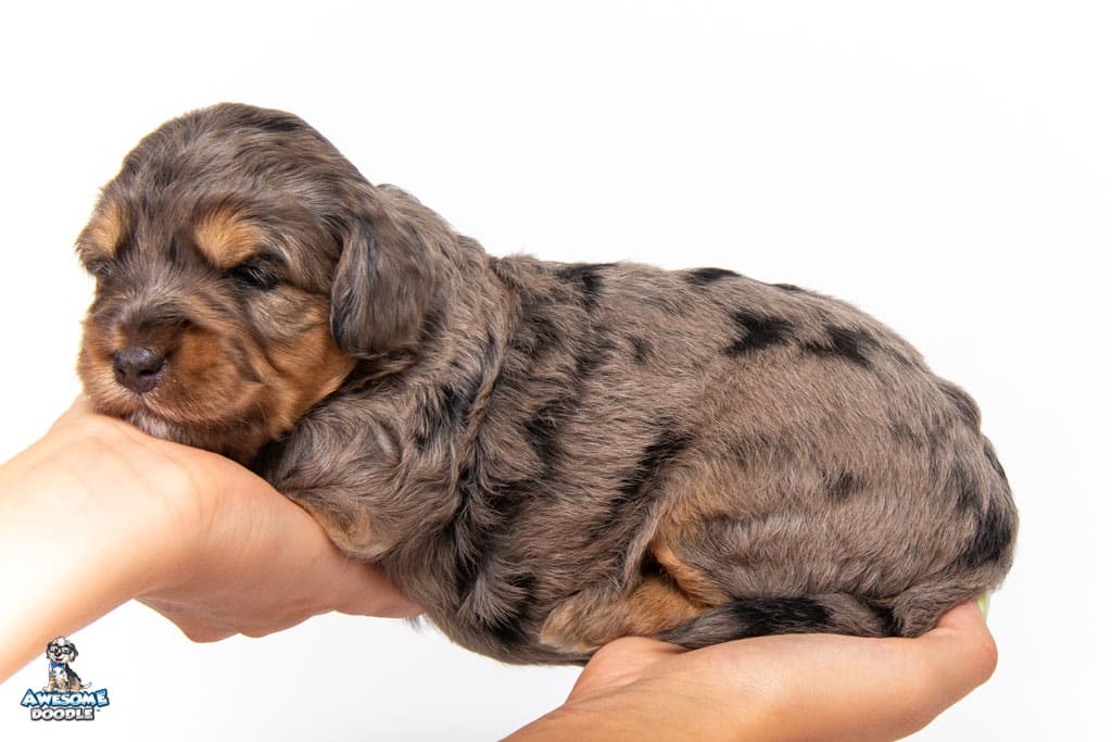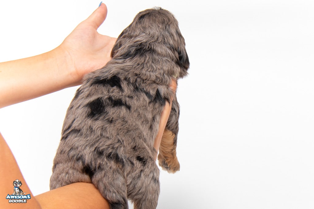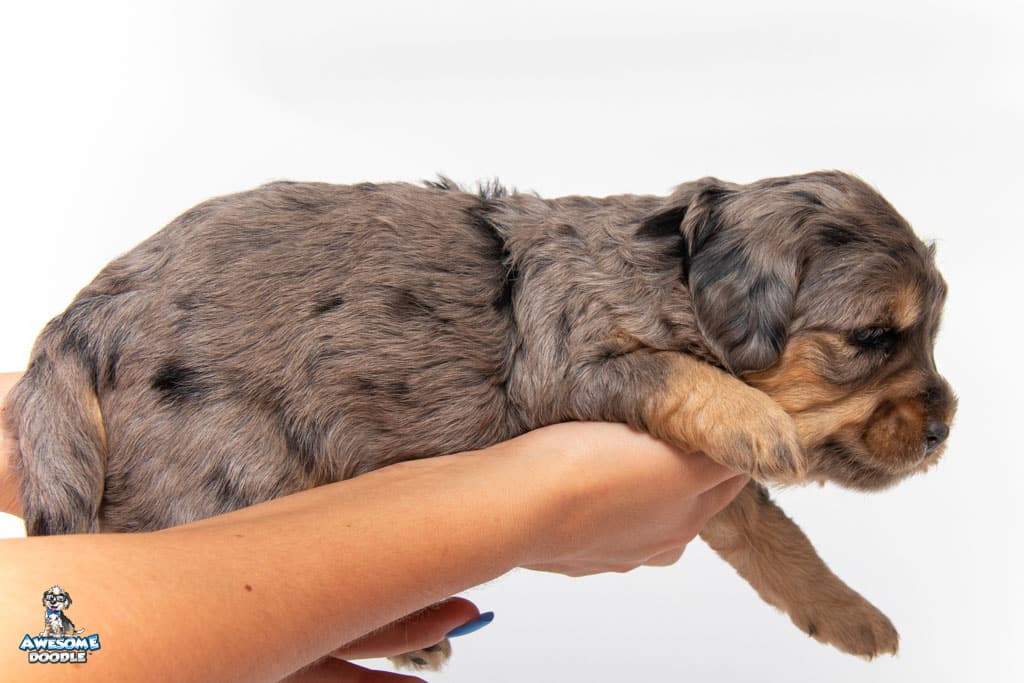 Nala is a female Phantom Blue Merle F1 AussieDoodle puppy.