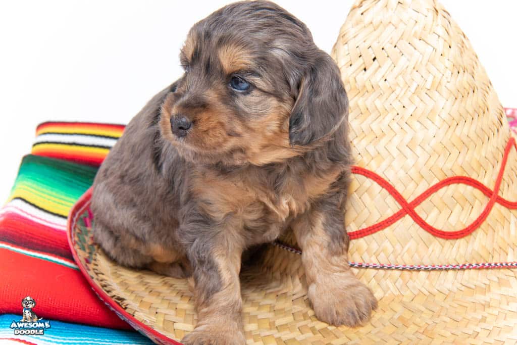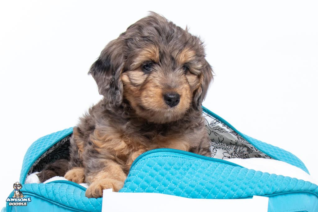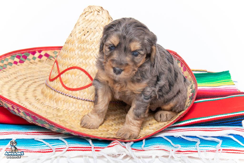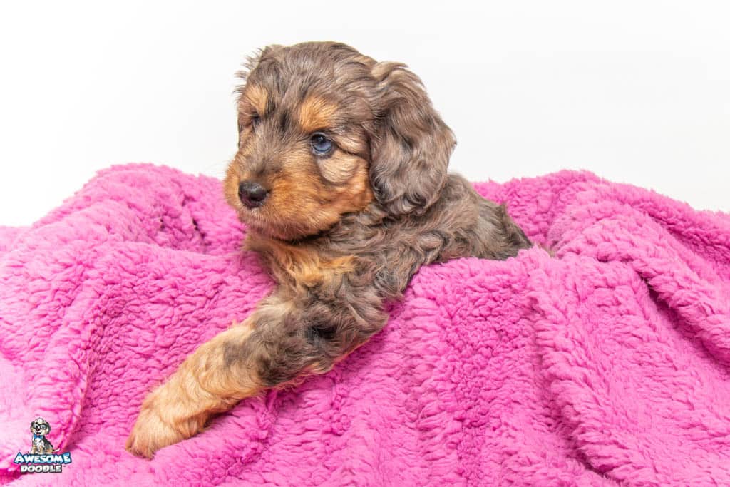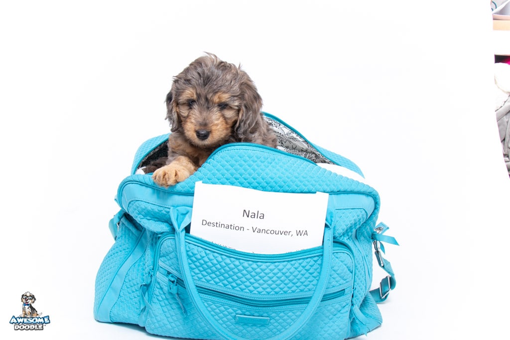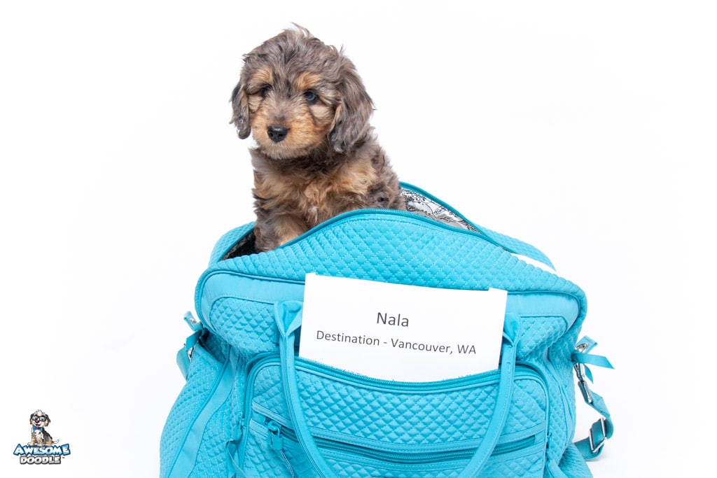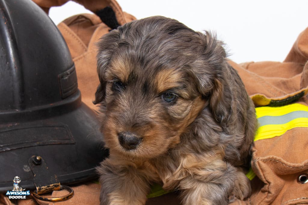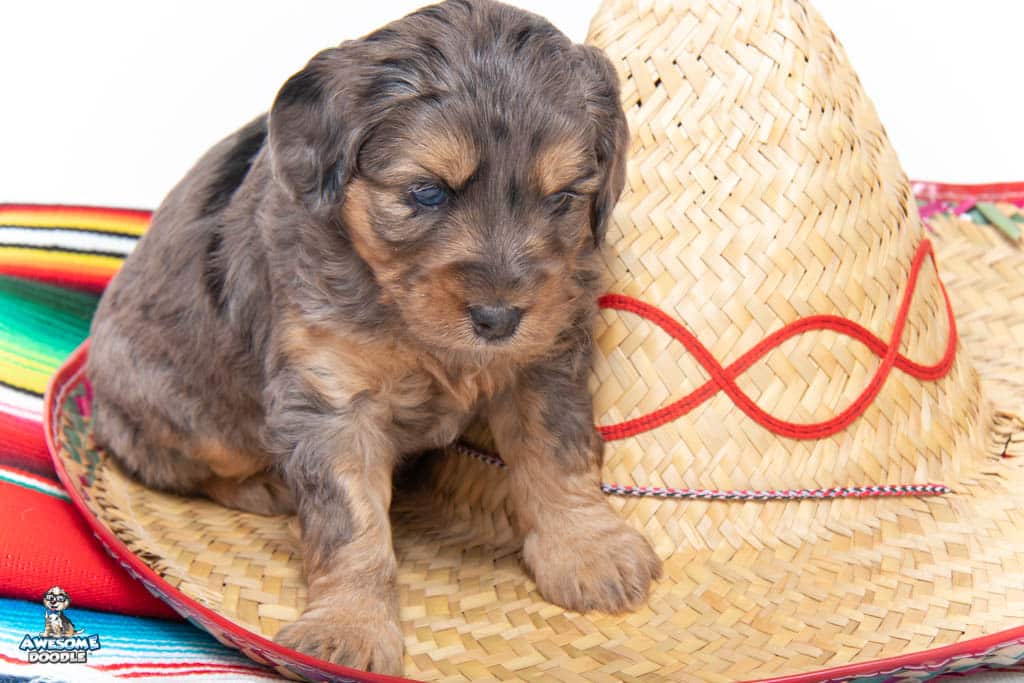 Nala is a female Phantom Blue Merle F1 AussieDoodle puppy.