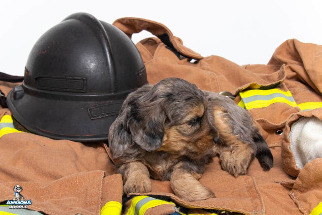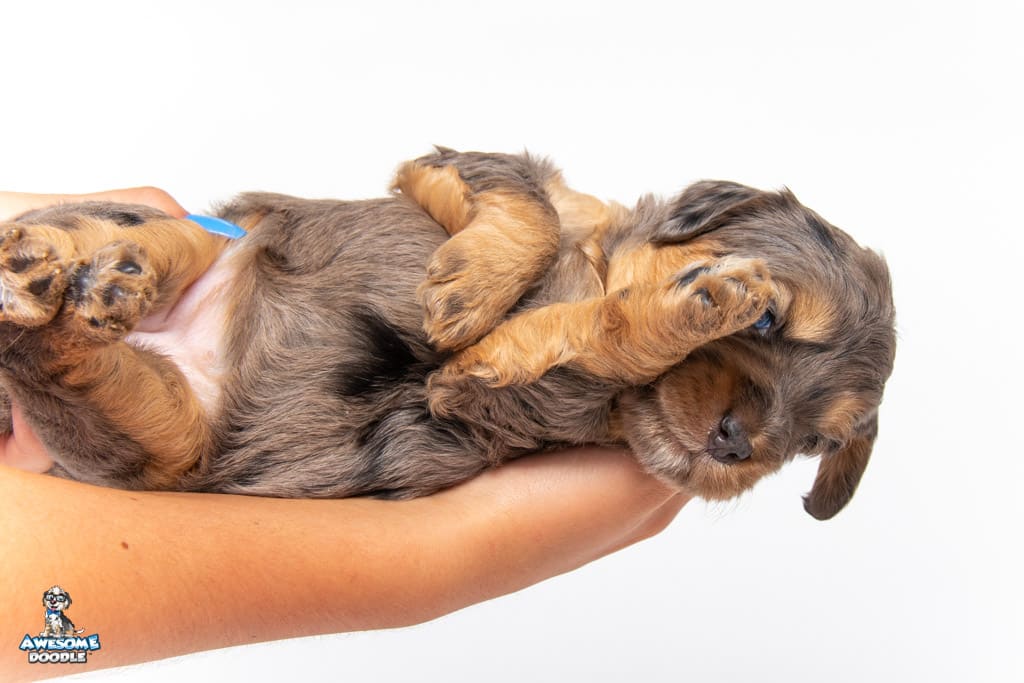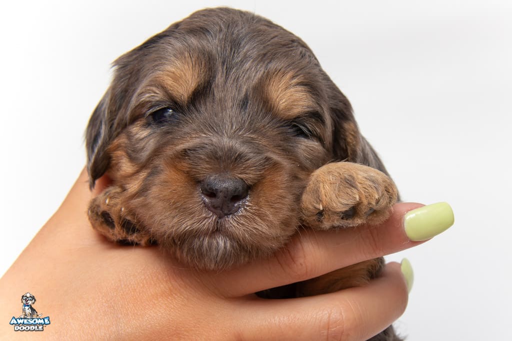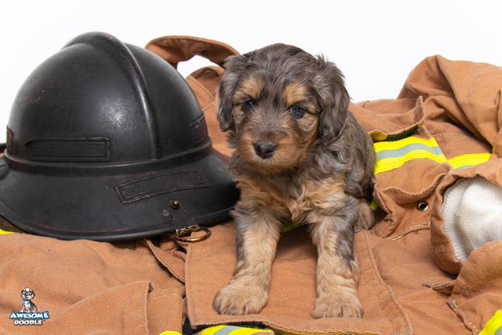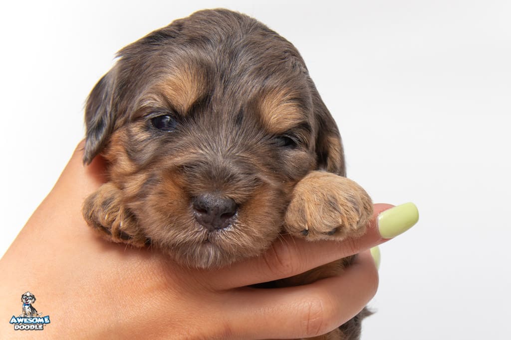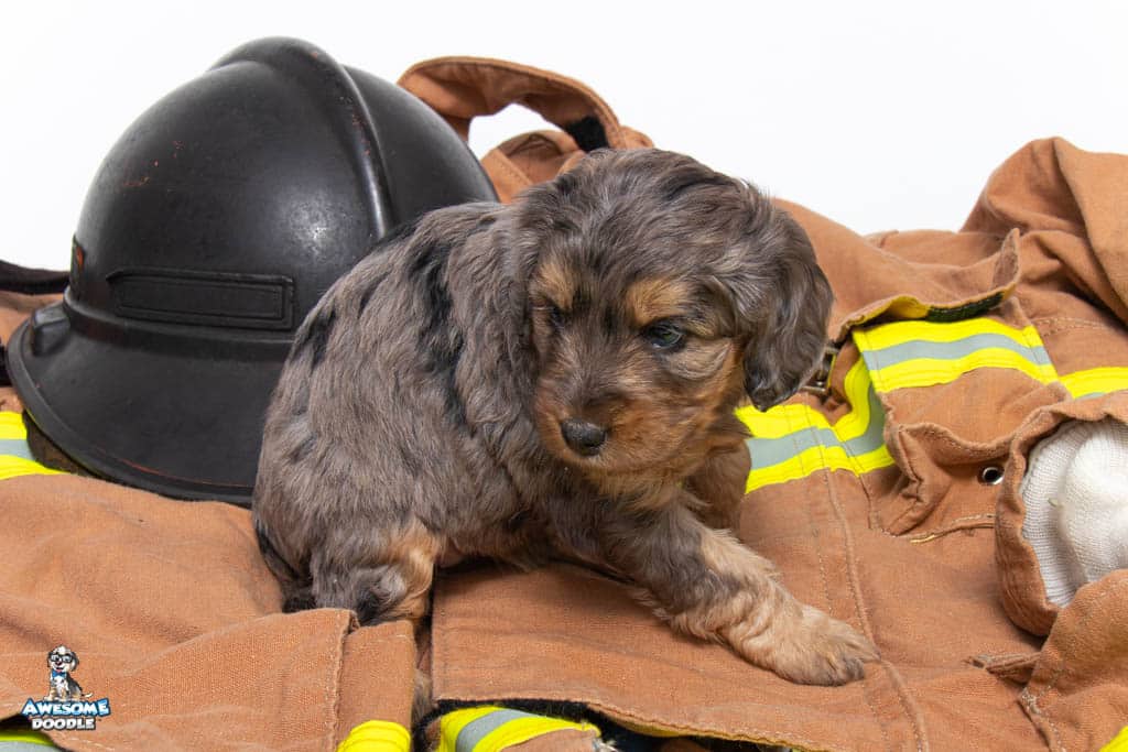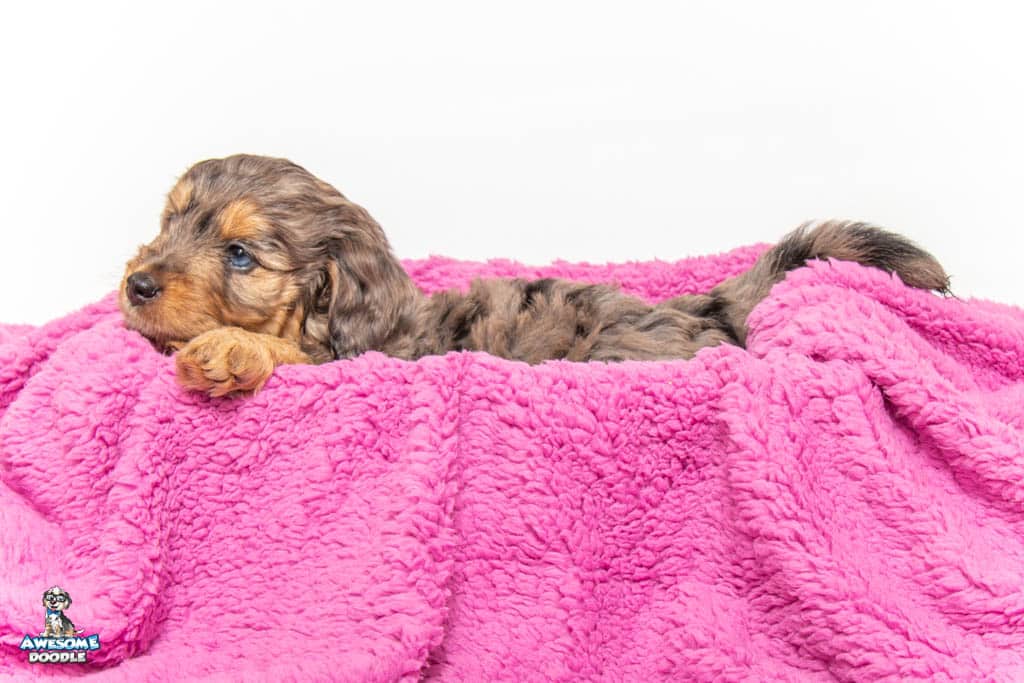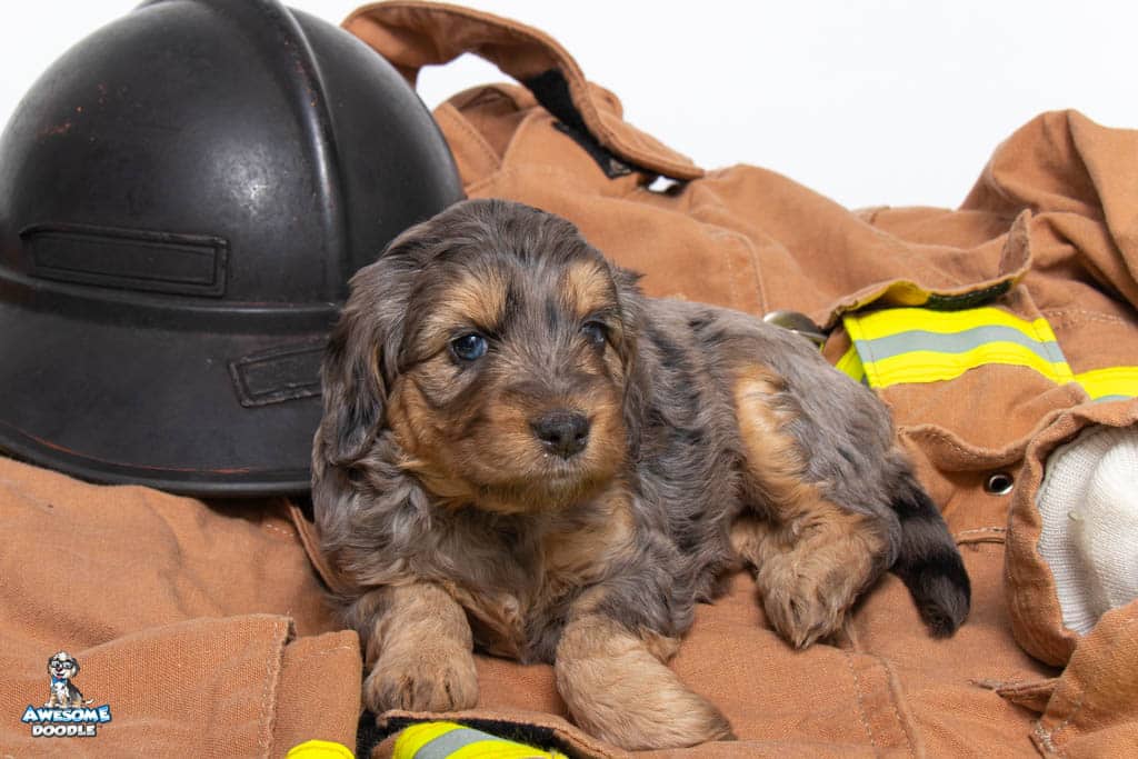 Nala is a female Phantom Blue Merle F1 AussieDoodle puppy.
