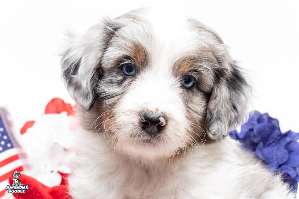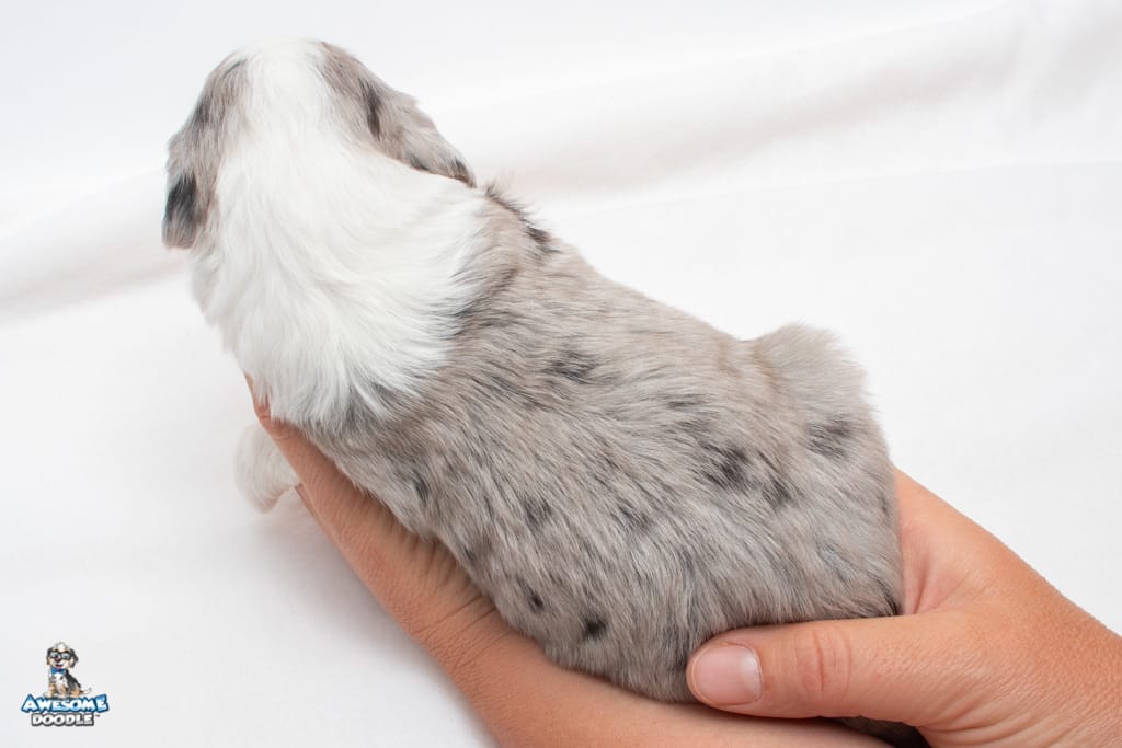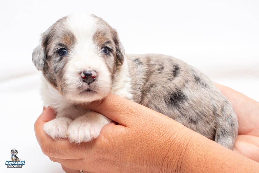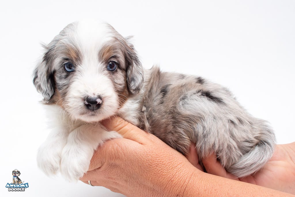 Luca is a male Blue Merle w/ White & Copper F1 AussieDoodle puppy.