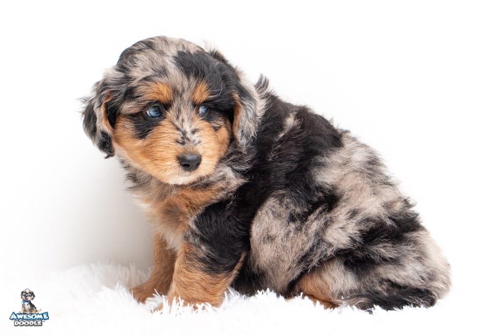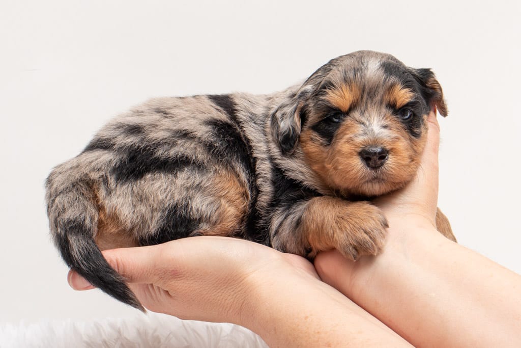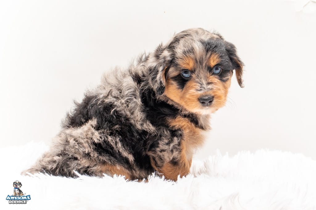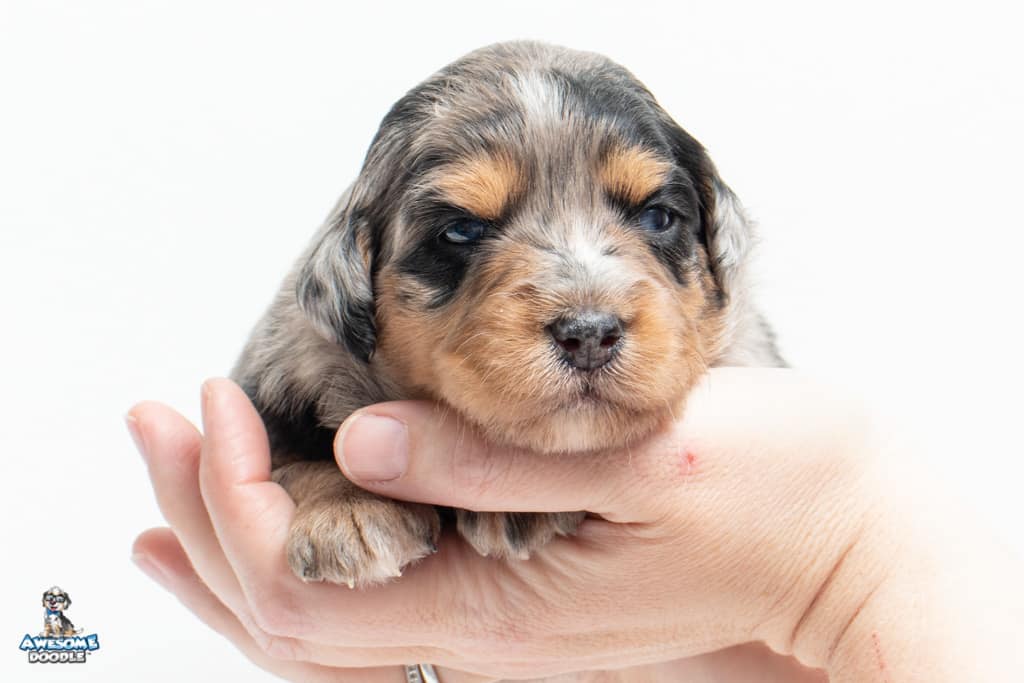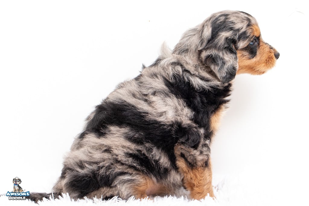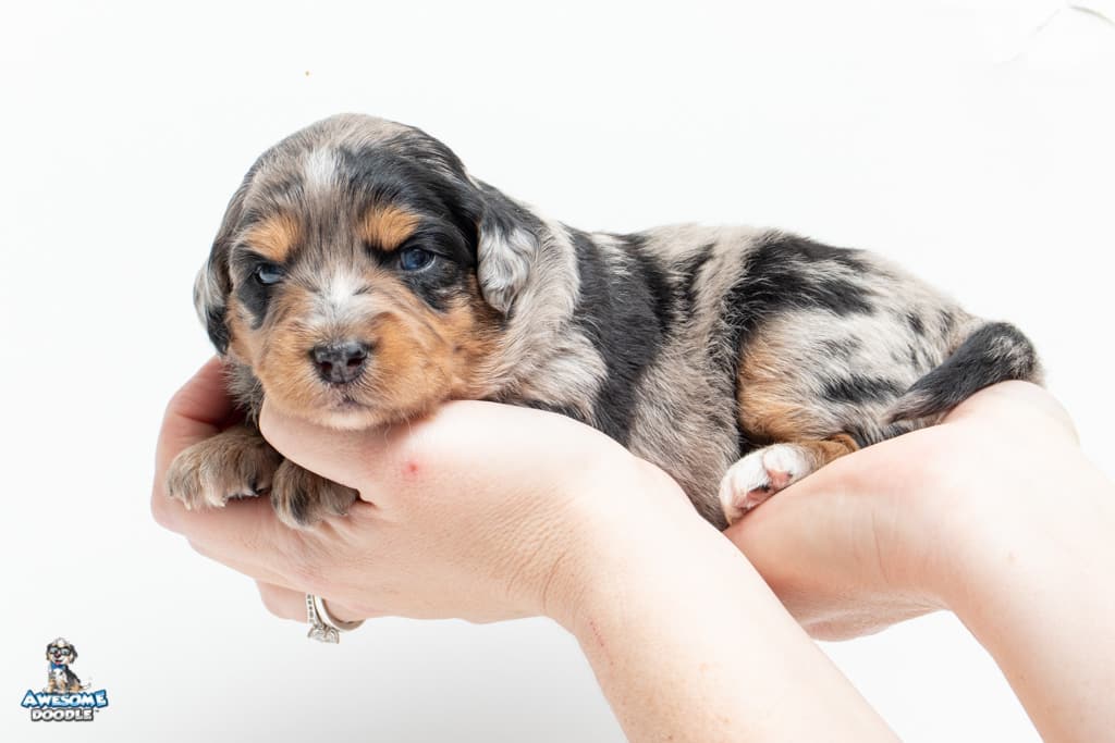 Beyla is a female Phantom Blue Merle F1 AussieDoodle puppy.