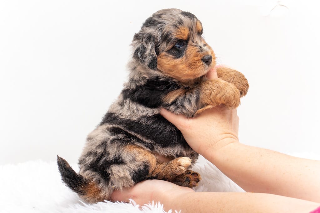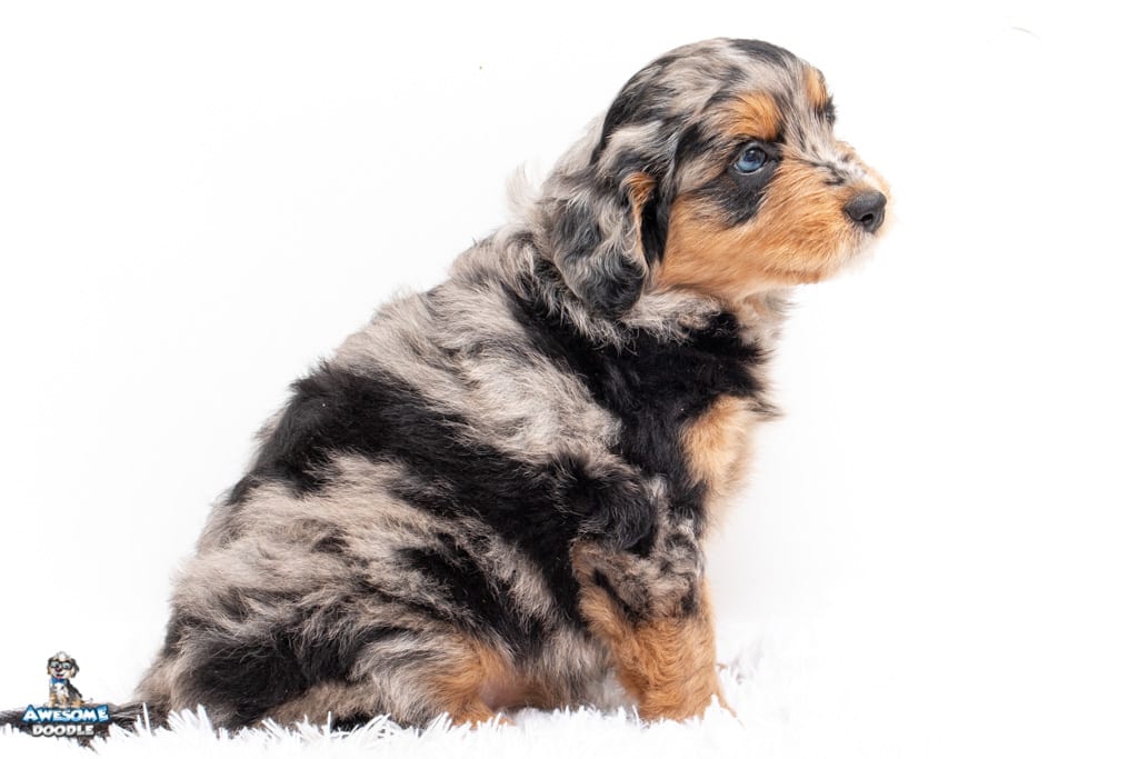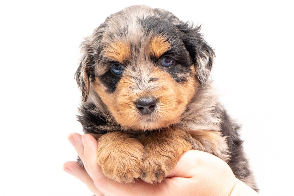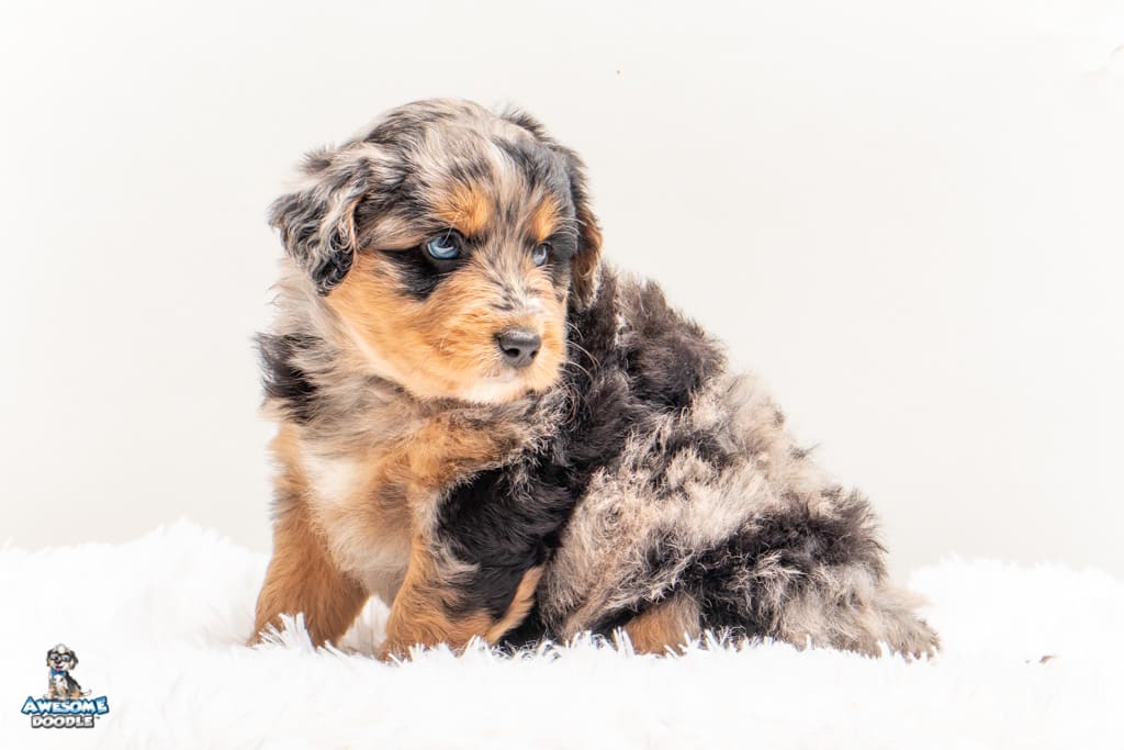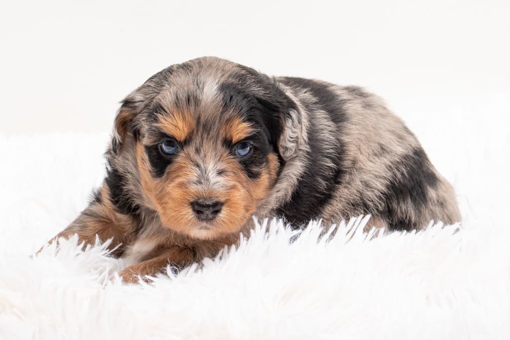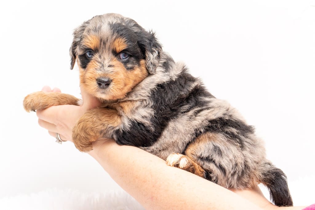 Beyla is a female Phantom Blue Merle F1 AussieDoodle puppy.