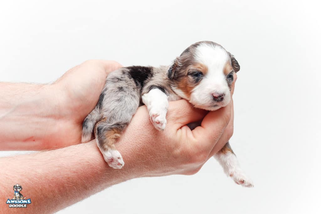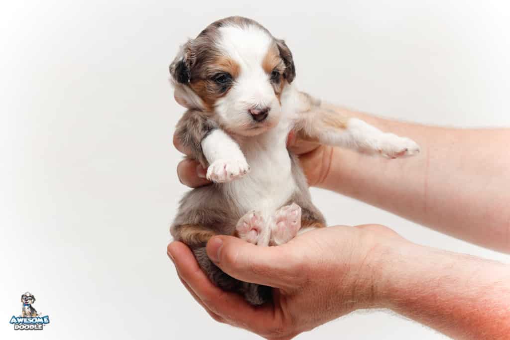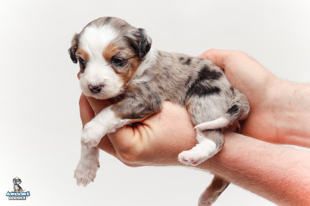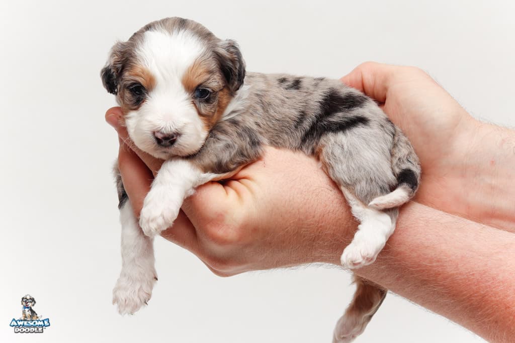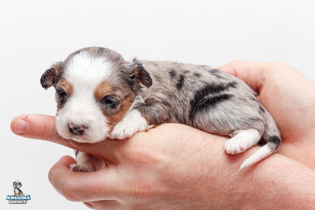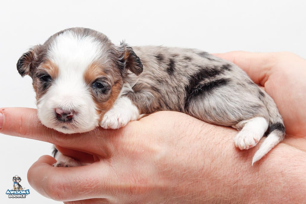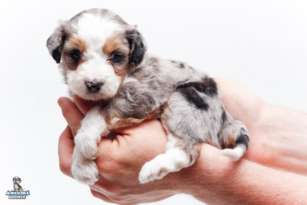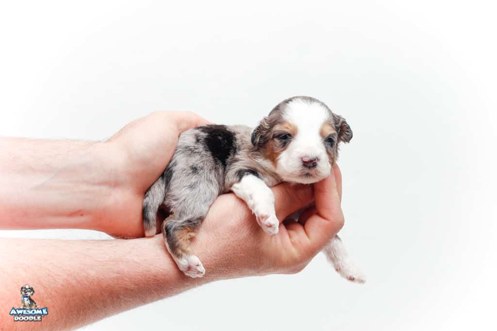 Bunker is a male Blue Merle w/ White & Copper F1 AussieDoodle puppy.
