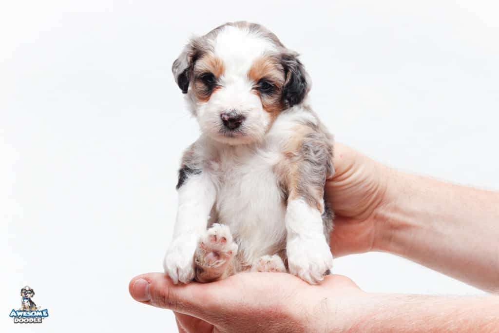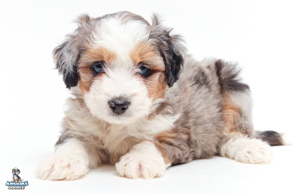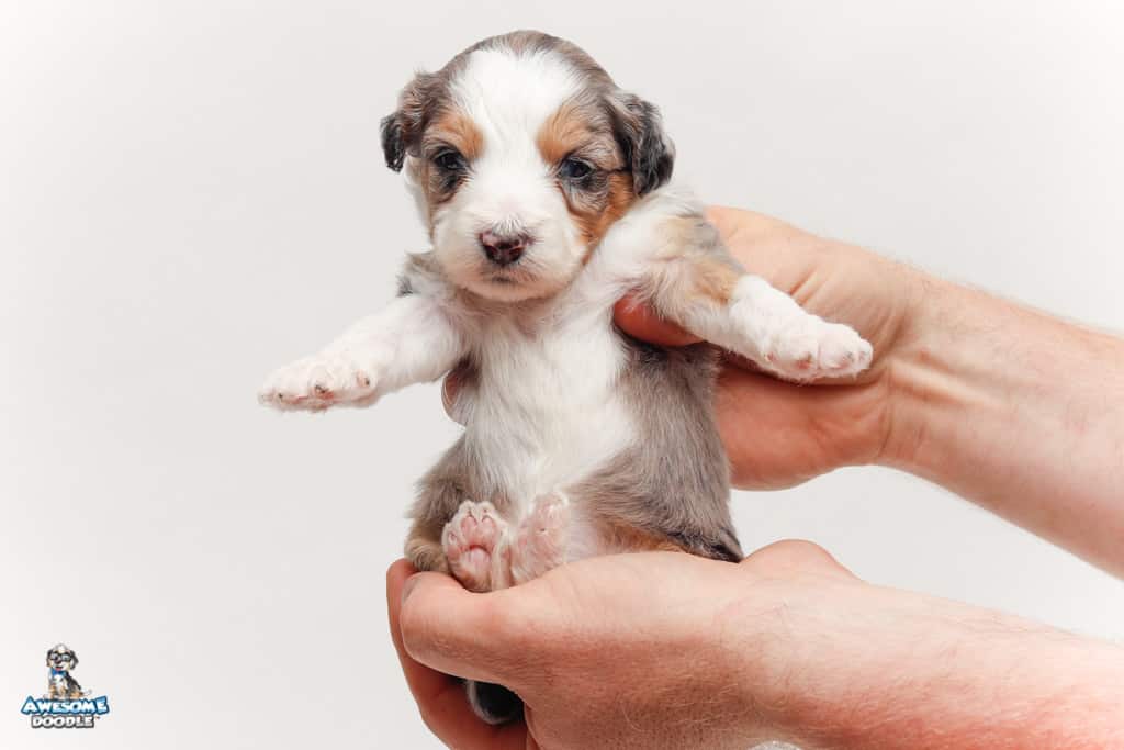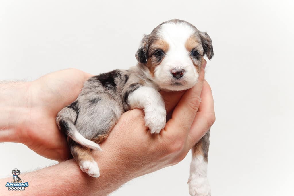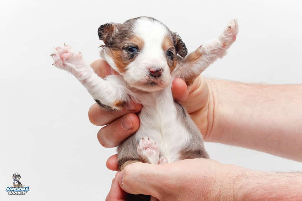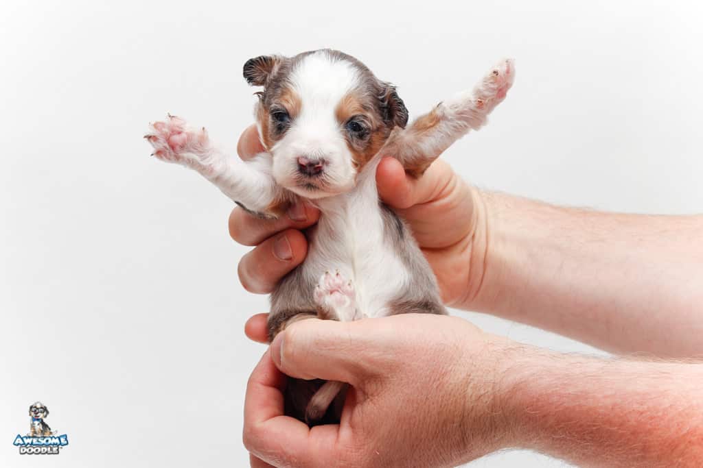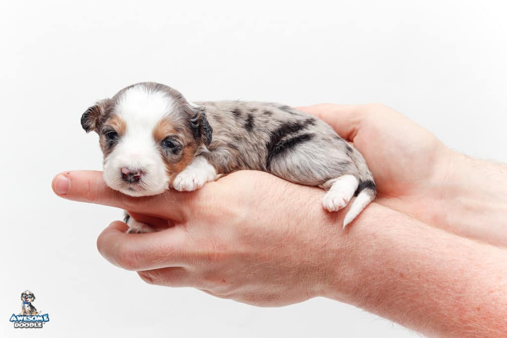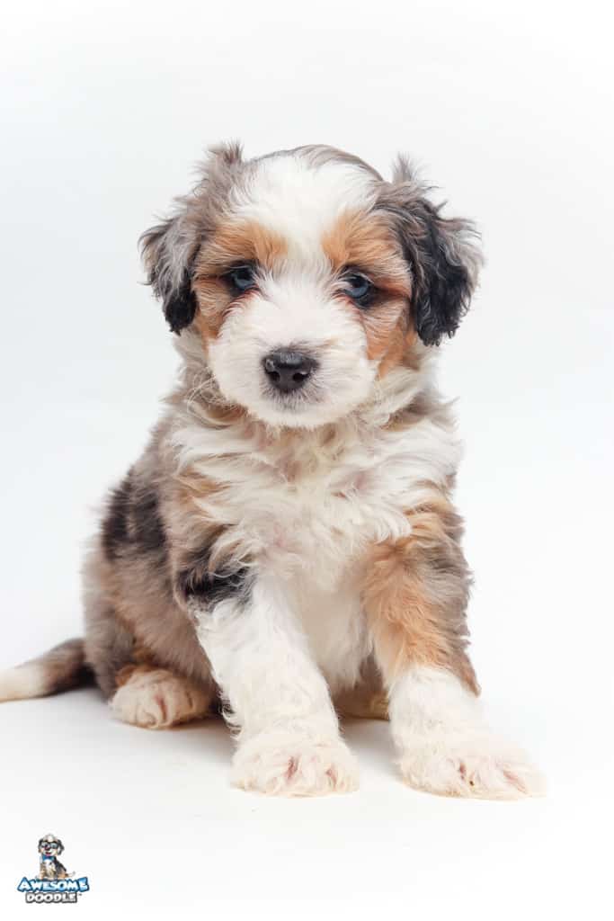 Bunker is a male Blue Merle w/ White & Copper F1 AussieDoodle puppy.