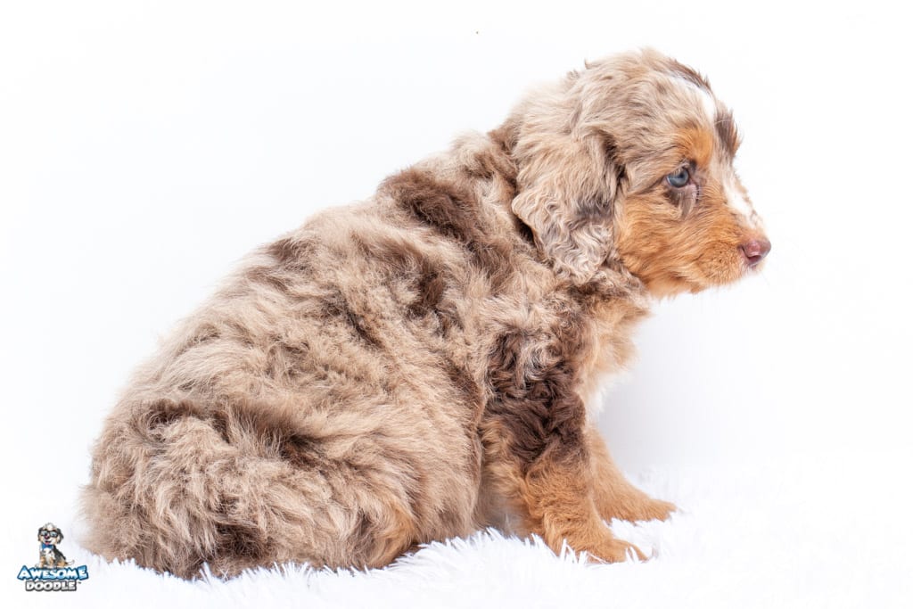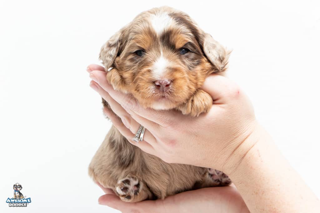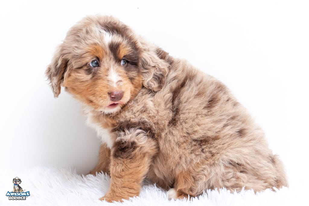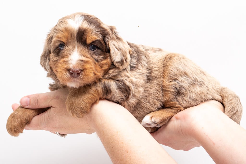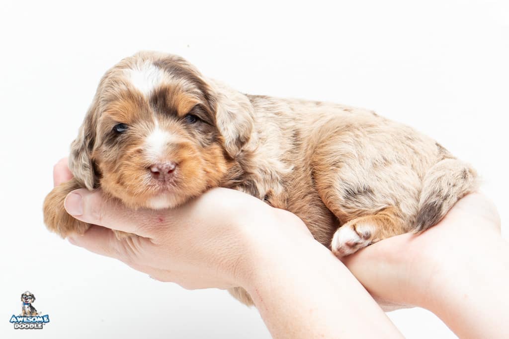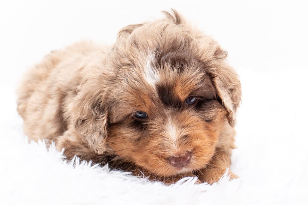 Janet is a female Phantom Chocolate Merle F1 AussieDoodle puppy.