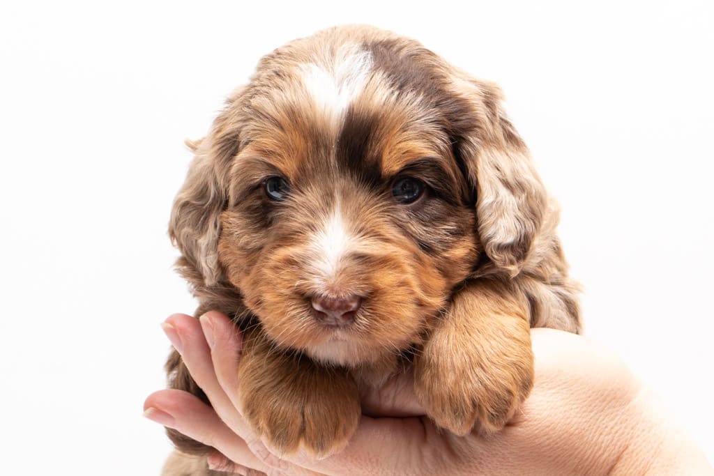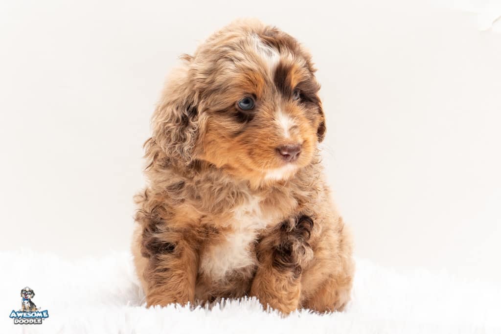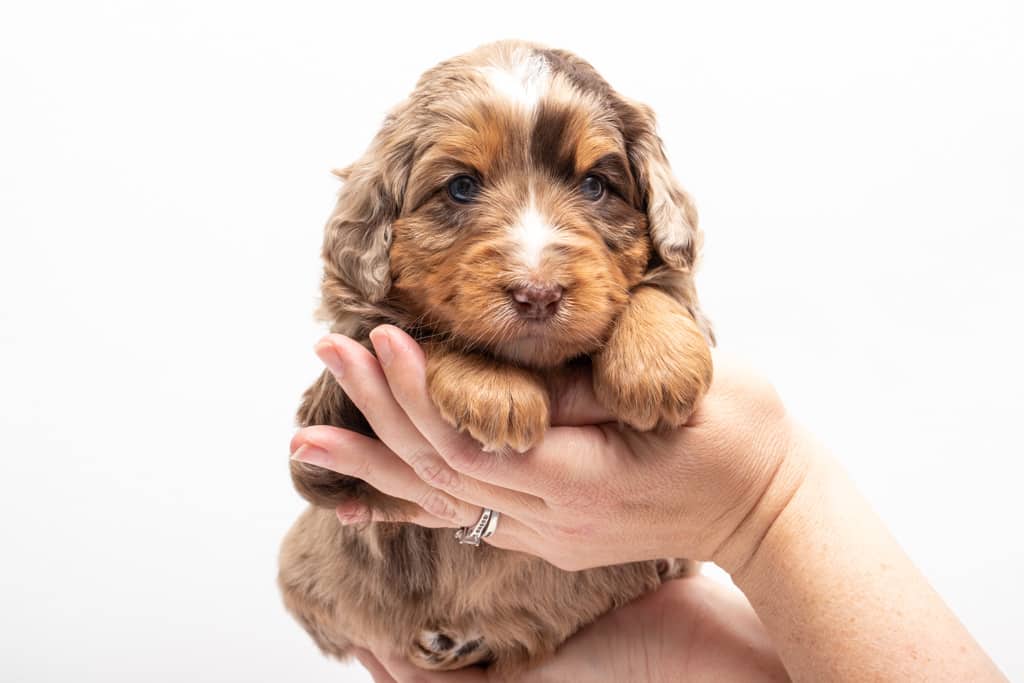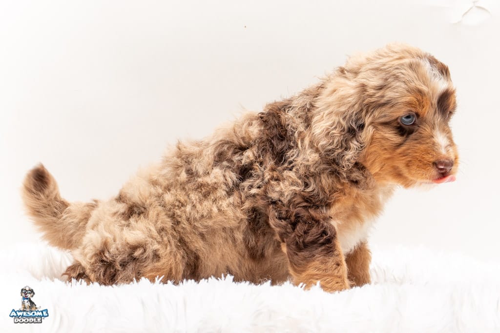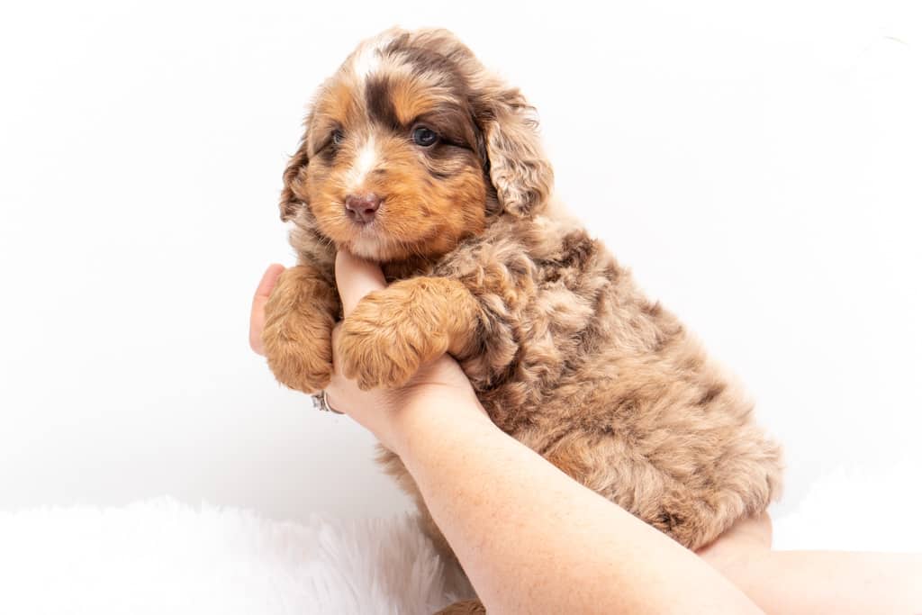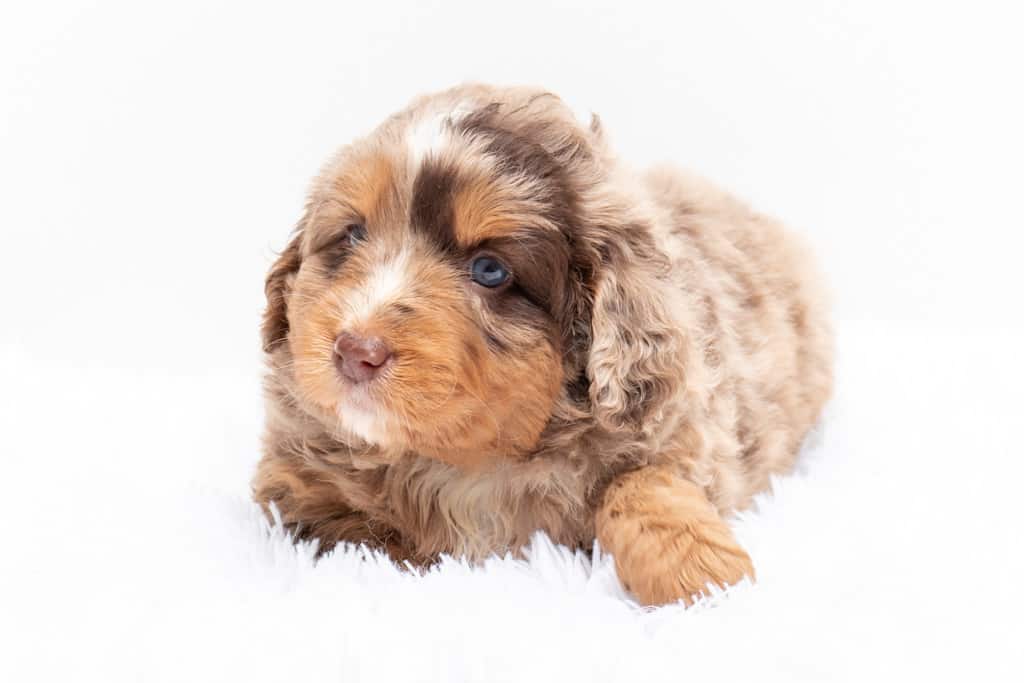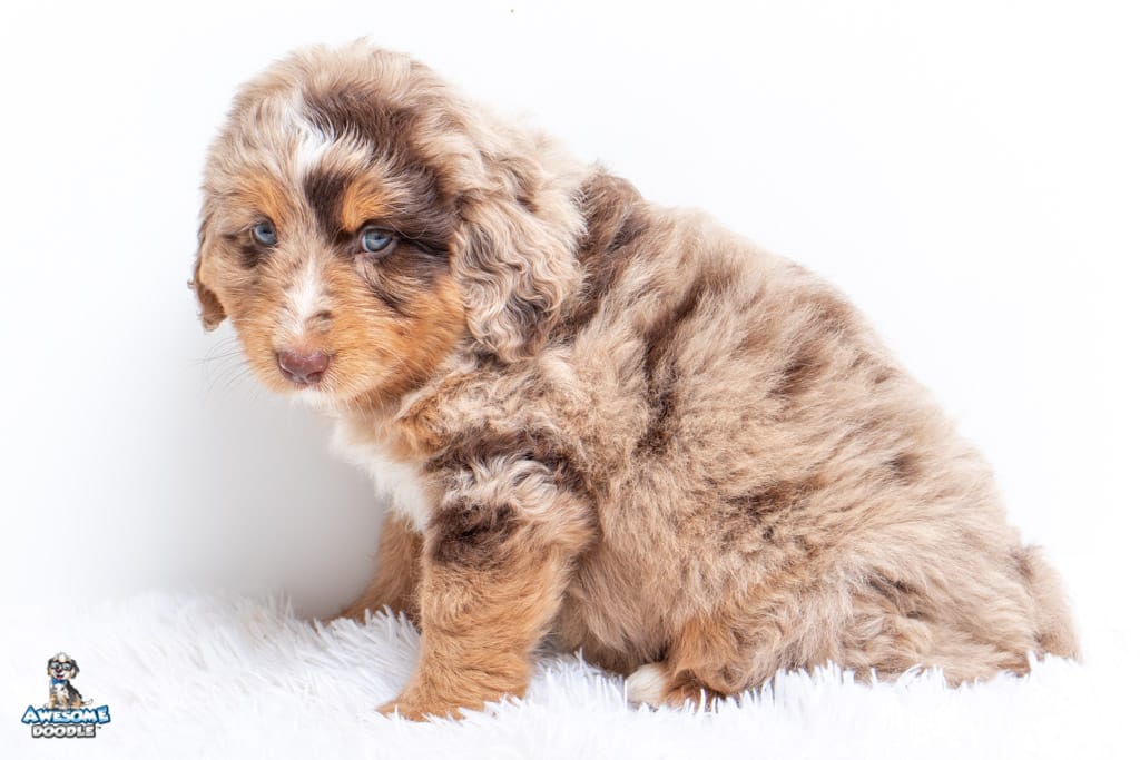 Janet is a female Phantom Chocolate Merle F1 AussieDoodle puppy.