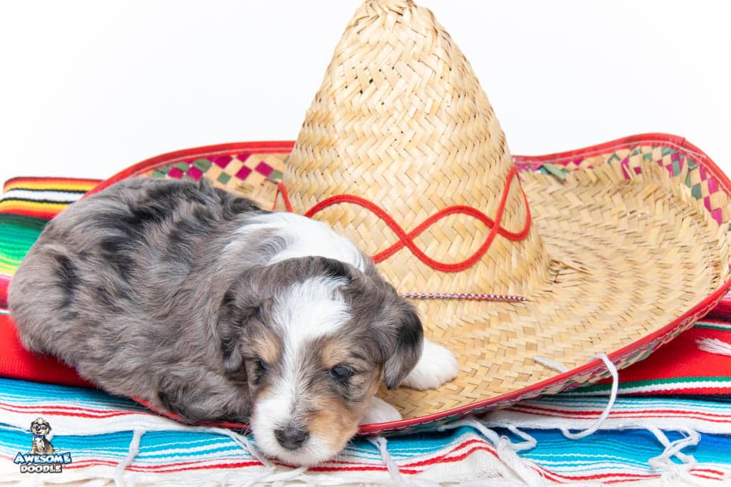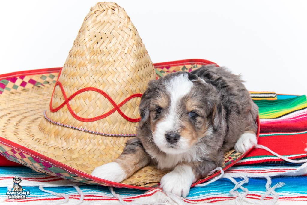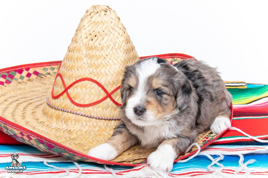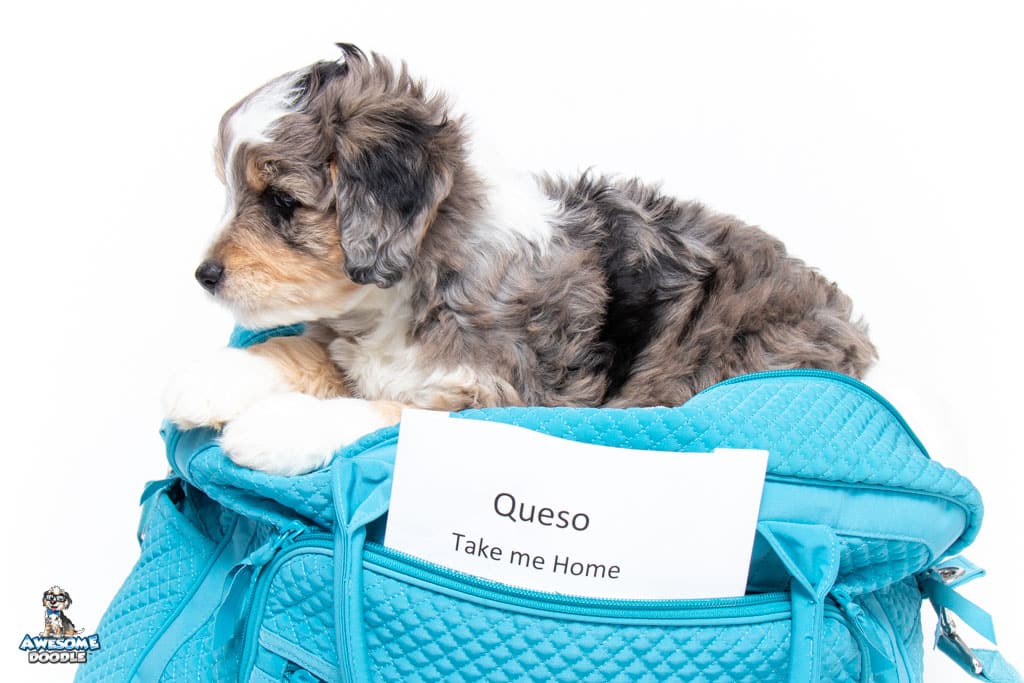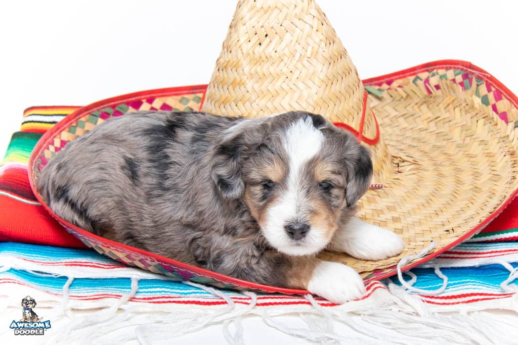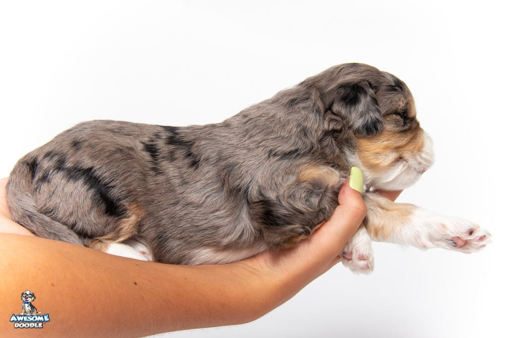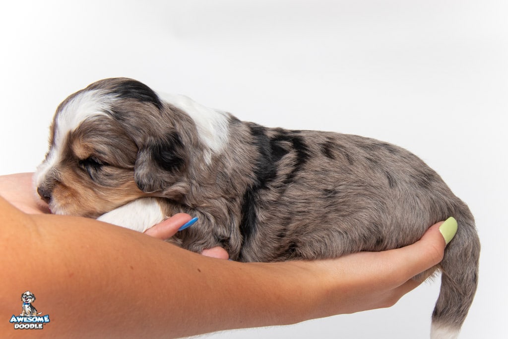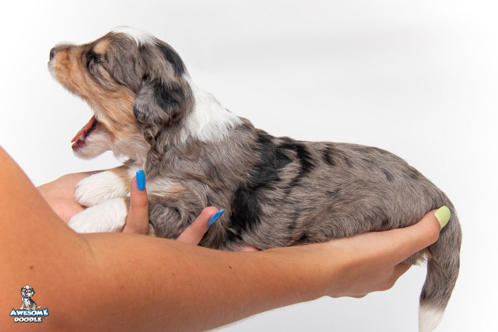 Queso is a male Blue Merle w/ White & Copper F1 AussieDoodle puppy.