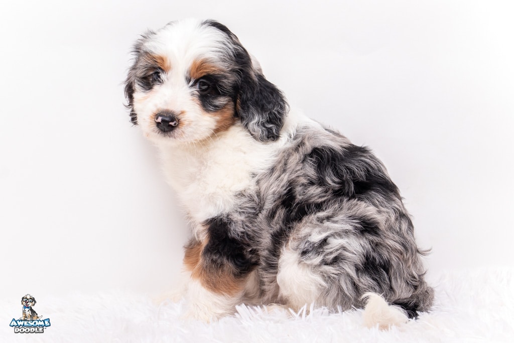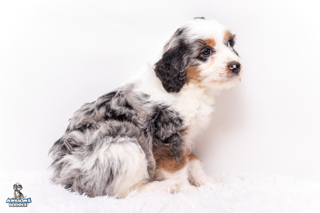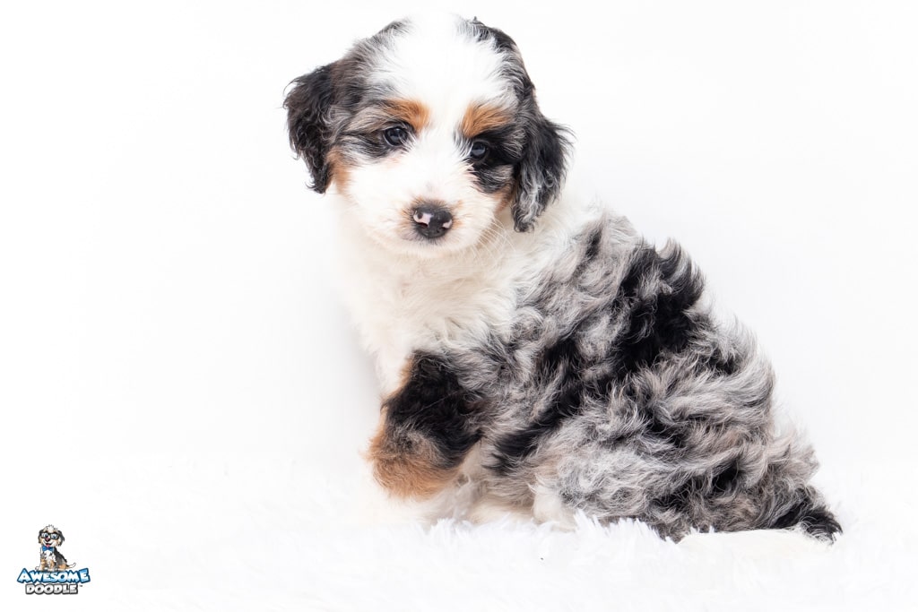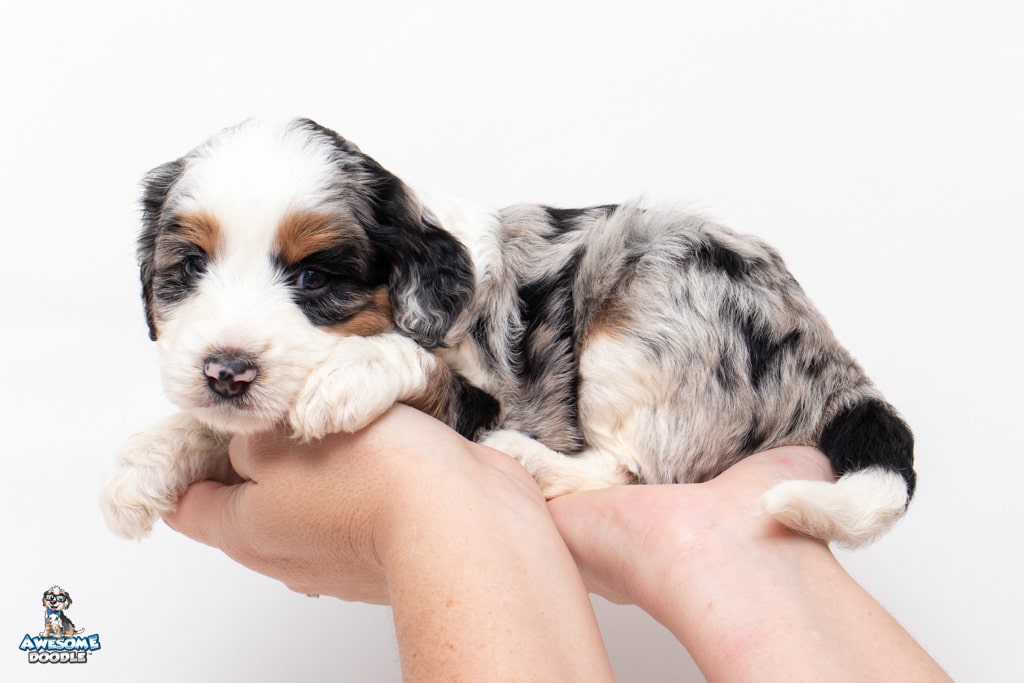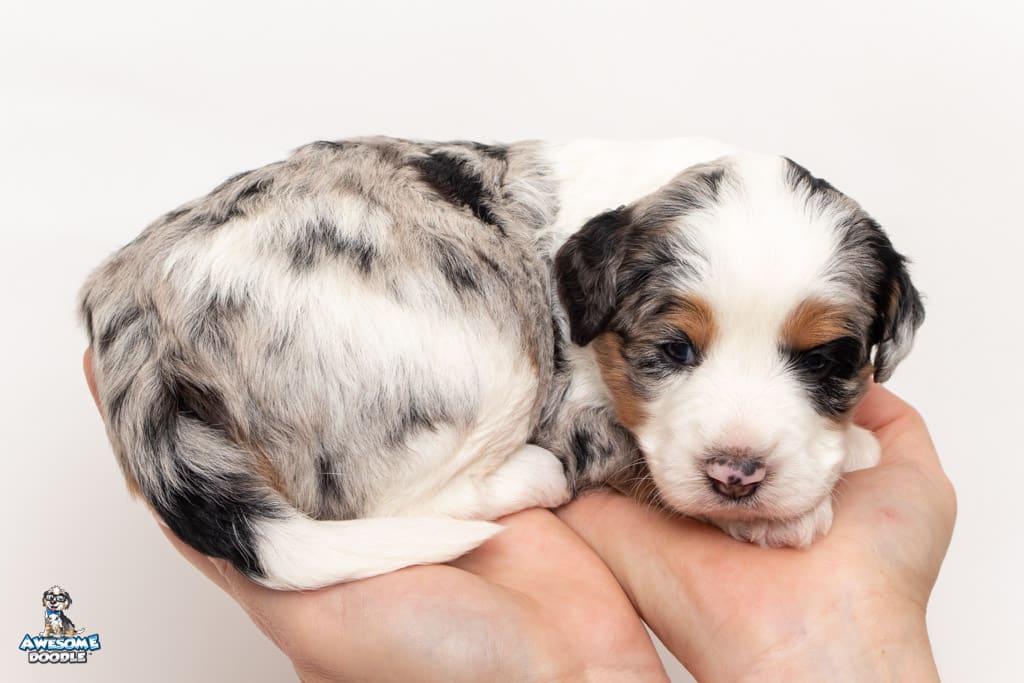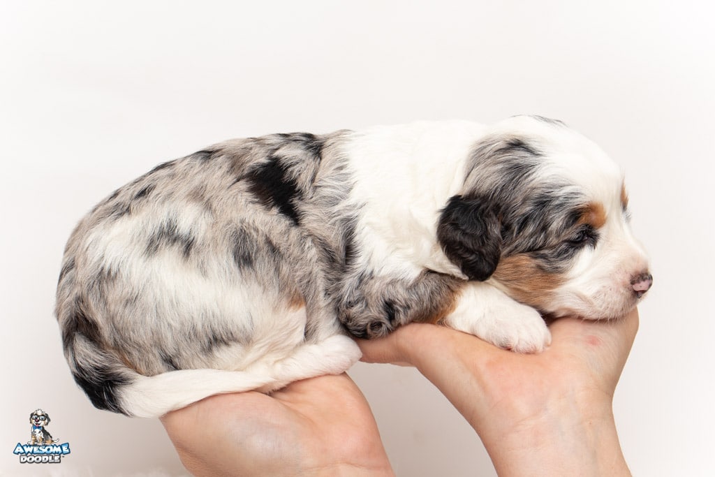 Bluebell. “Bella” is a female Blue Merle w/ White & Copper F1 AussieDoodle puppy.