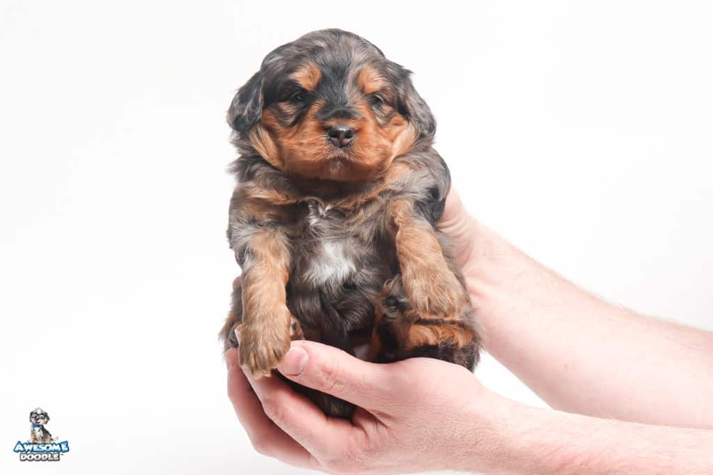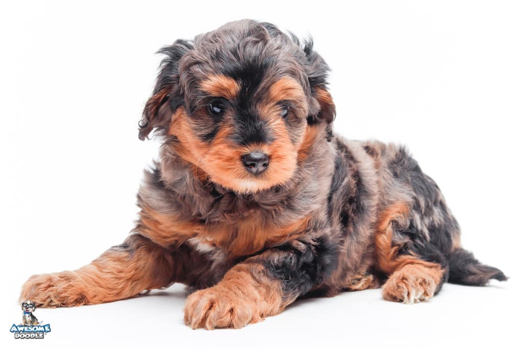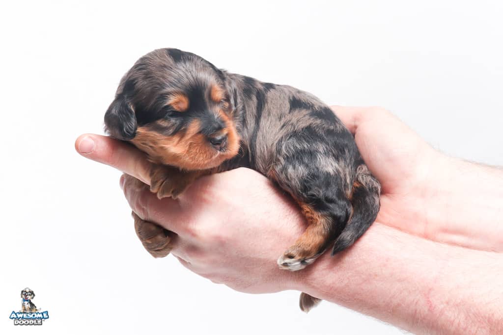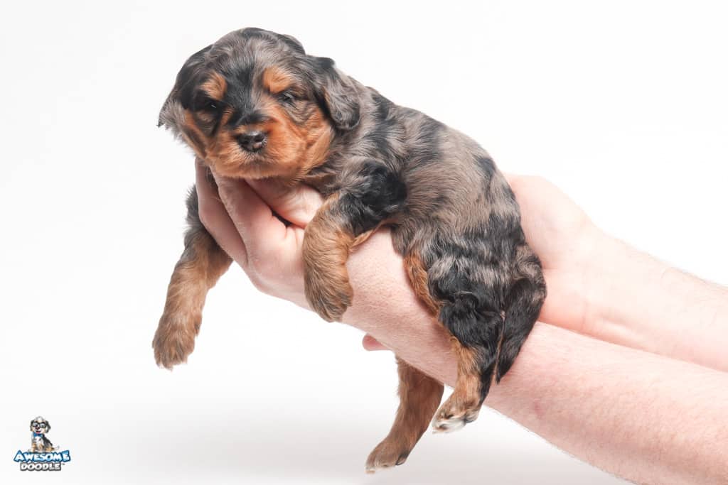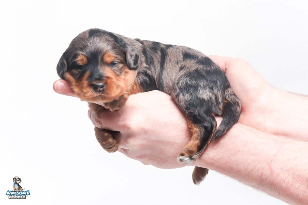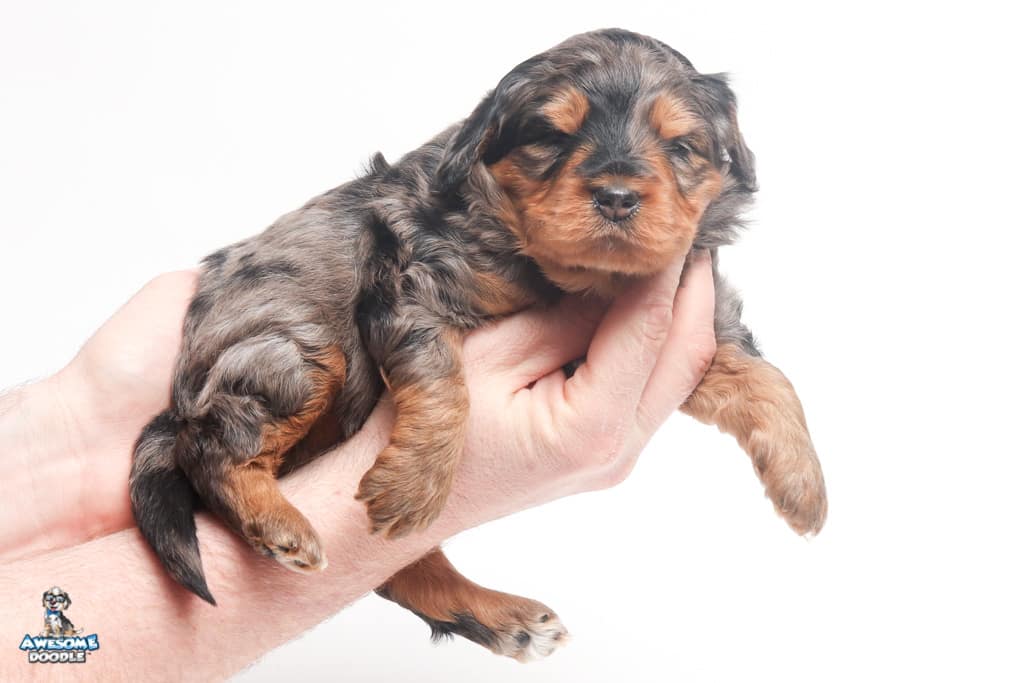 Charlie Girl is a female Phantom Blue Merle F1 AussieDoodle puppy.