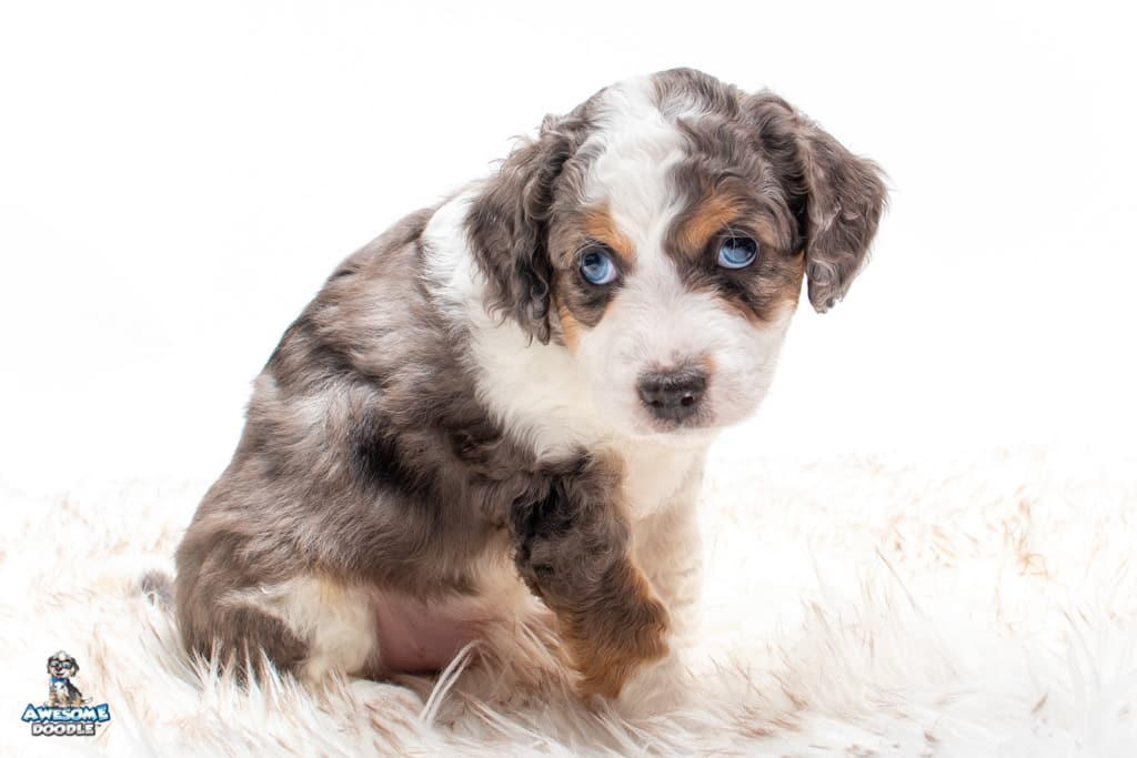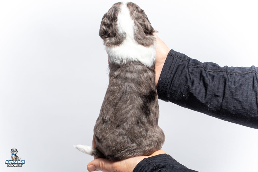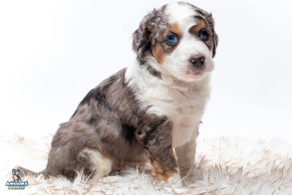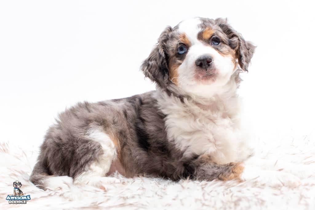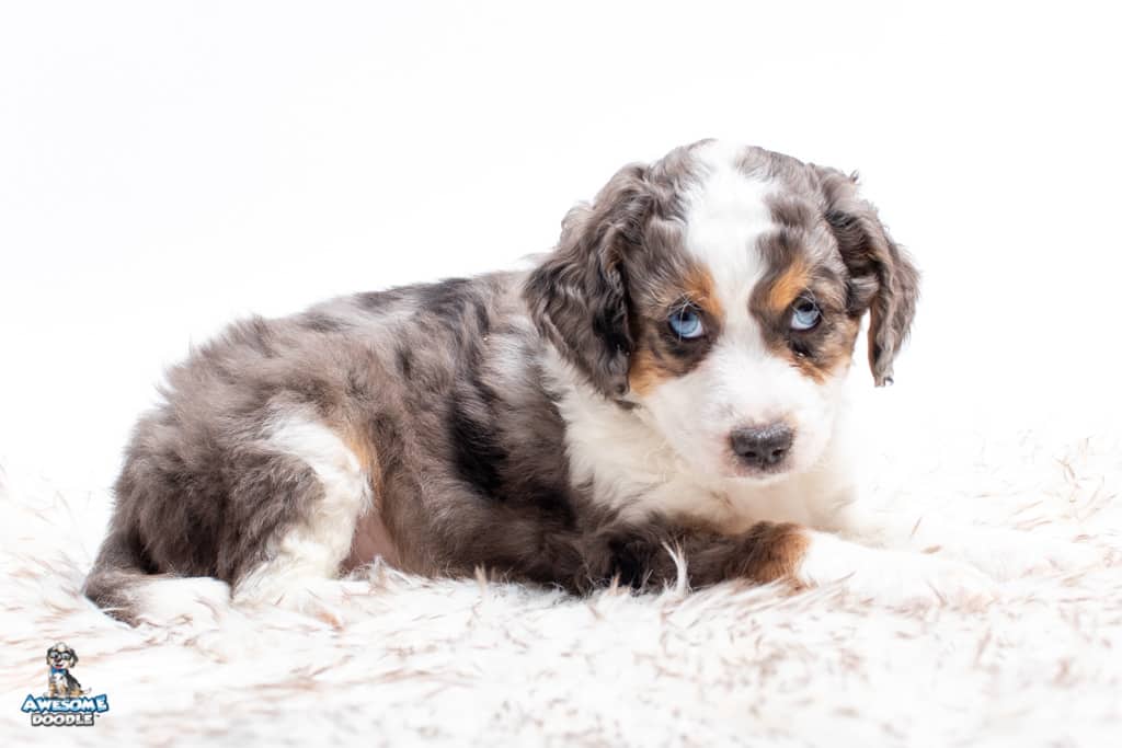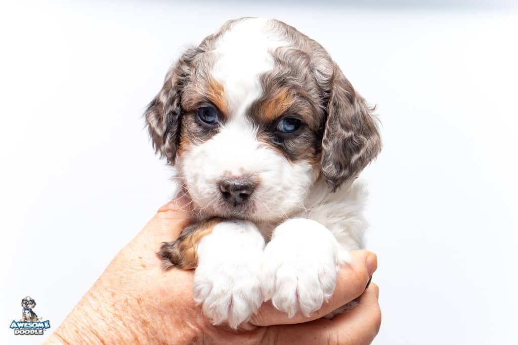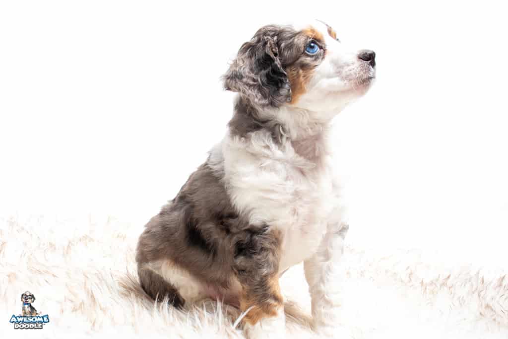 Ziggy is a male Blue Merle w/ White & Copper F1 AussieDoodle puppy.