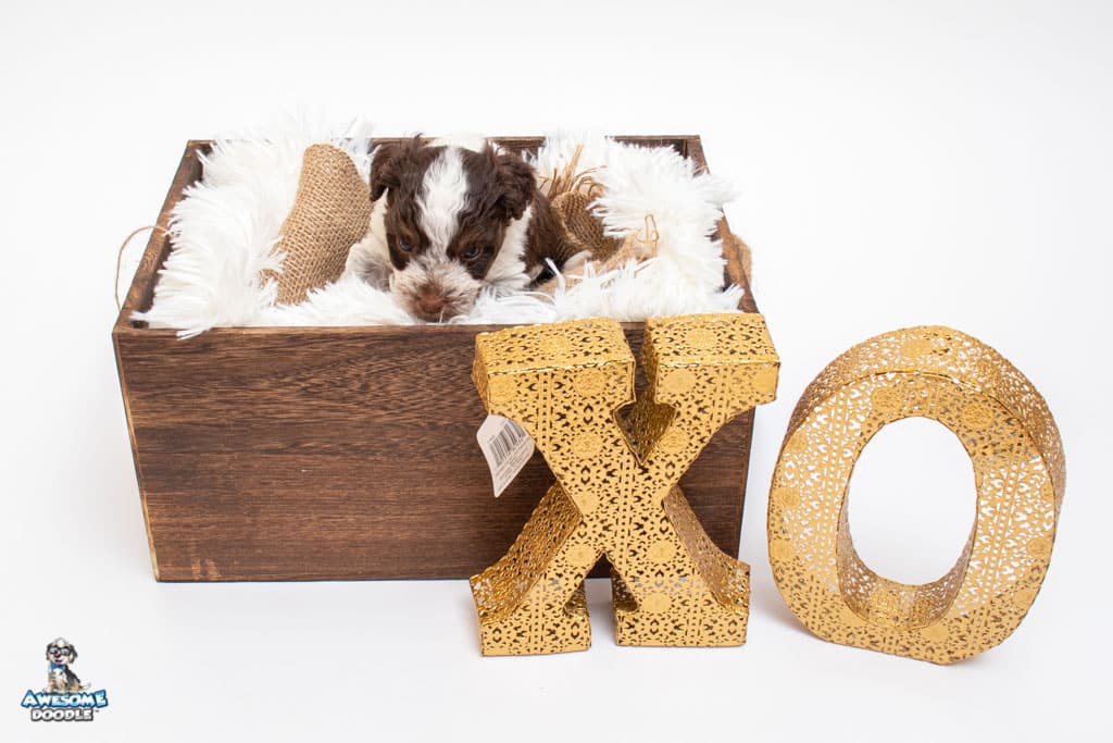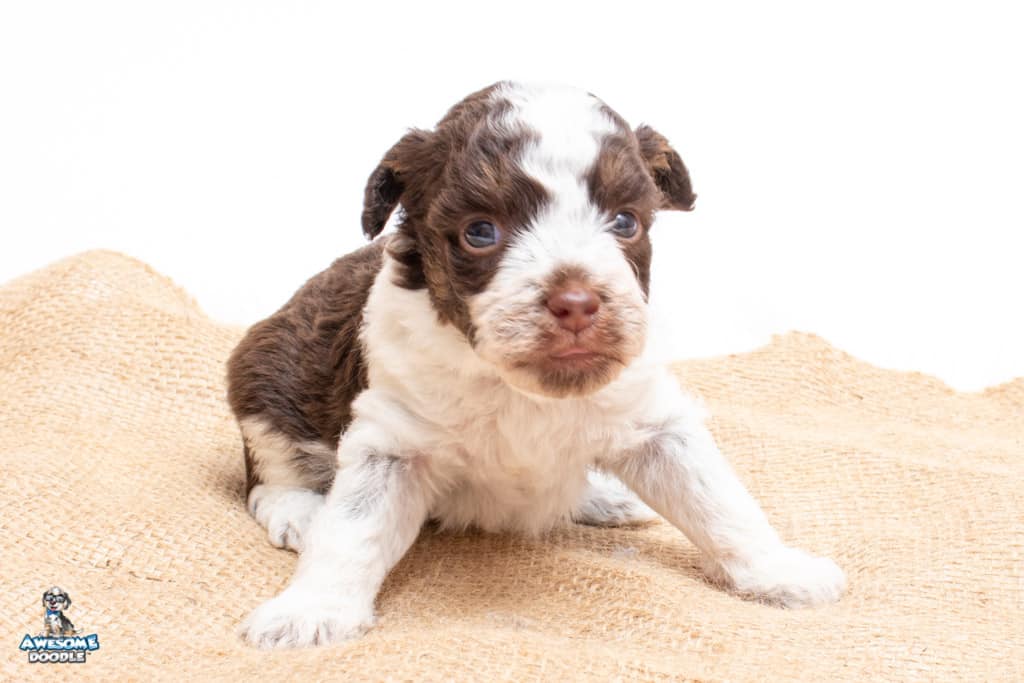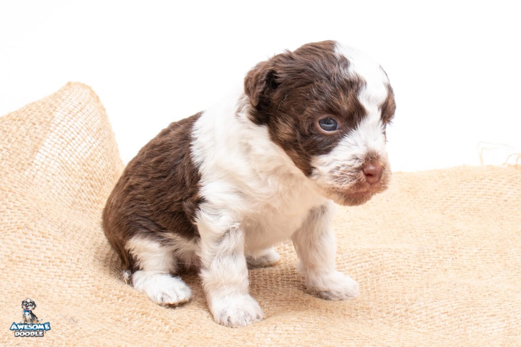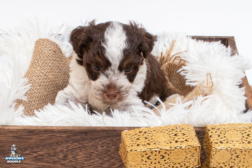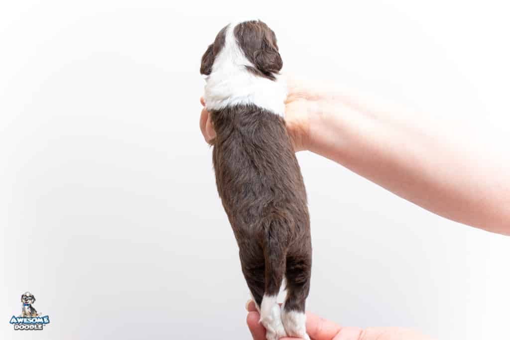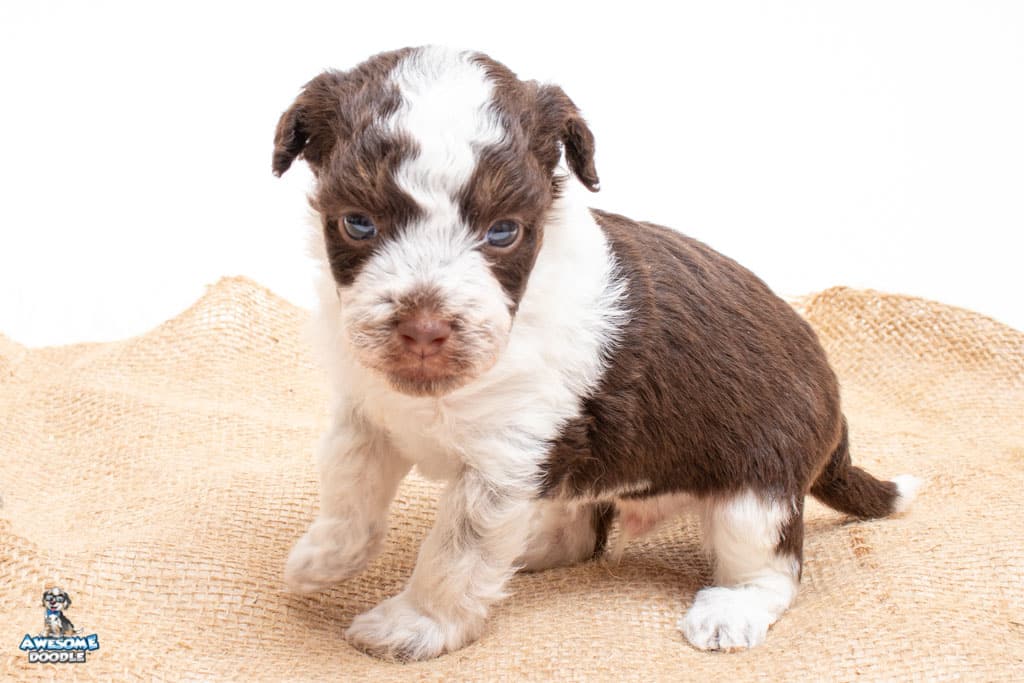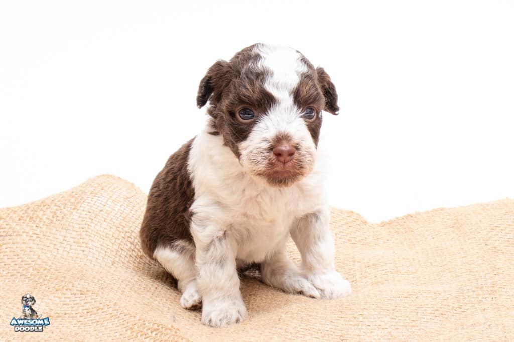 Henry is a male Chocolate Tri-Color F1 AussieDoodle puppy.
