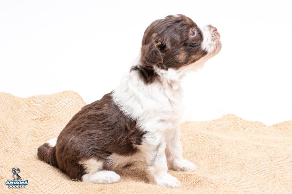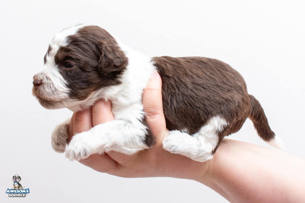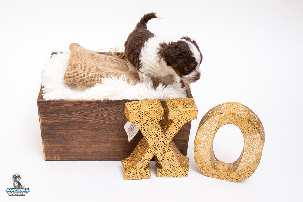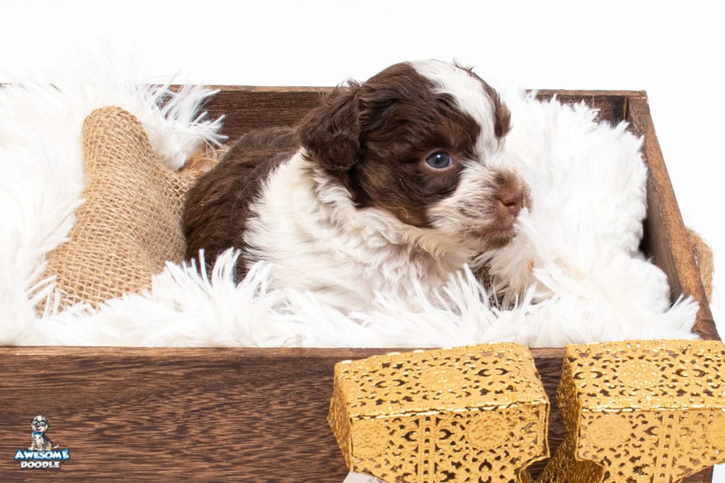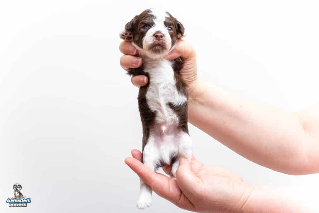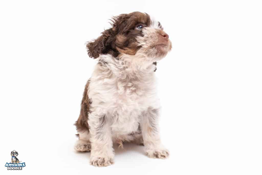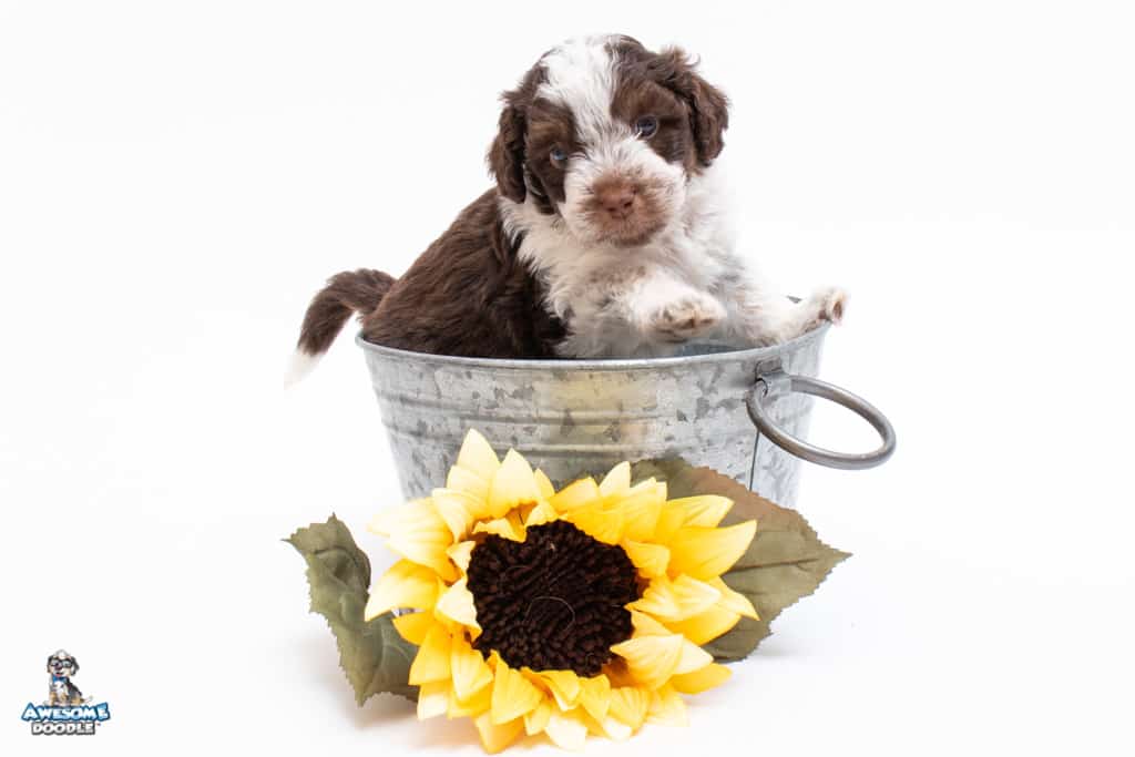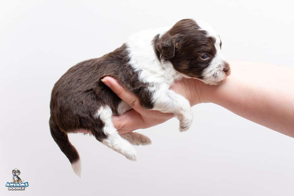 Henry is a male Chocolate Tri-Color F1 AussieDoodle puppy.