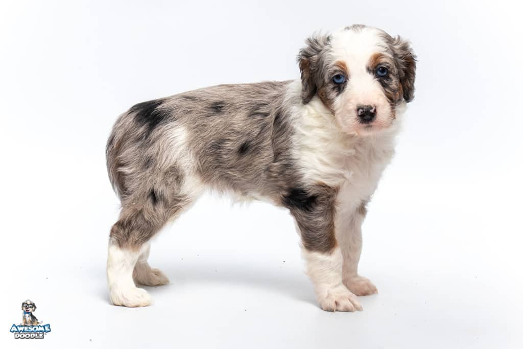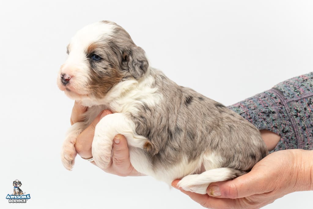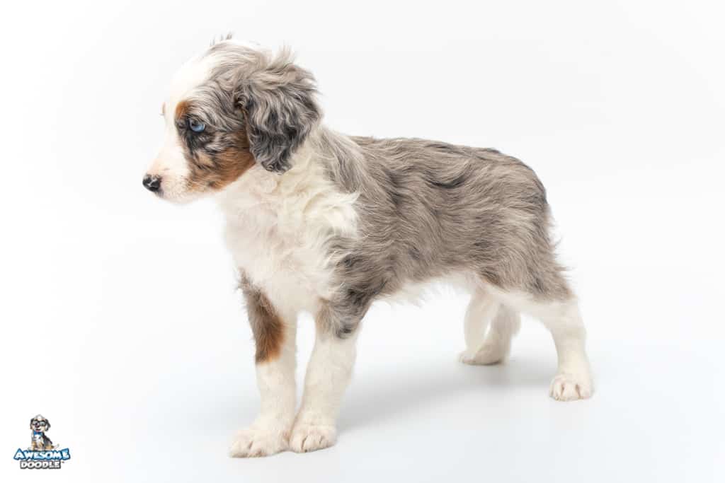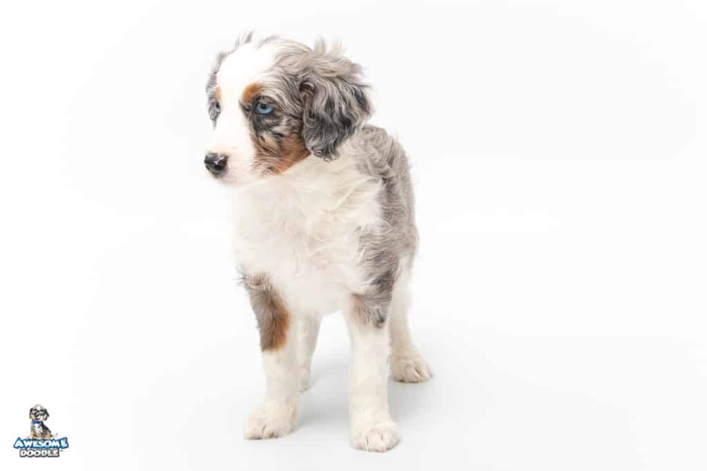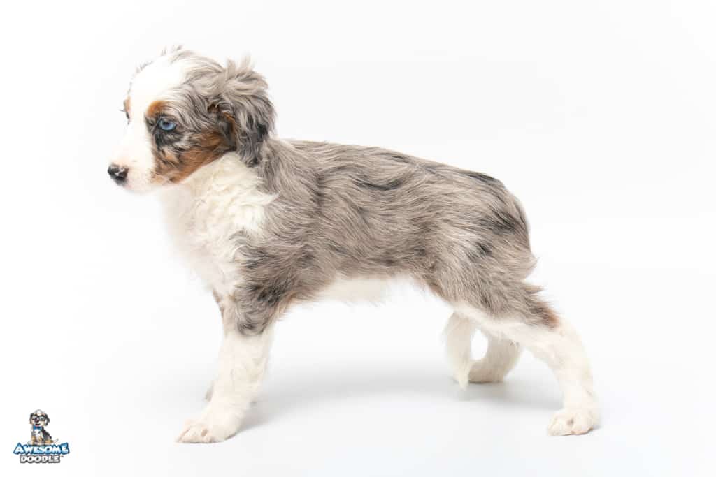 Sunday is a female Blue Merle w/ White & Copper F1 AussieDoodle puppy.