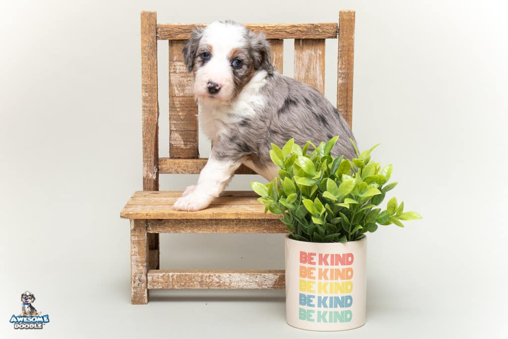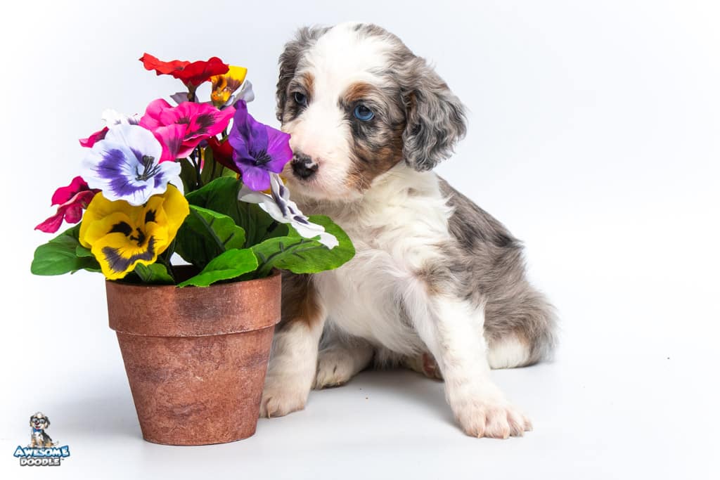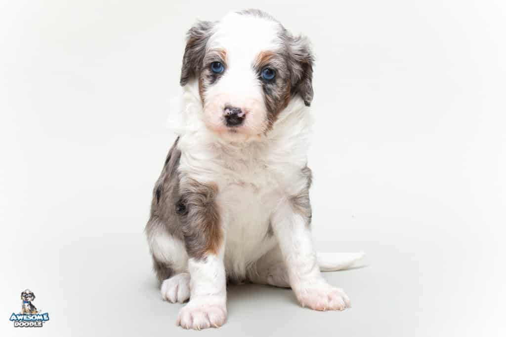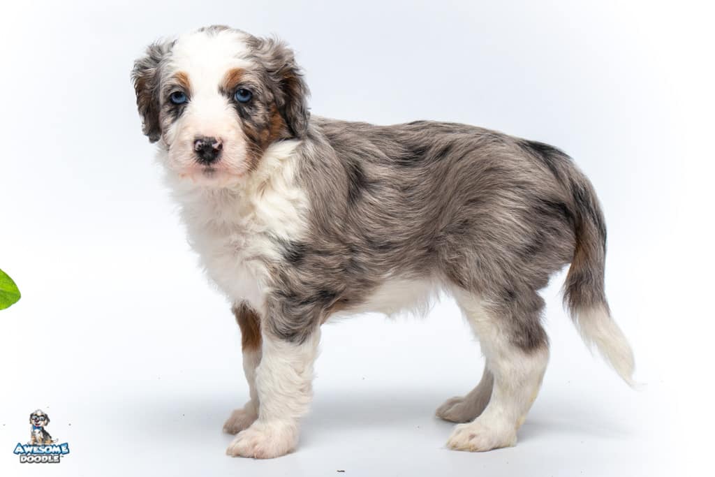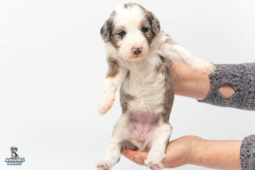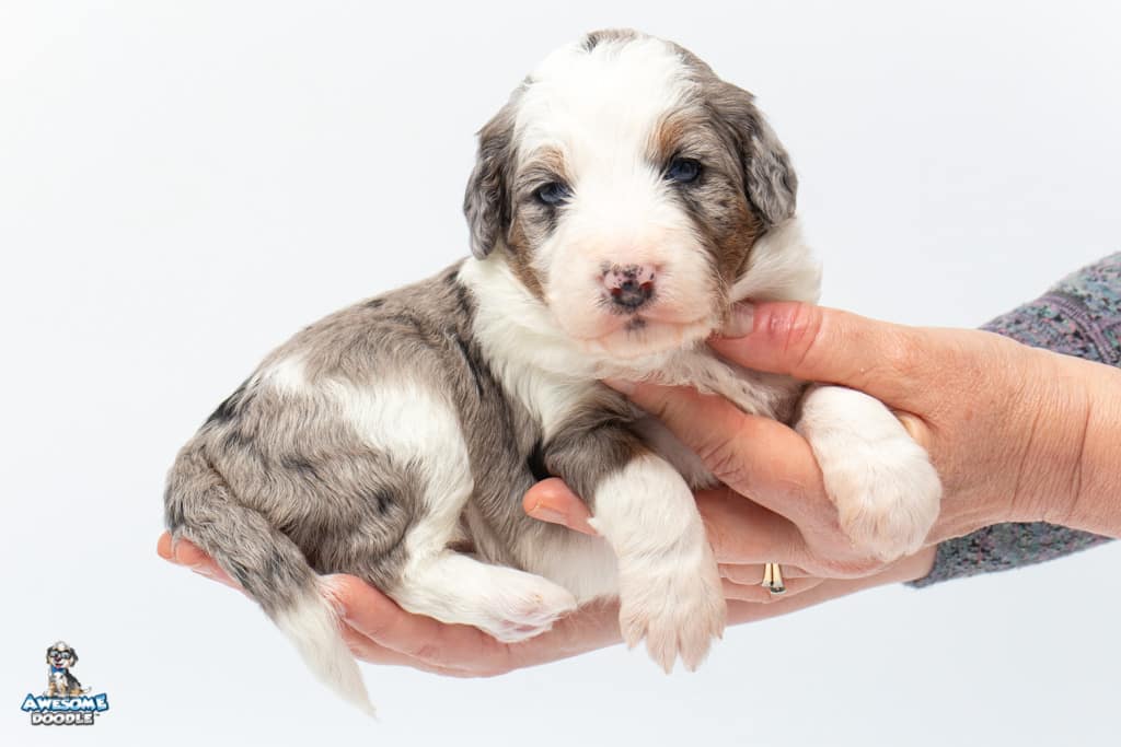 Sunday is a female Blue Merle w/ White & Copper F1 AussieDoodle puppy.