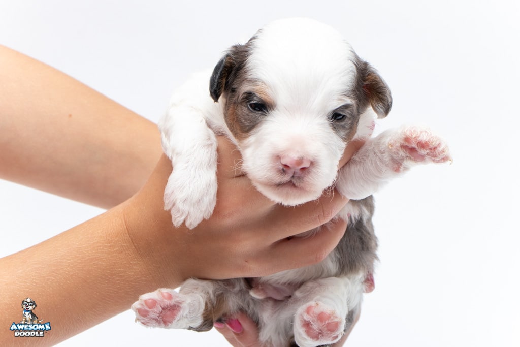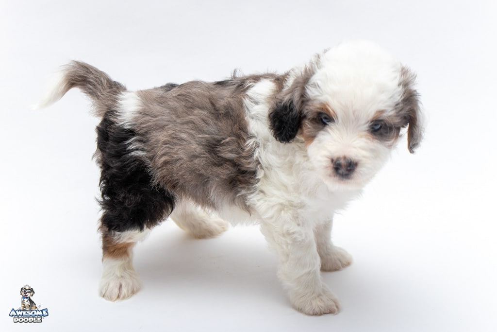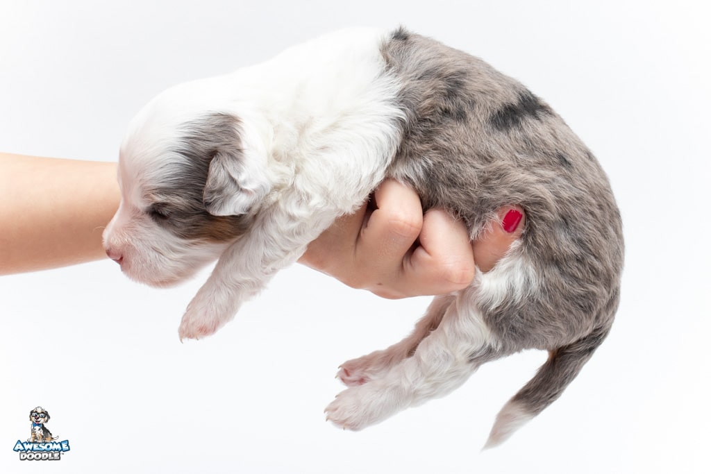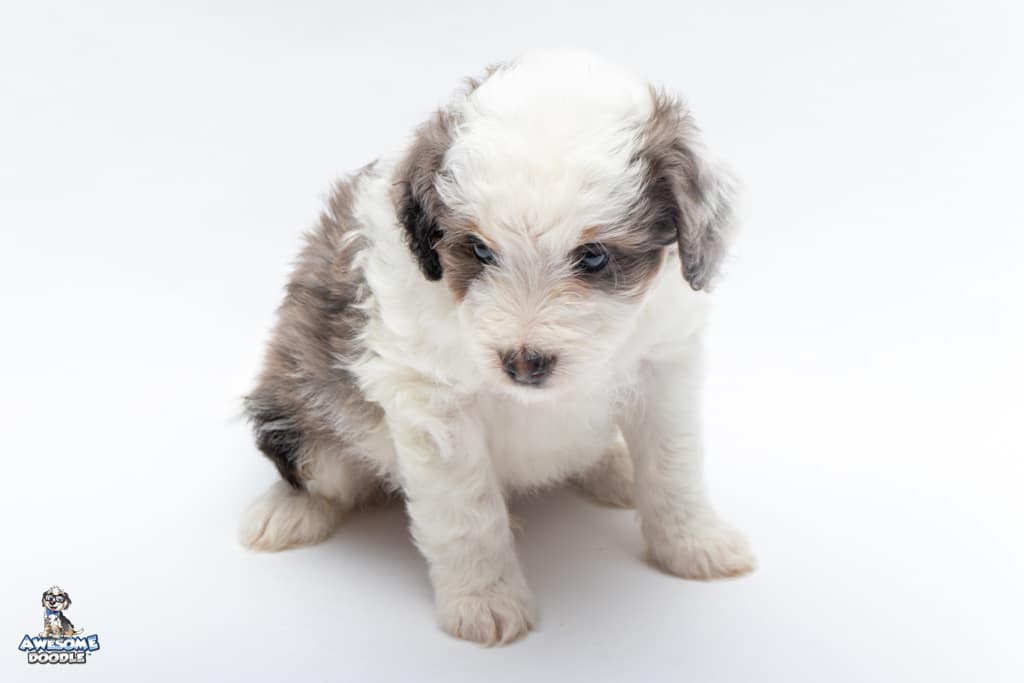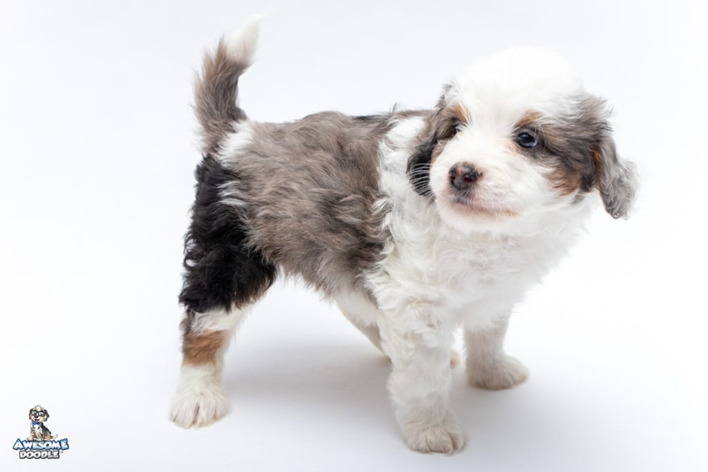 Teddy is a male Blue Merle w/ White & Copper F1 AussieDoodle puppy.
