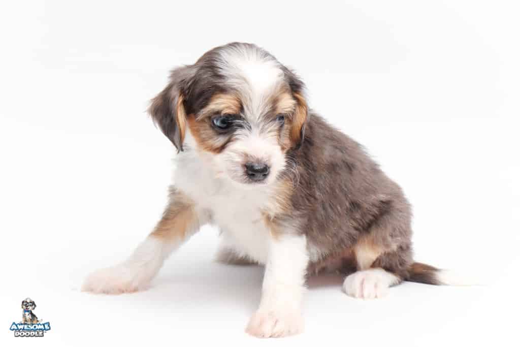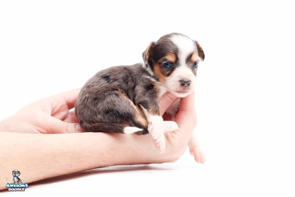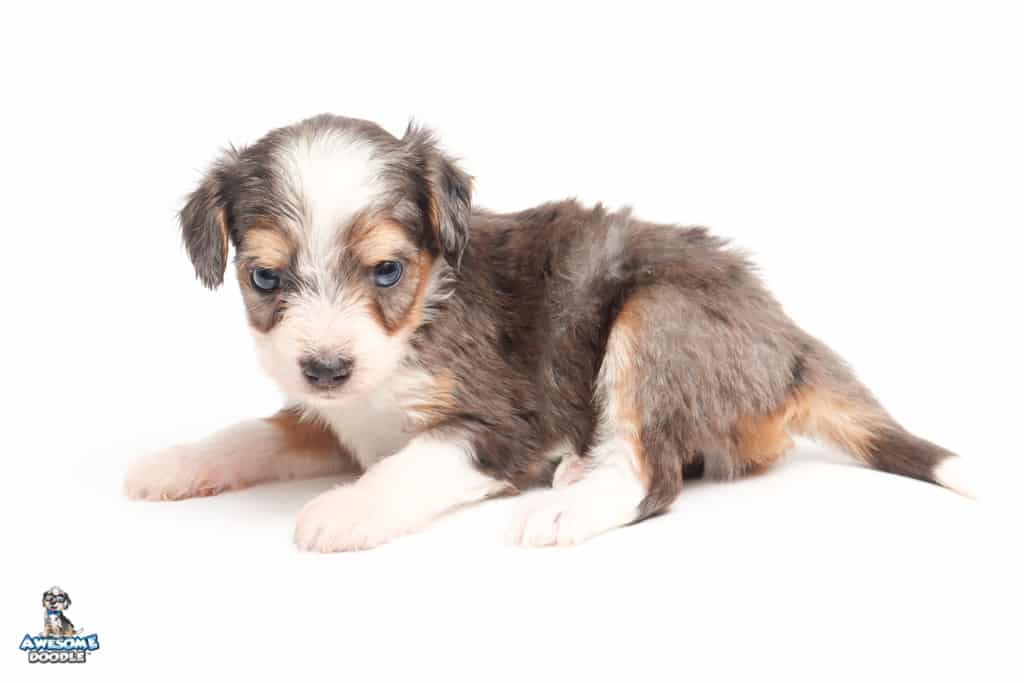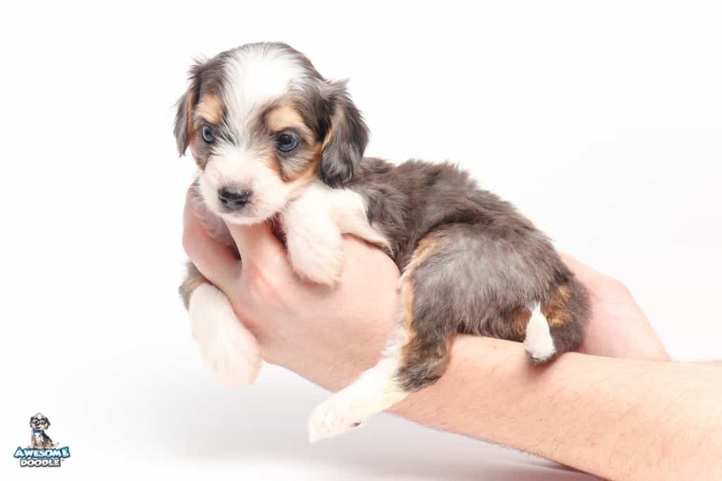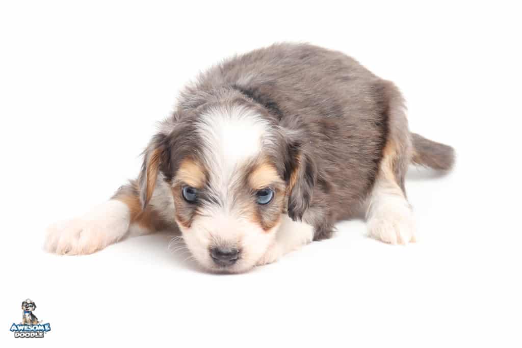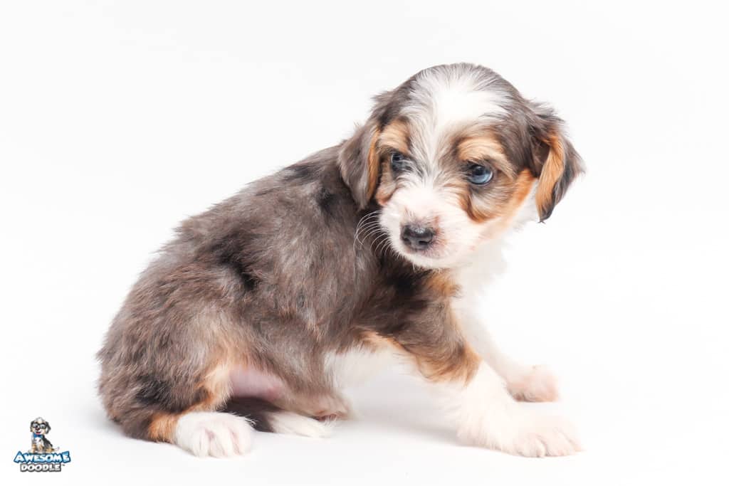 Vincent is a male Blue Merle w/ White & Copper F1 AussieDoodle puppy.