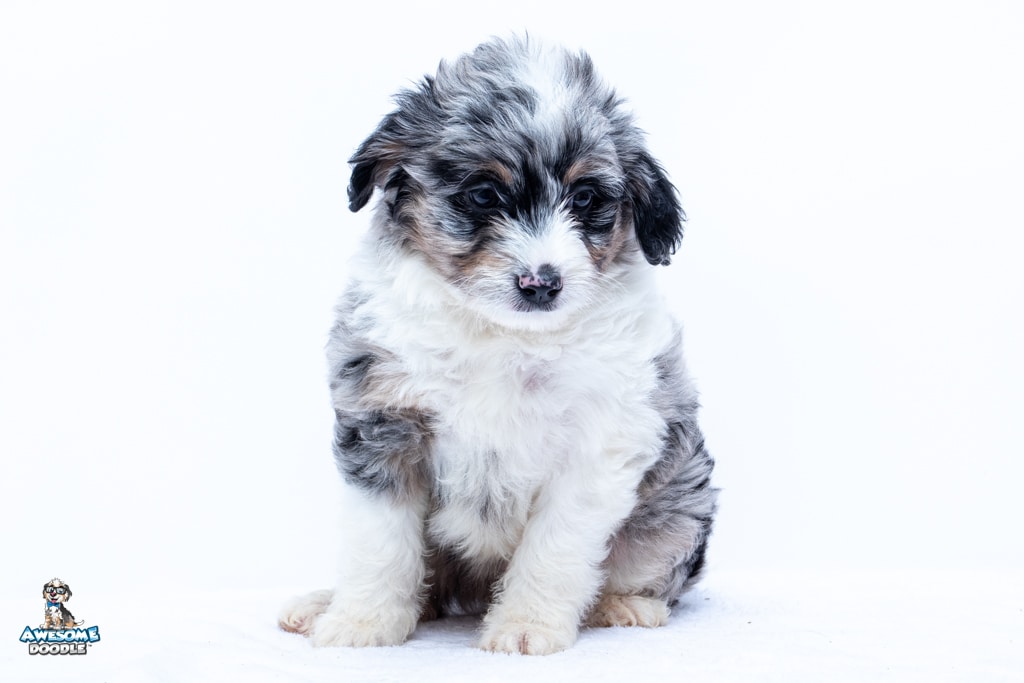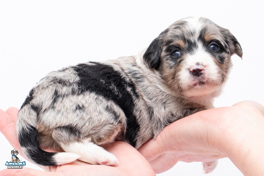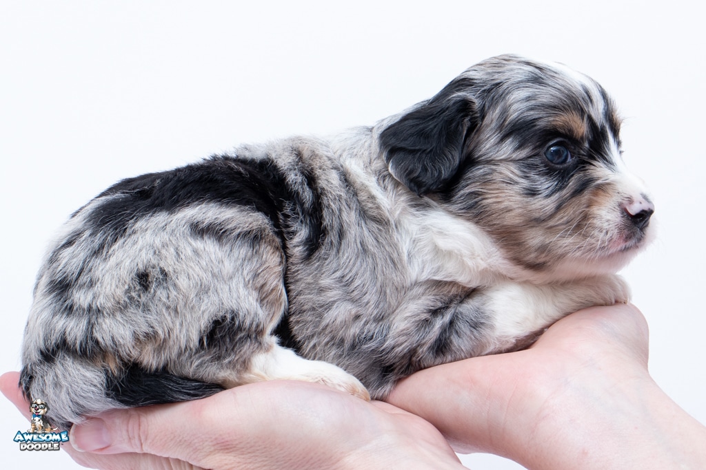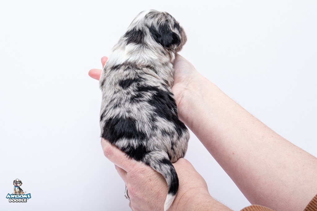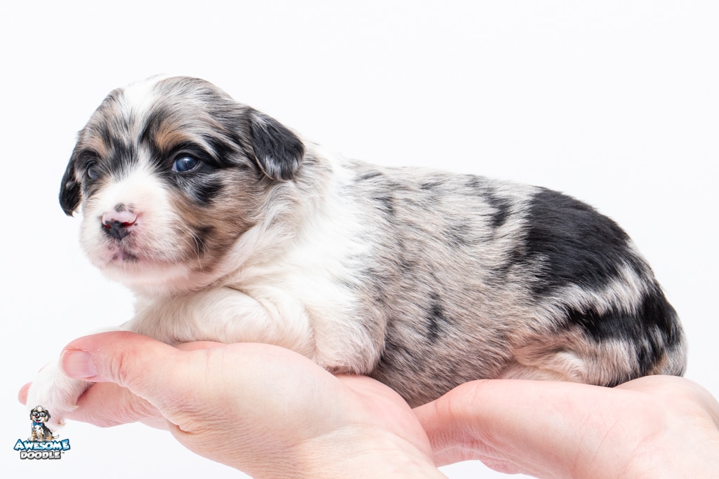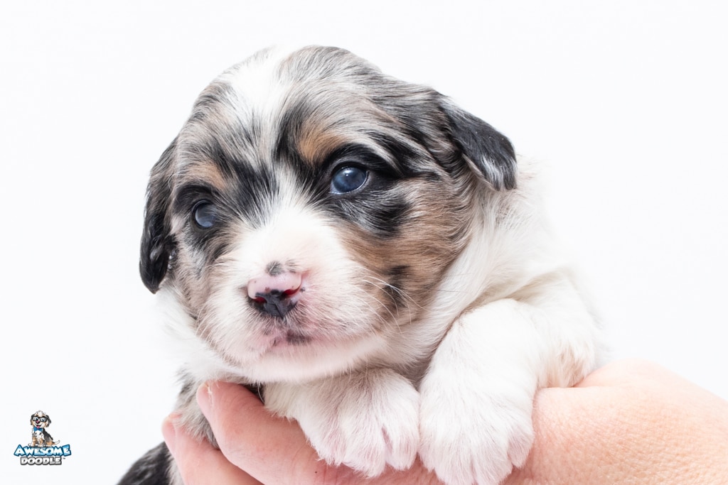 Zamboni is a female Blue Merle w/ White & Copper F1 AussieDoodle puppy.