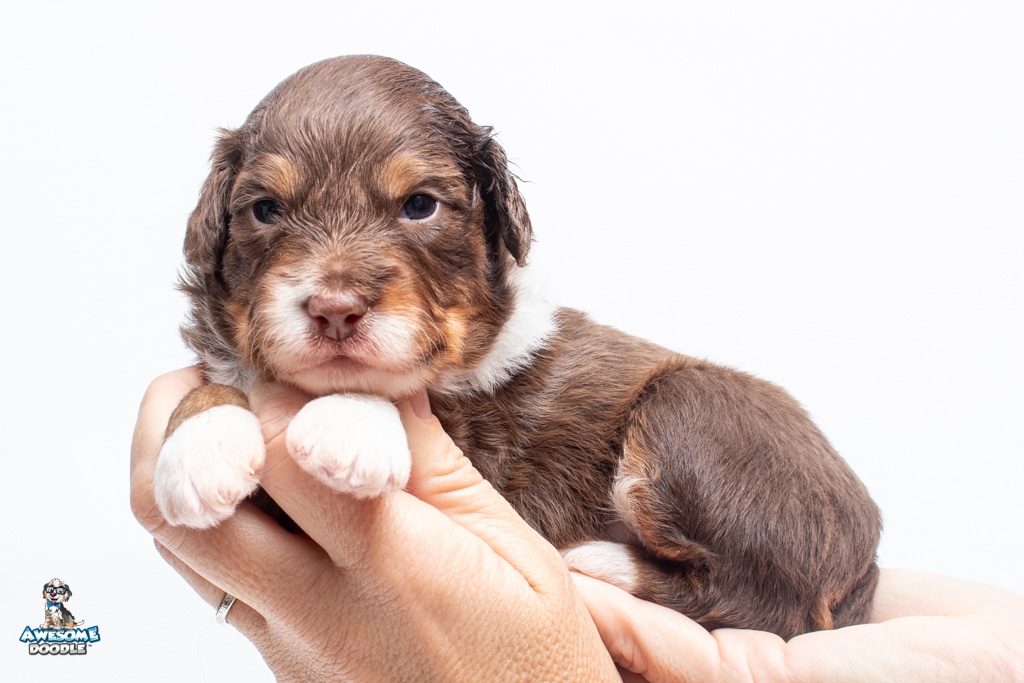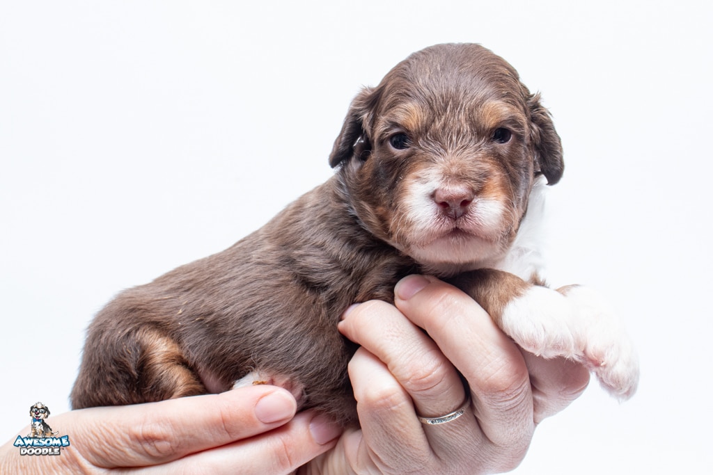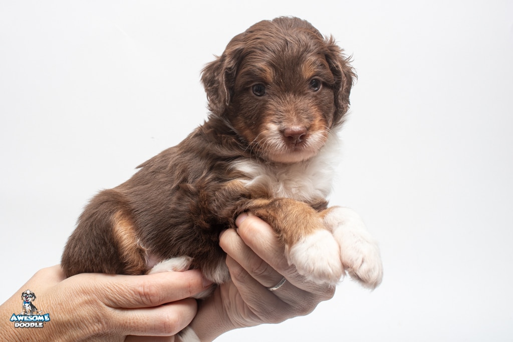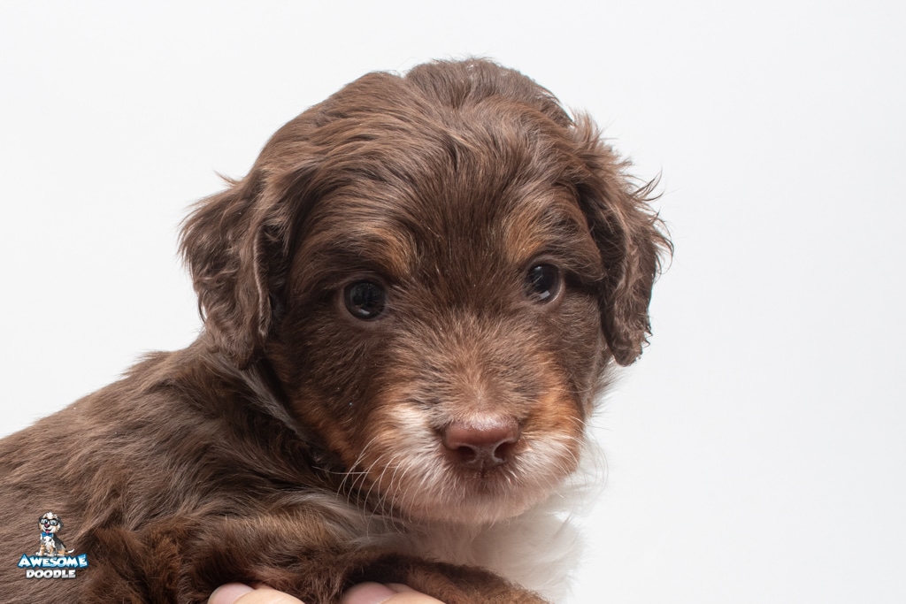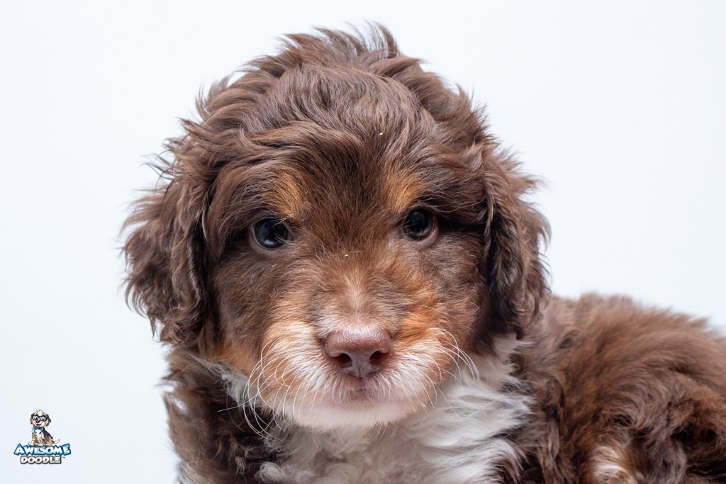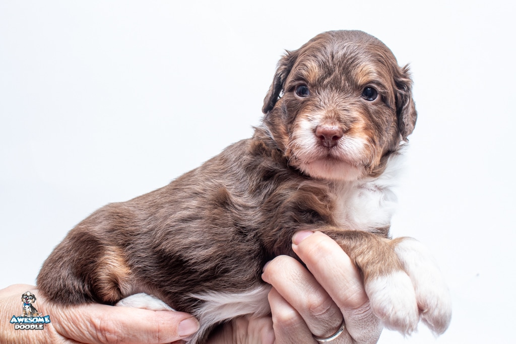 Kodi is a male Chocolate Tri-Color F1 AussieDoodle puppy.