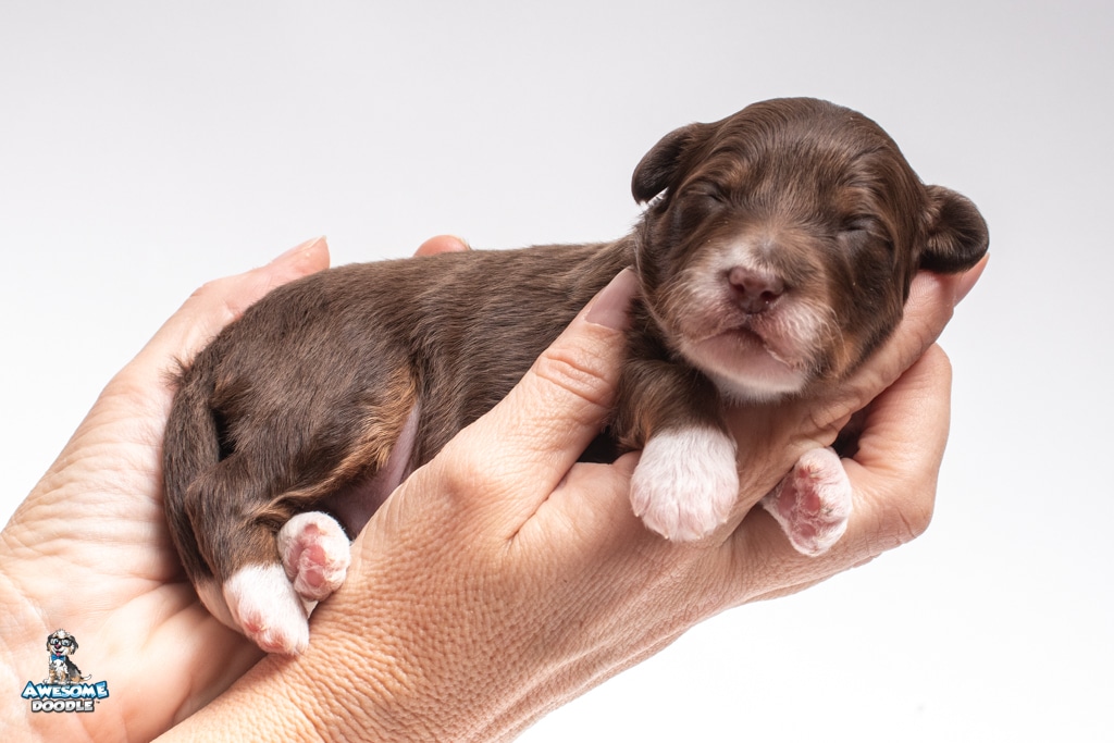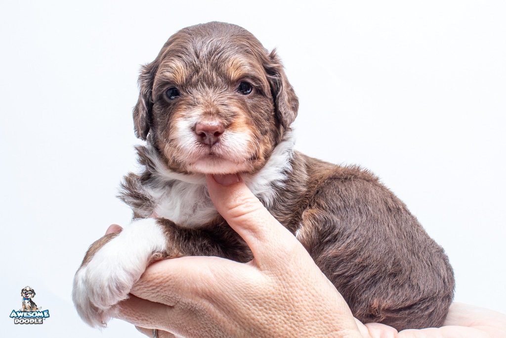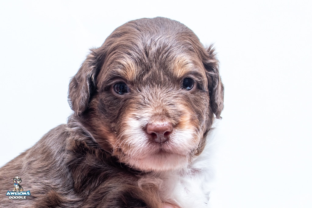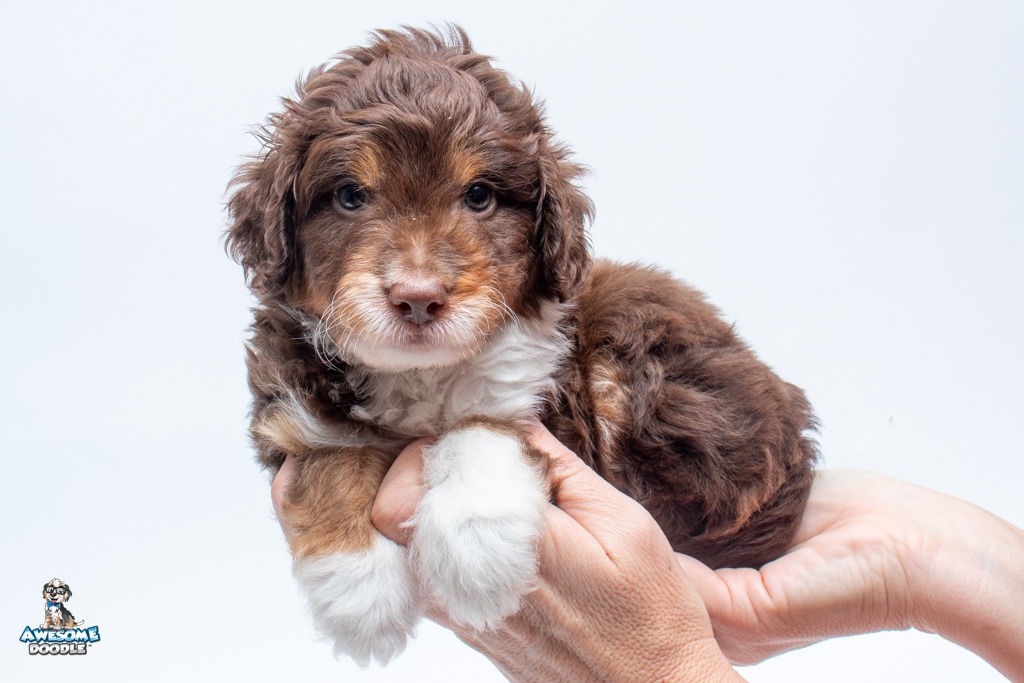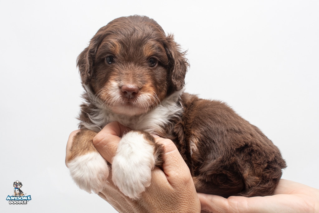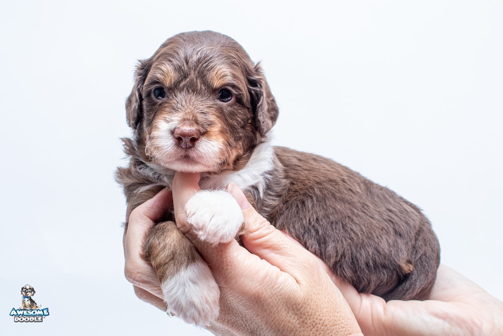 Kodi is a male Chocolate Tri-Color F1 AussieDoodle puppy.