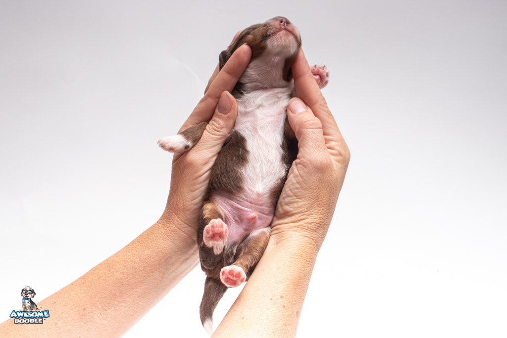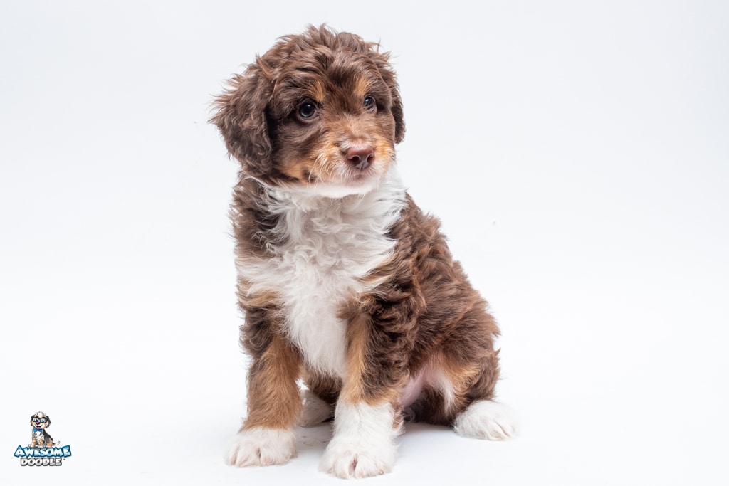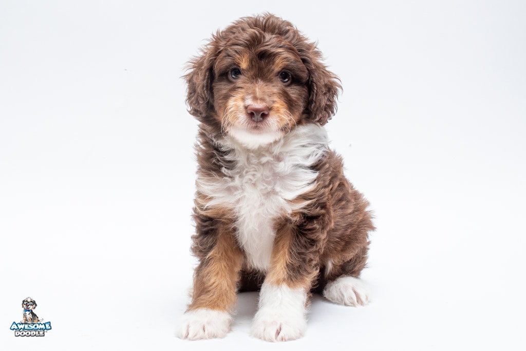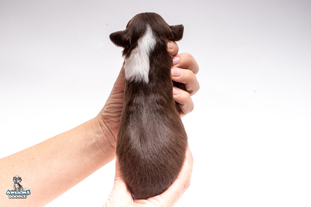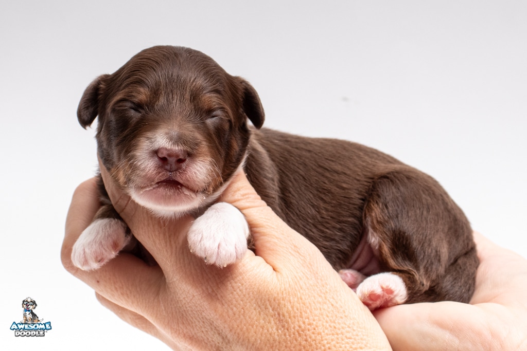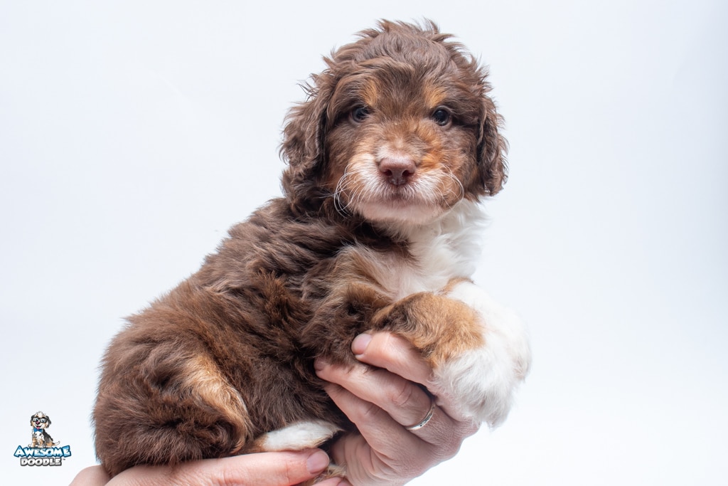 Kodi is a male Chocolate Tri-Color F1 AussieDoodle puppy.