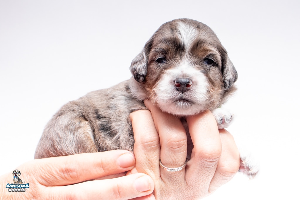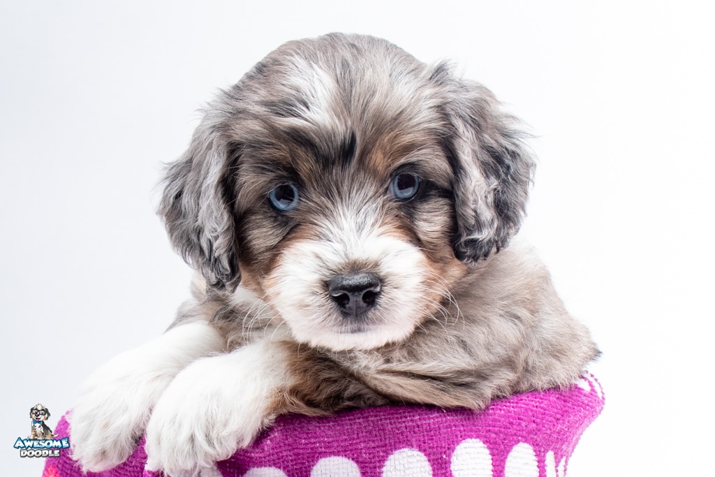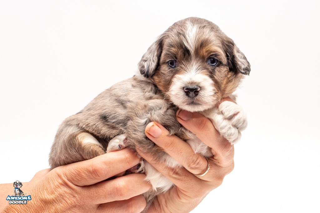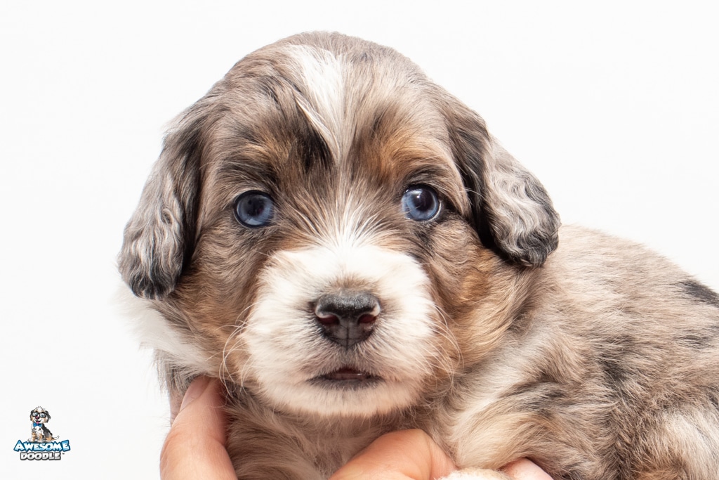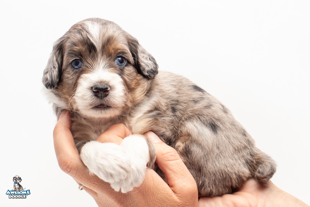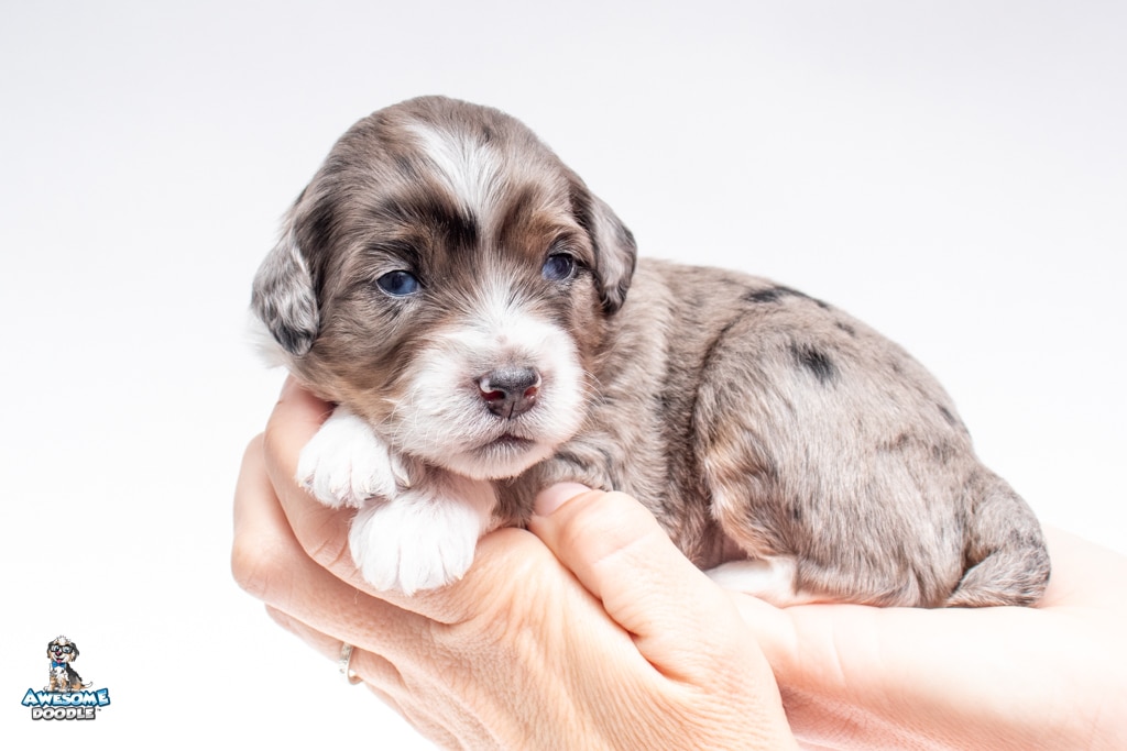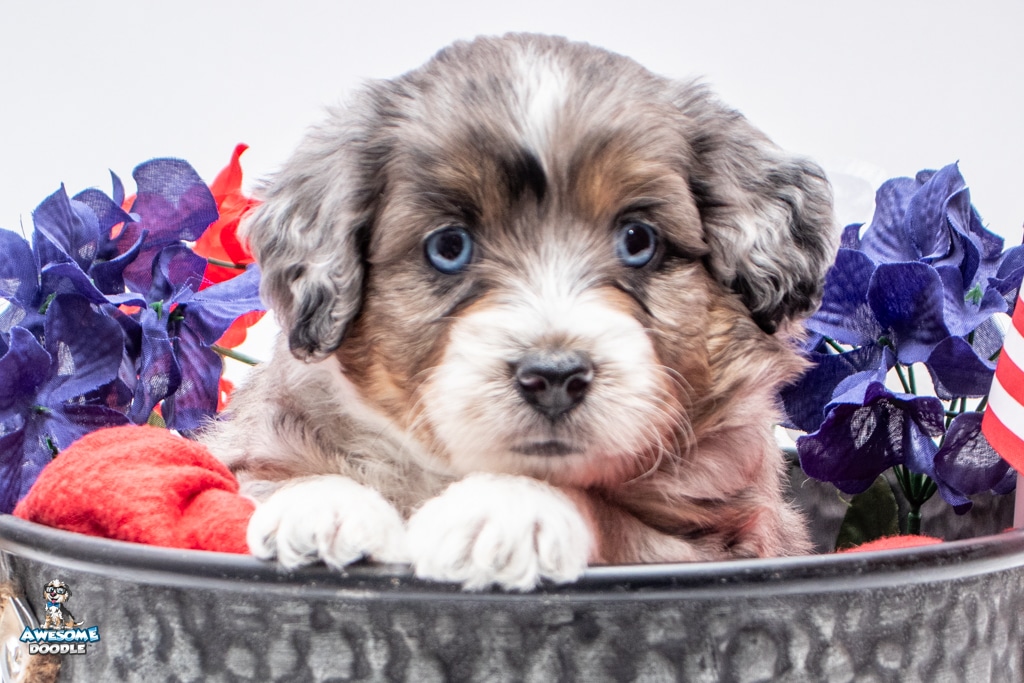 Mila is a female Blue Merle w/ White & Copper F1 AussieDoodle puppy.