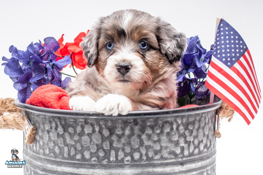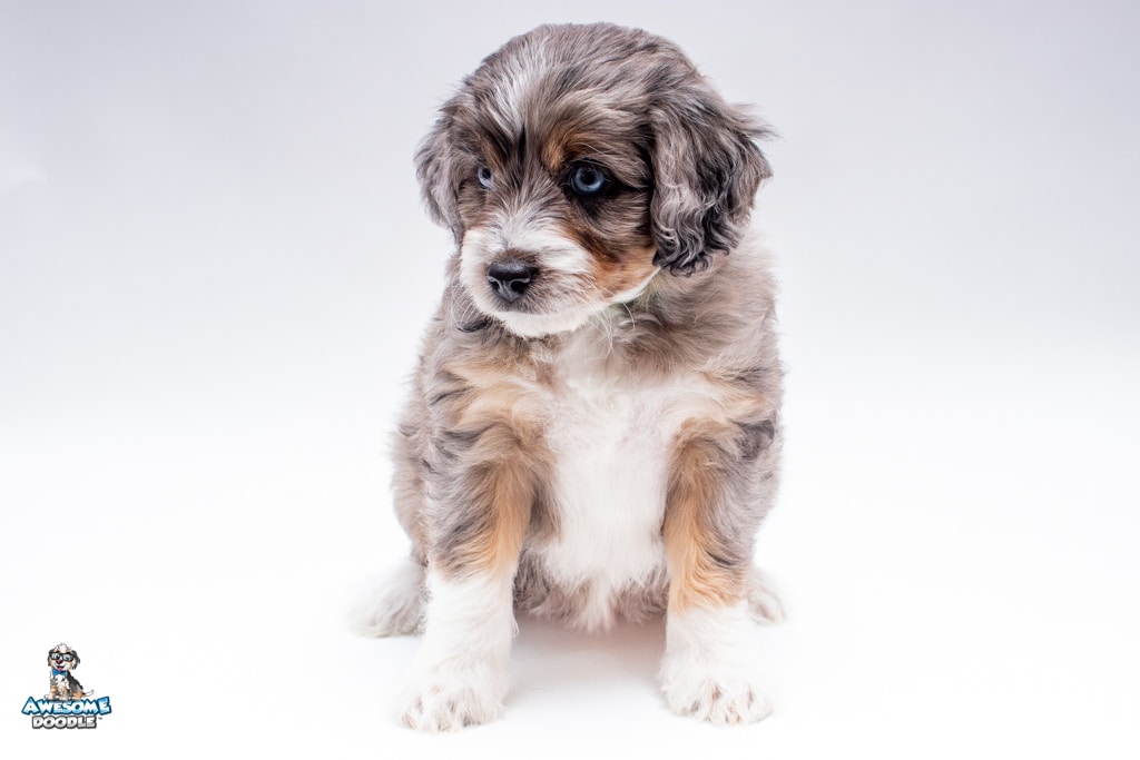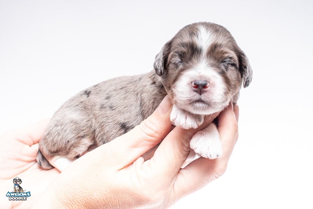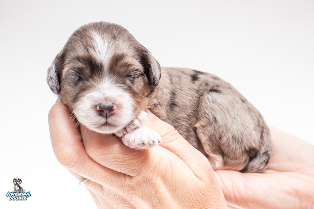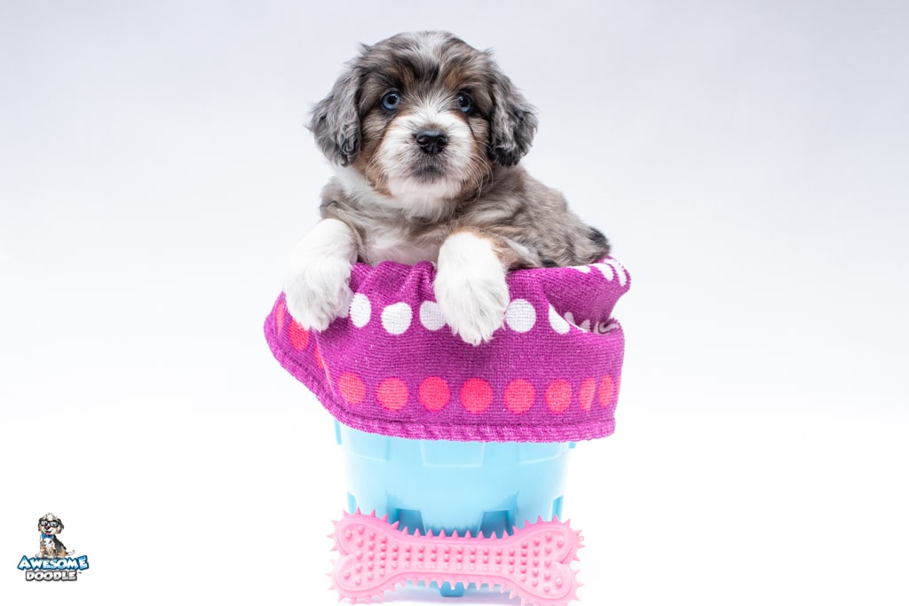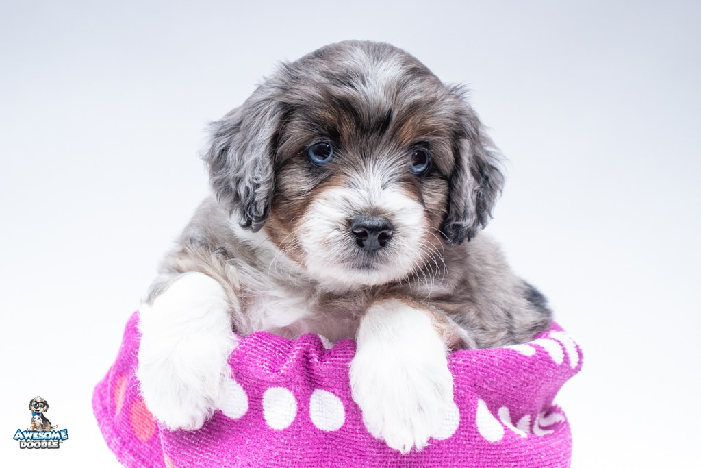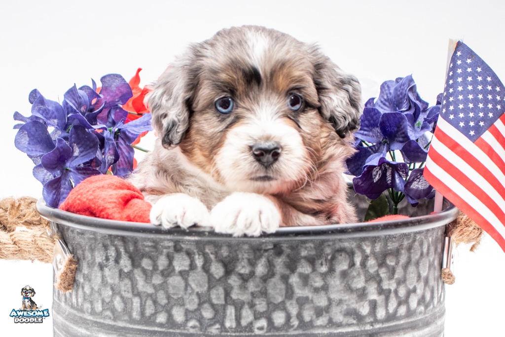 Mila is a female Blue Merle w/ White & Copper F1 AussieDoodle puppy.