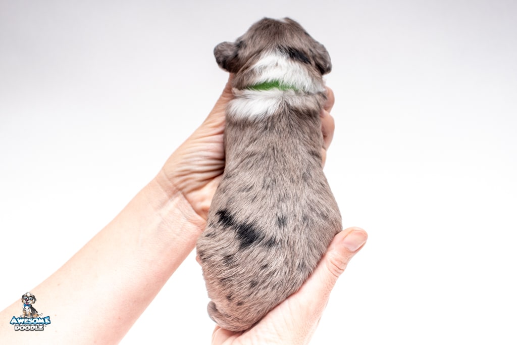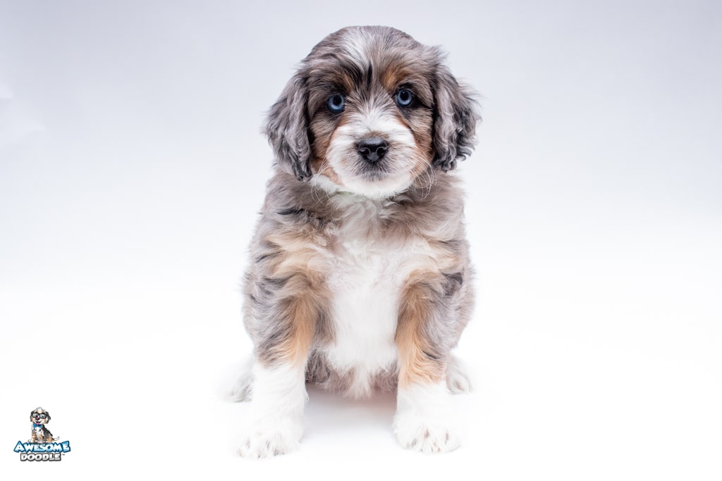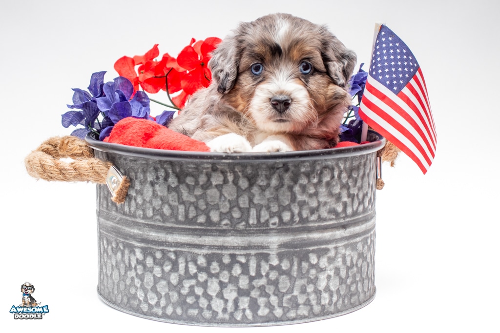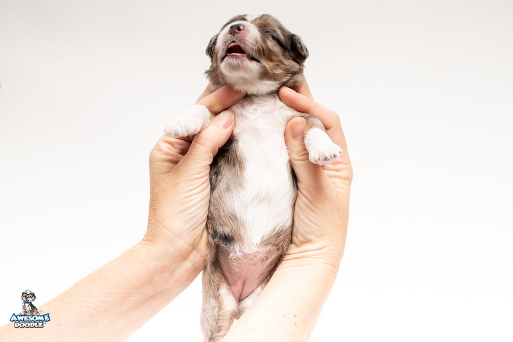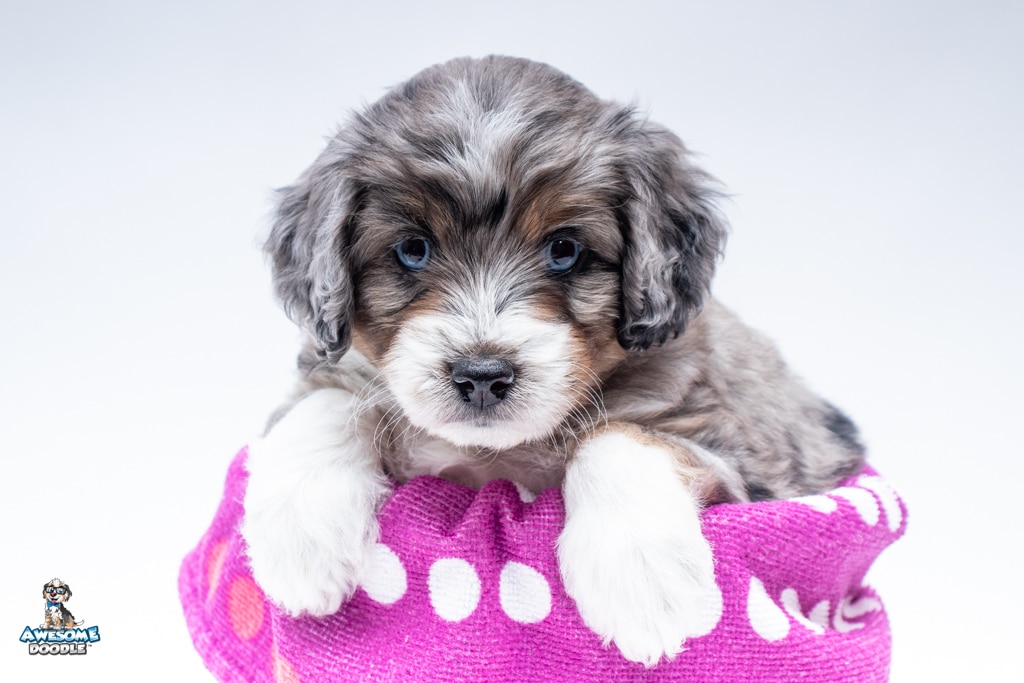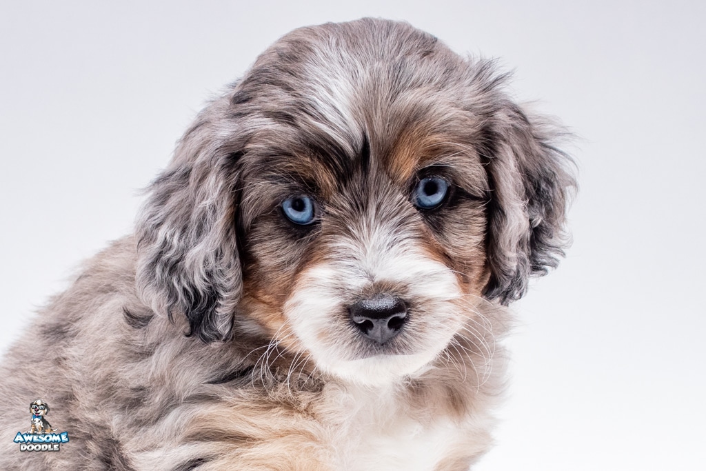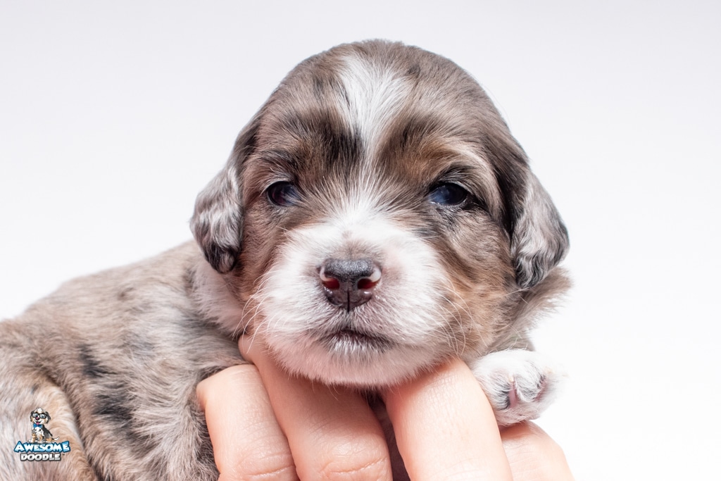 Mila is a female Blue Merle w/ White & Copper F1 AussieDoodle puppy.