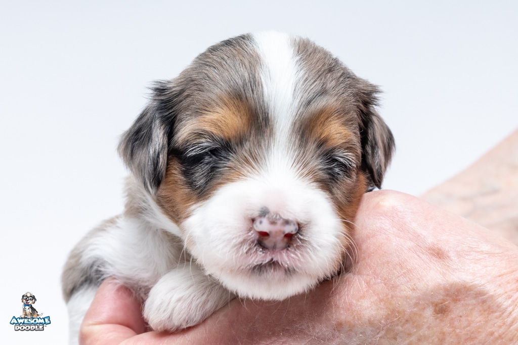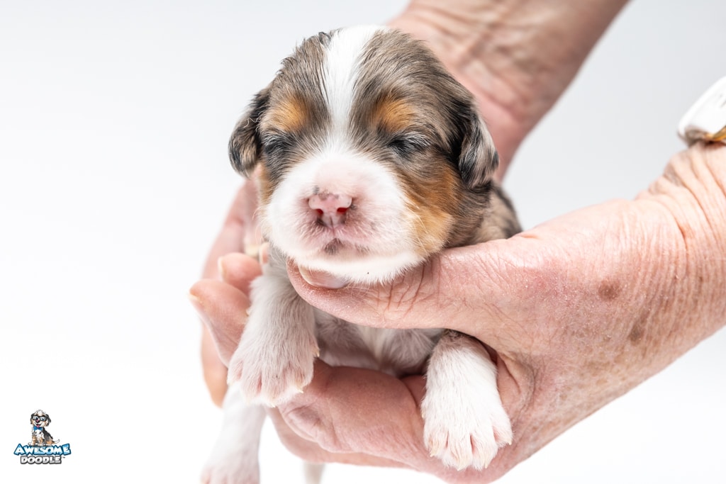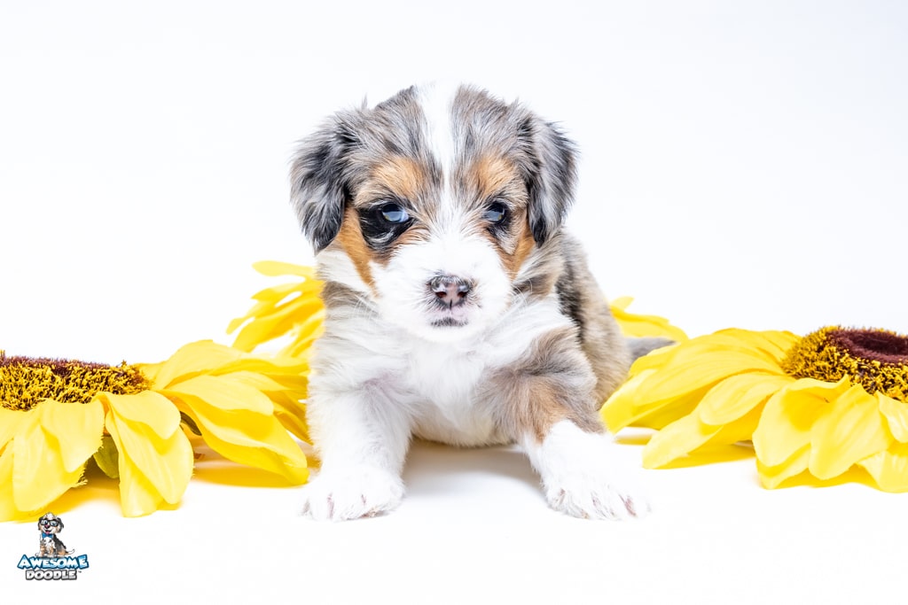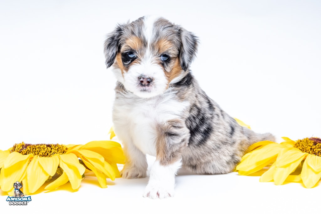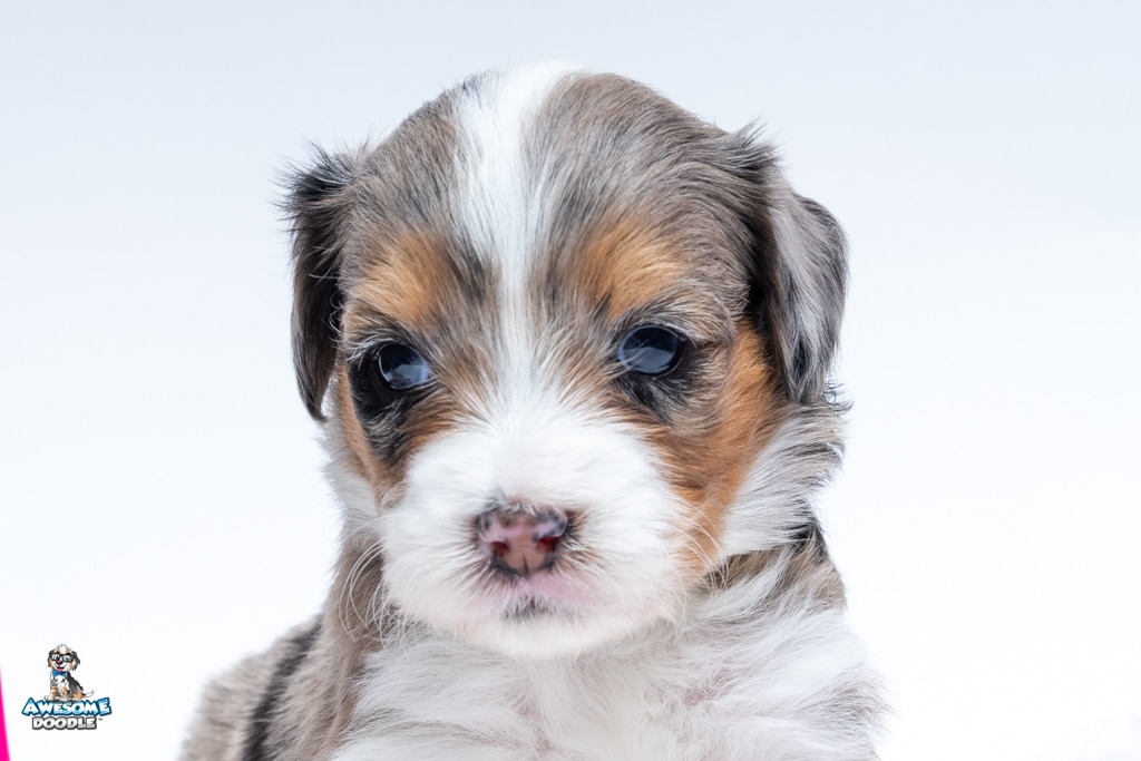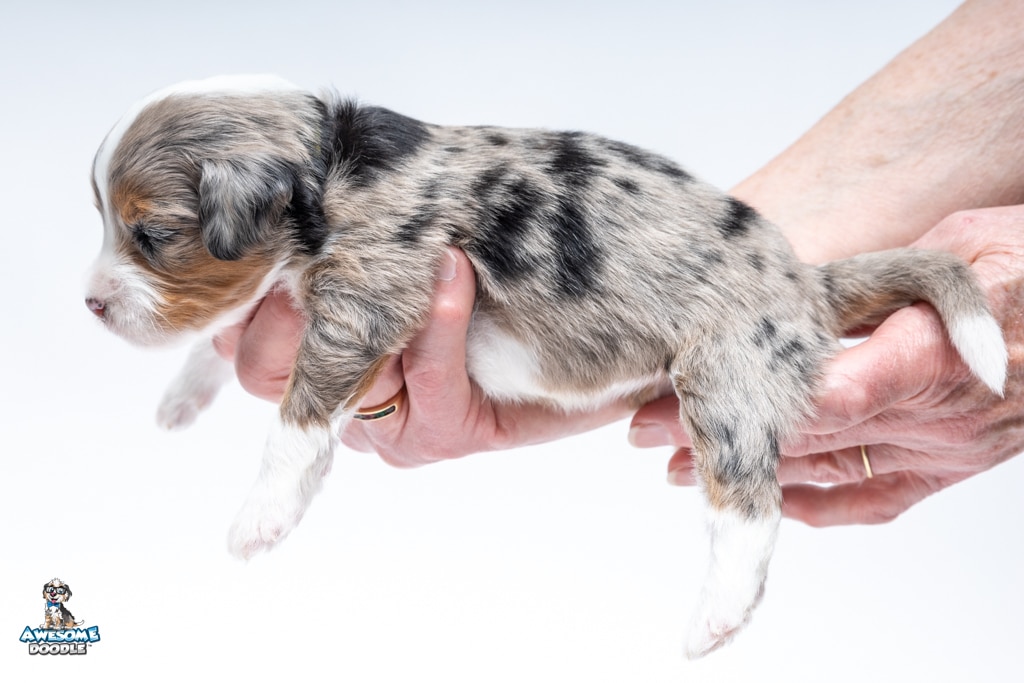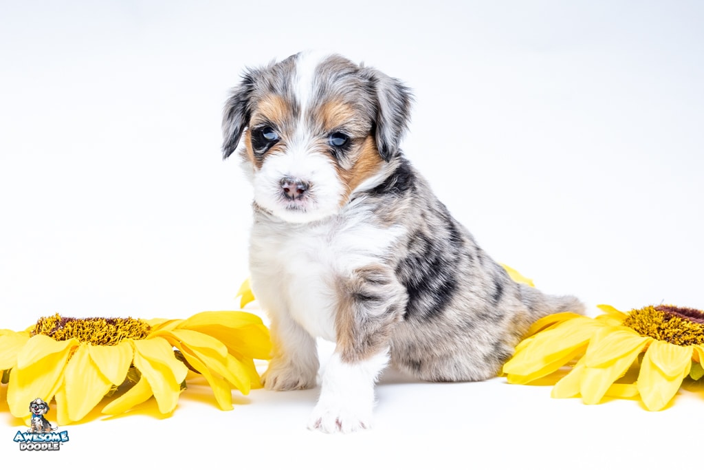 Harper is a female Blue Merle w/ White & Copper F1 AussieDoodle puppy.